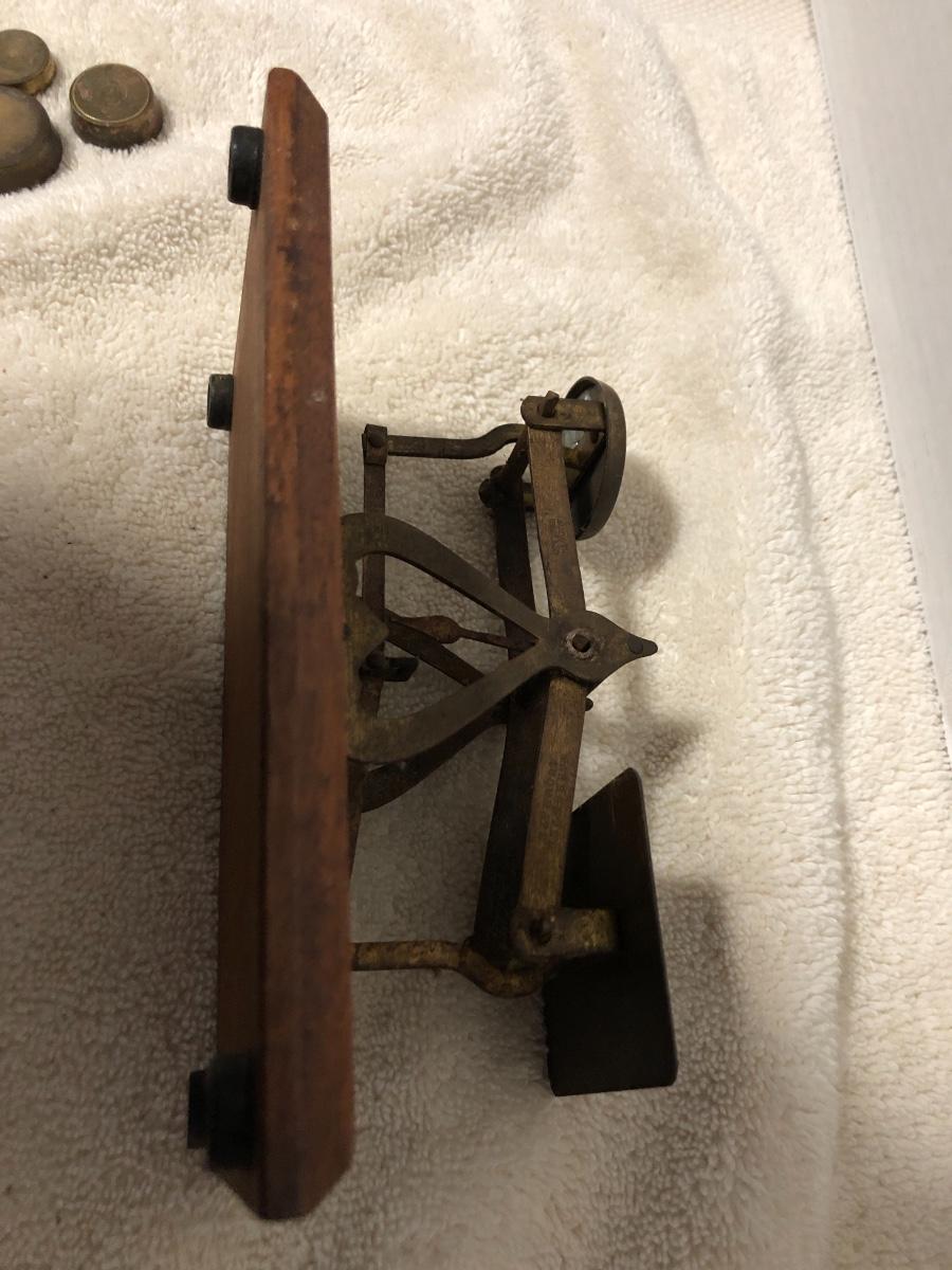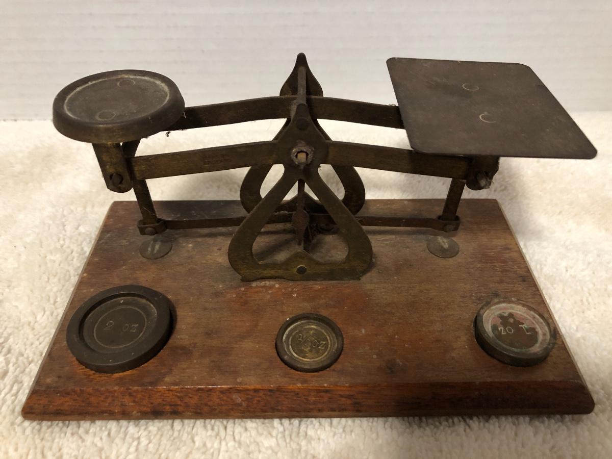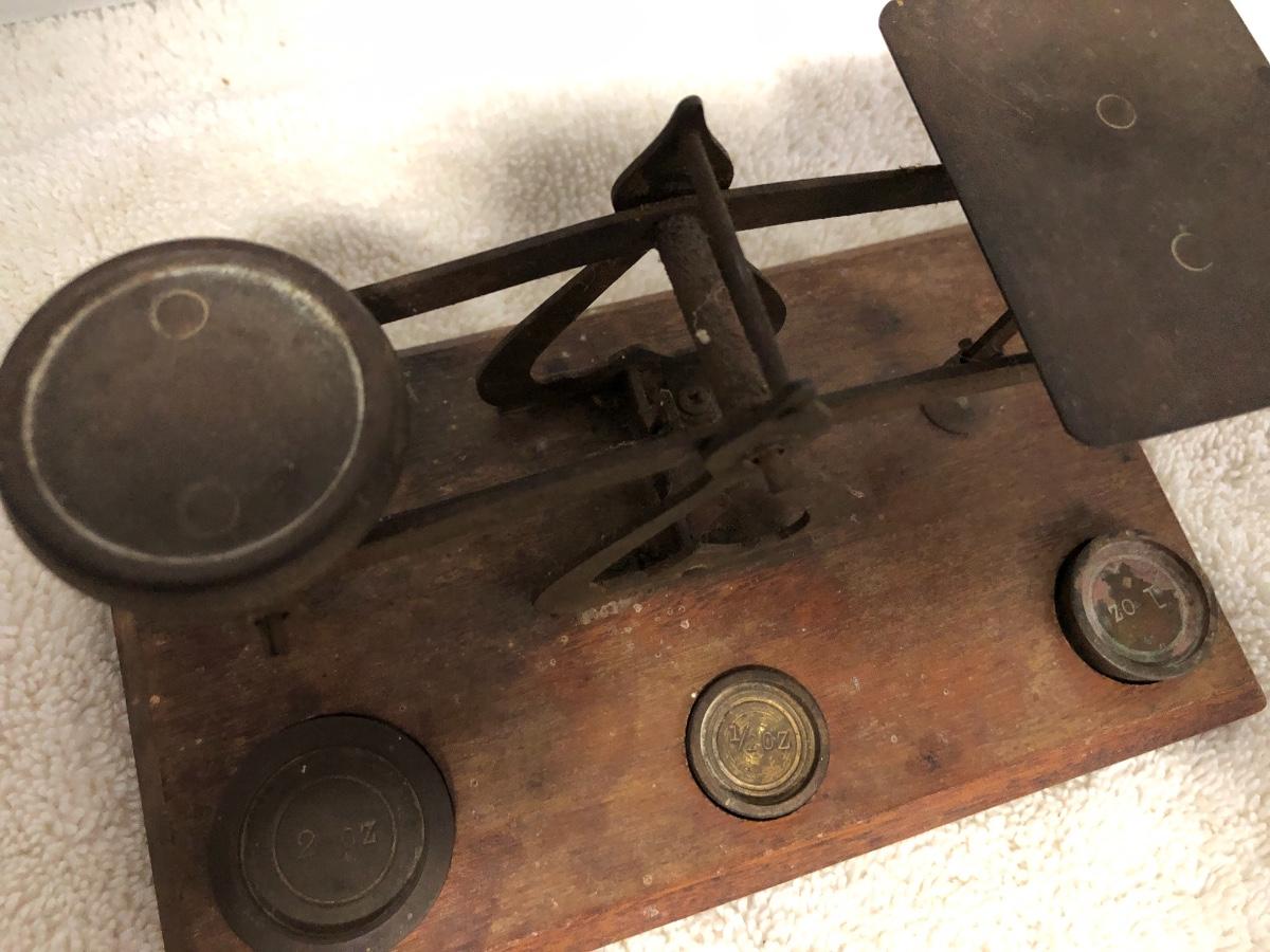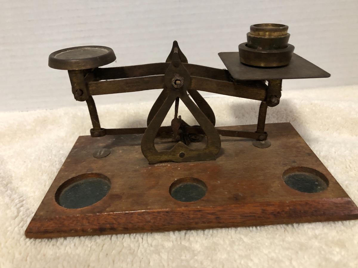 All items are sold as is, as found in the estate. Please see all photos for content, measurements and condition. This is made of wood and metal. The weights are: 1/2 oz, 1 oz, & 2 oz.