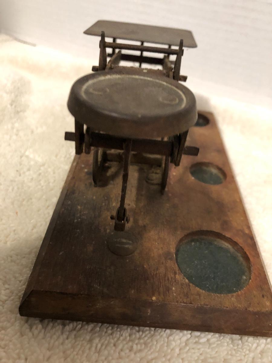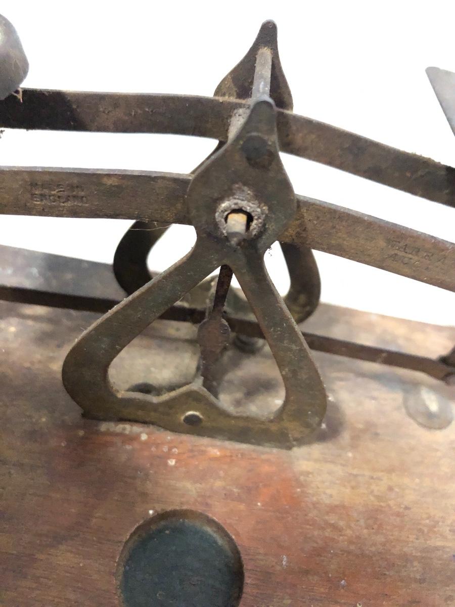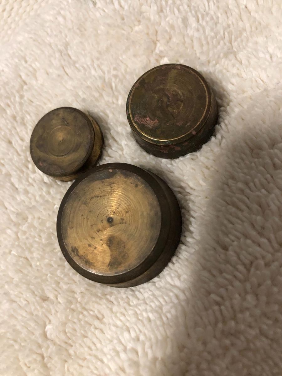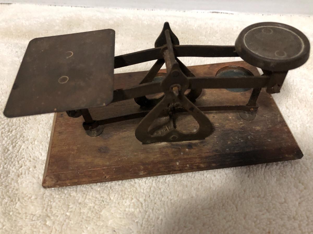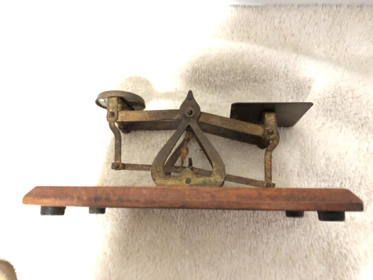 All items are sold as is, as found in the estate. Please see all photos for content, measurements and condition. This is made of wood and metal. The weights are: 1/2 oz, 1 oz, & 2 oz.