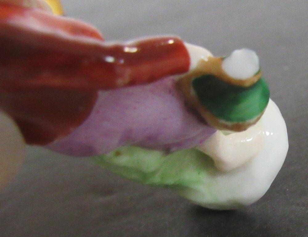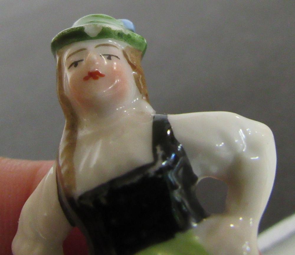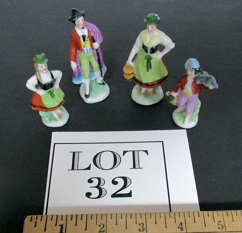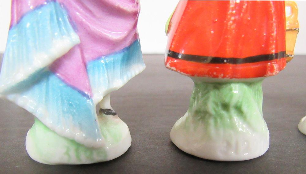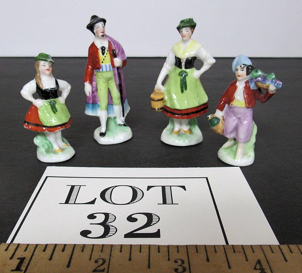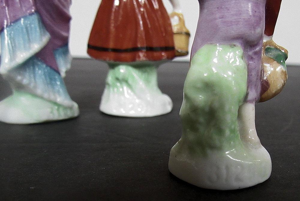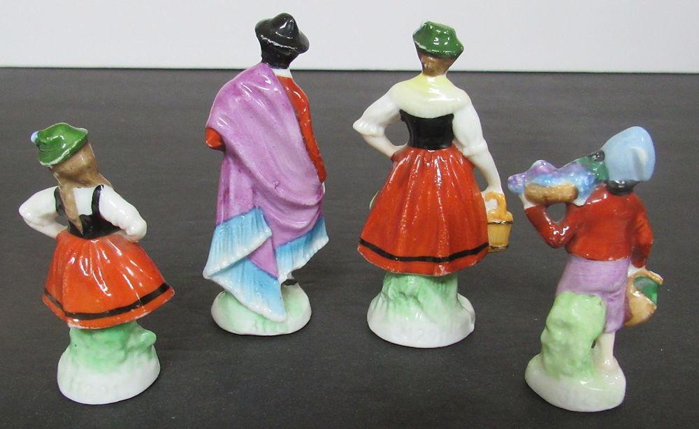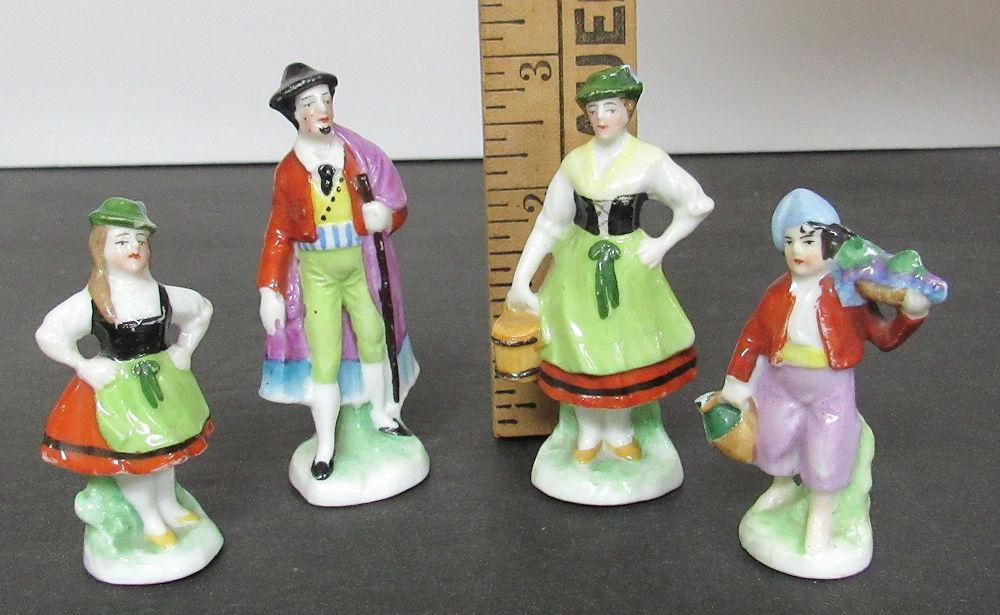 They are numbered, but I don't see country of origin, possible German. Miniature porcelain figurines. The man and woman are in good condition. The girl has a small chip on her at as seen in magnified photo. The boy has a break at the end what he is holding with the arm down. Shipping is available at shipping cost plus $5.00 handling fee on up to 8 lots, $10.00 handling fee on 9 or more lots or two boxes.
