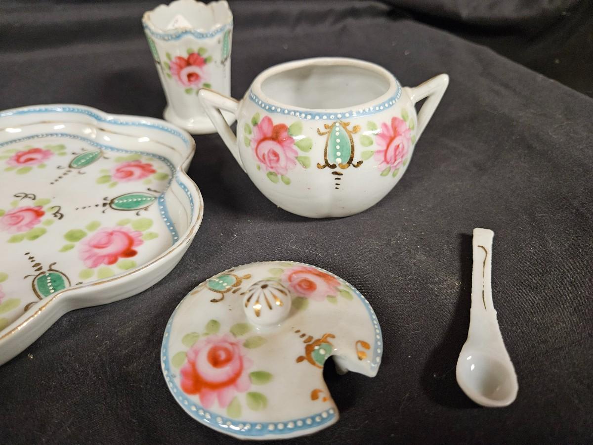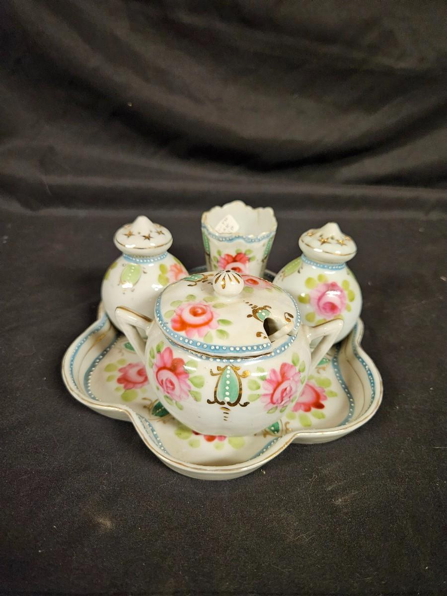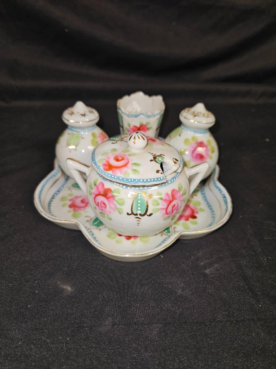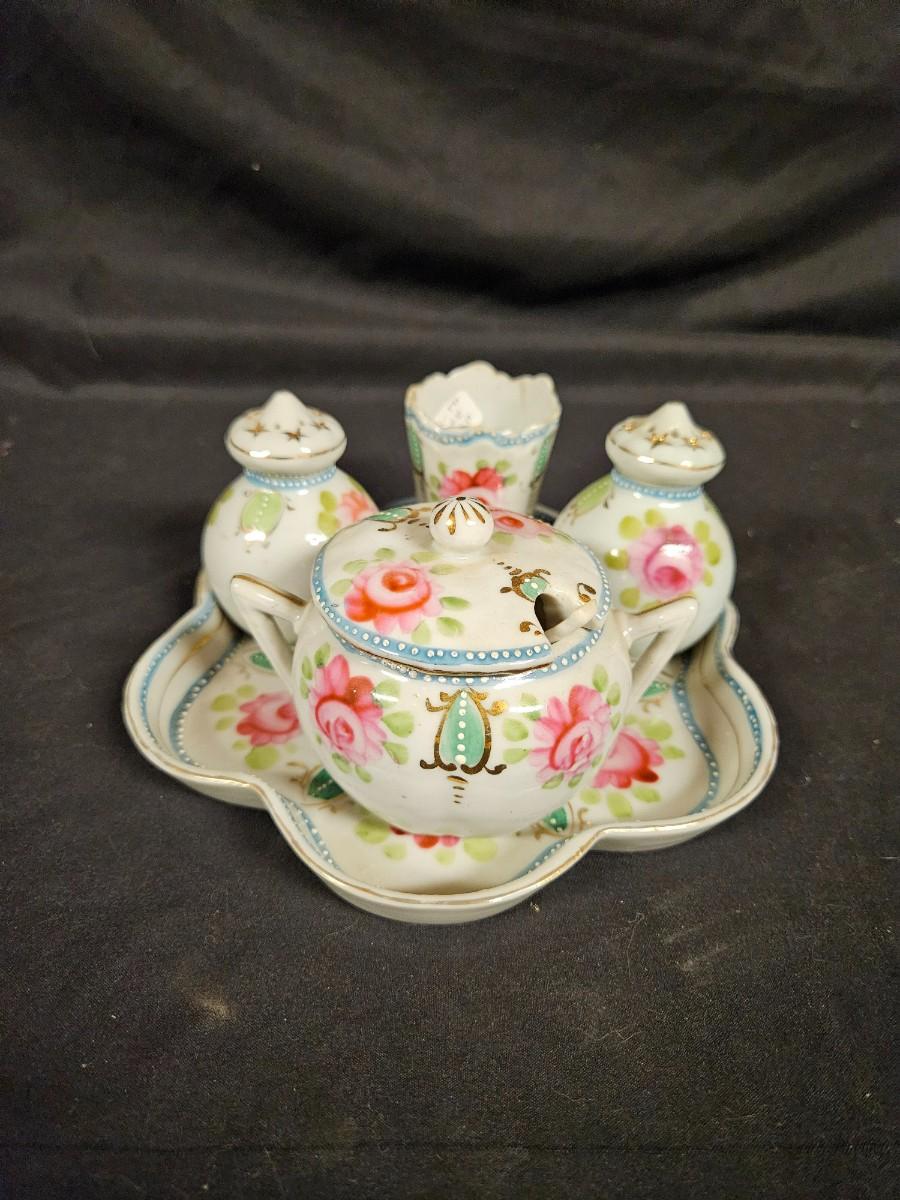 Antique Miniature Porcelain Condiment Set Includes Salt, Pepper, Sugar and Toothpick Holder with Tray and Spoon