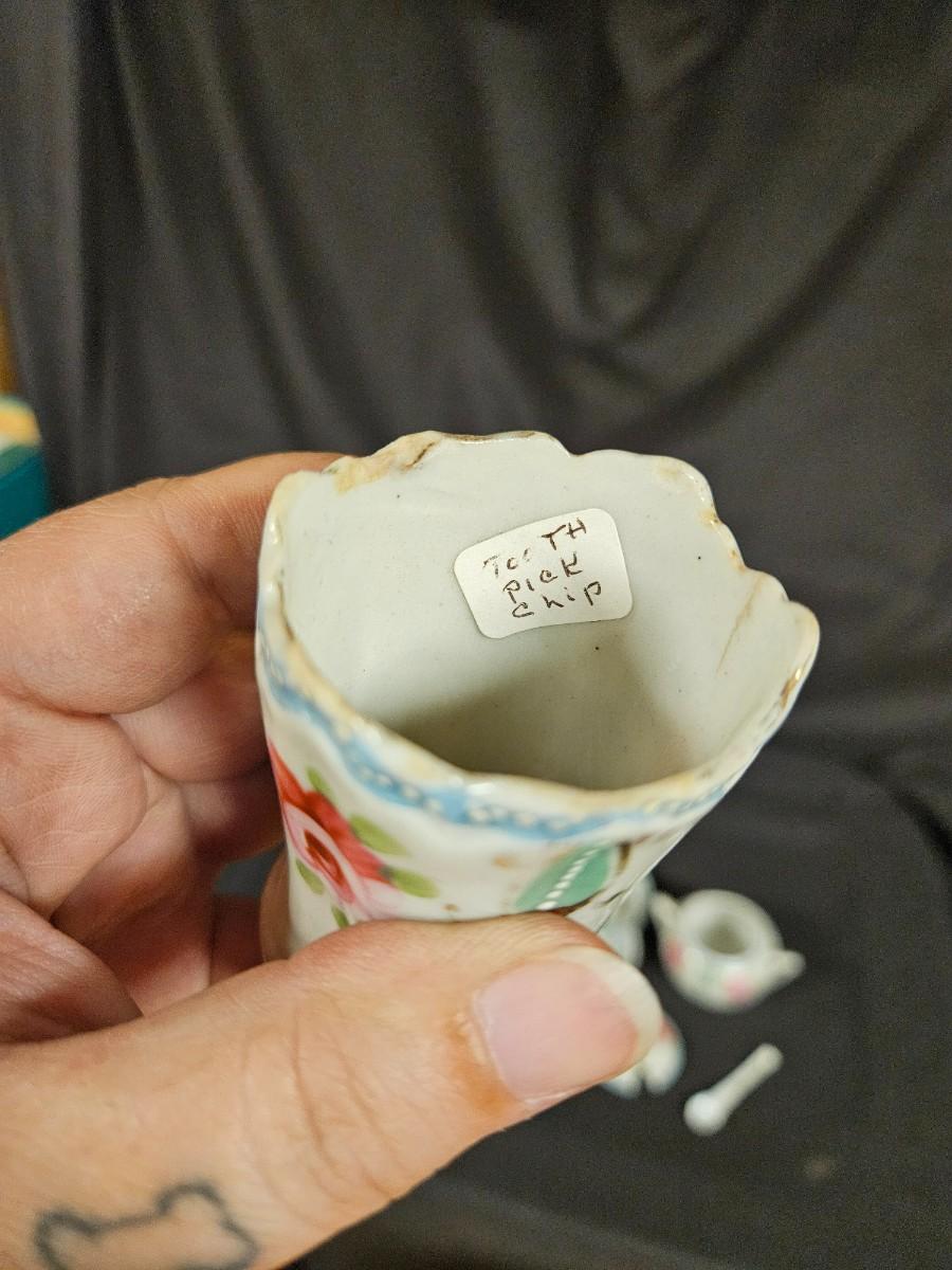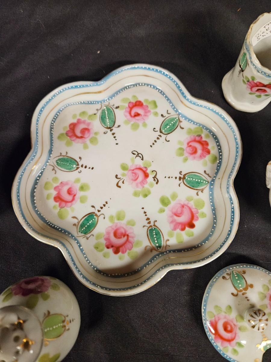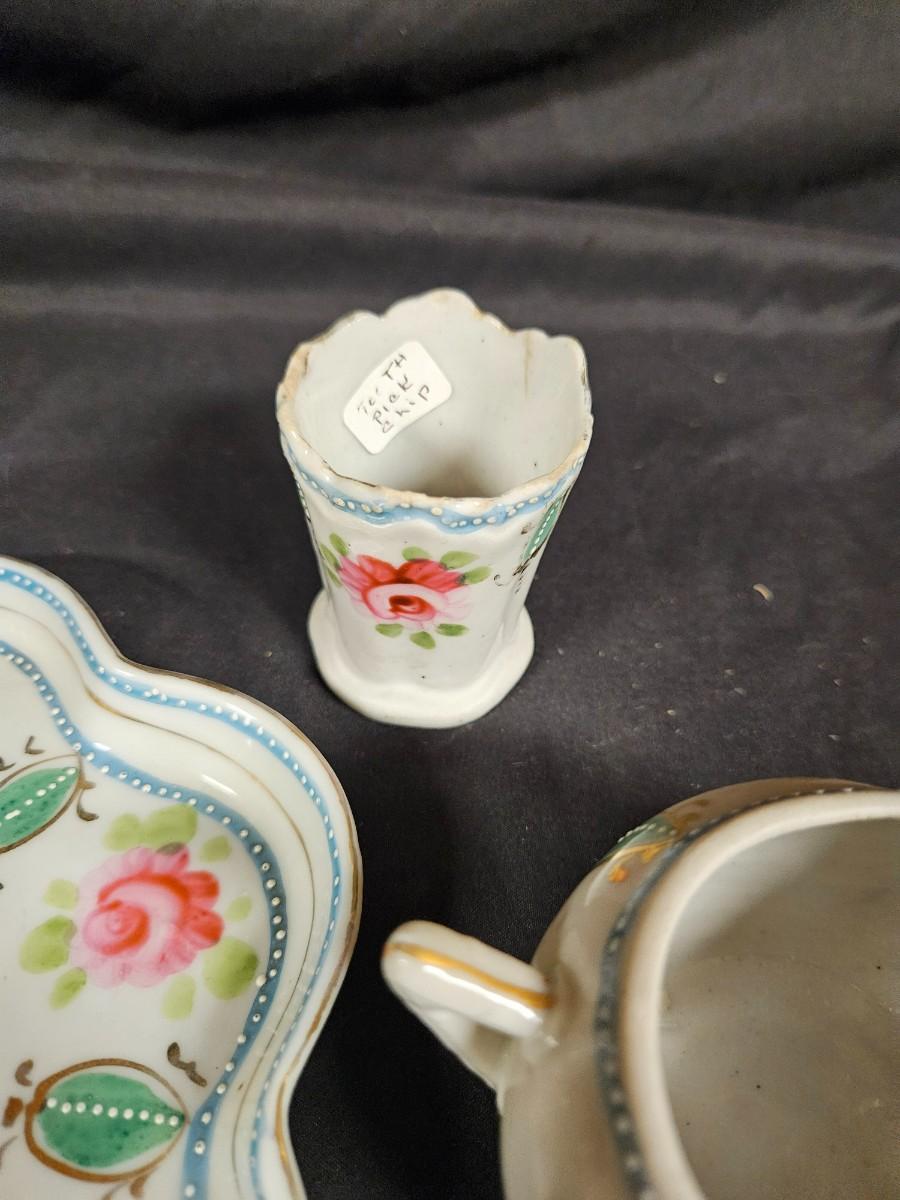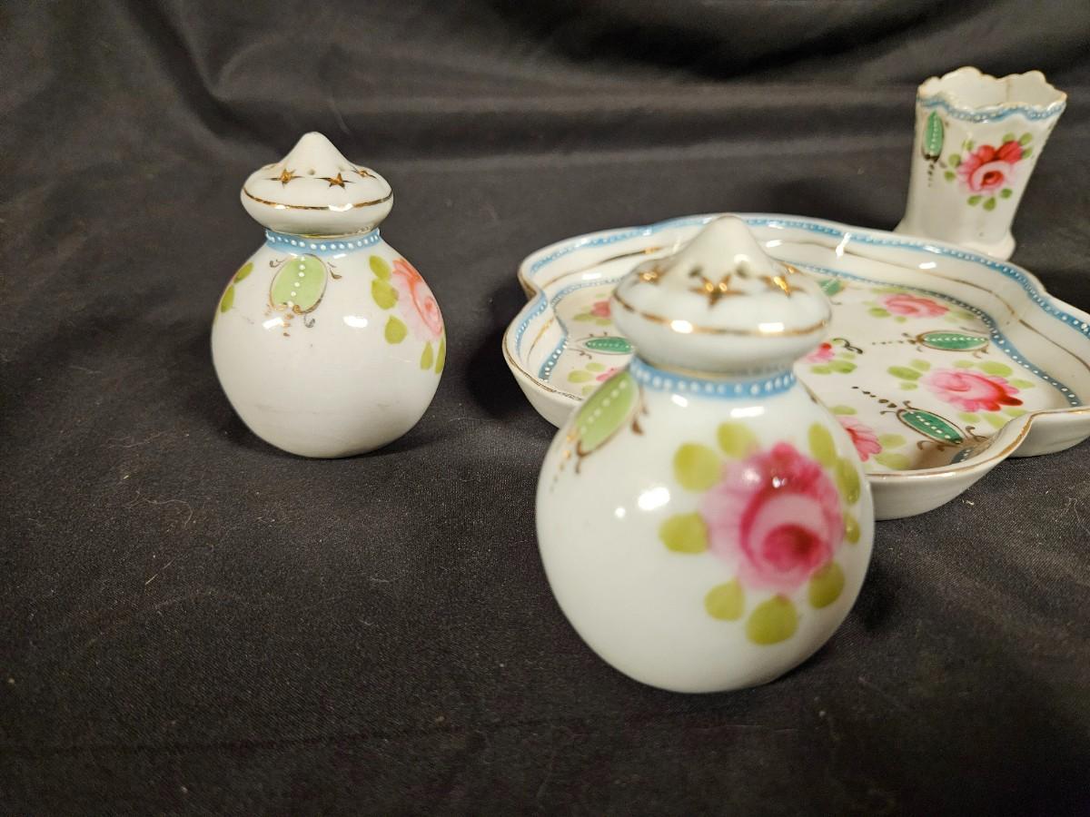 Antique Miniature Porcelain Condiment Set Includes Salt, Pepper, Sugar and Toothpick Holder with Tray and Spoon