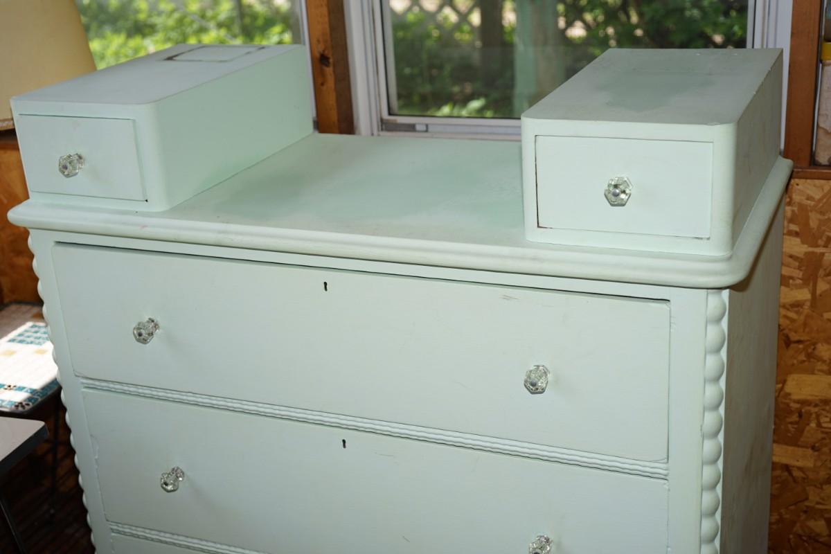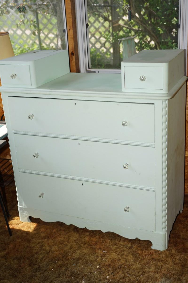 ANTIQUE MINT GREEN THREE DRAWER BUREAU WITH HANKIE BOXES