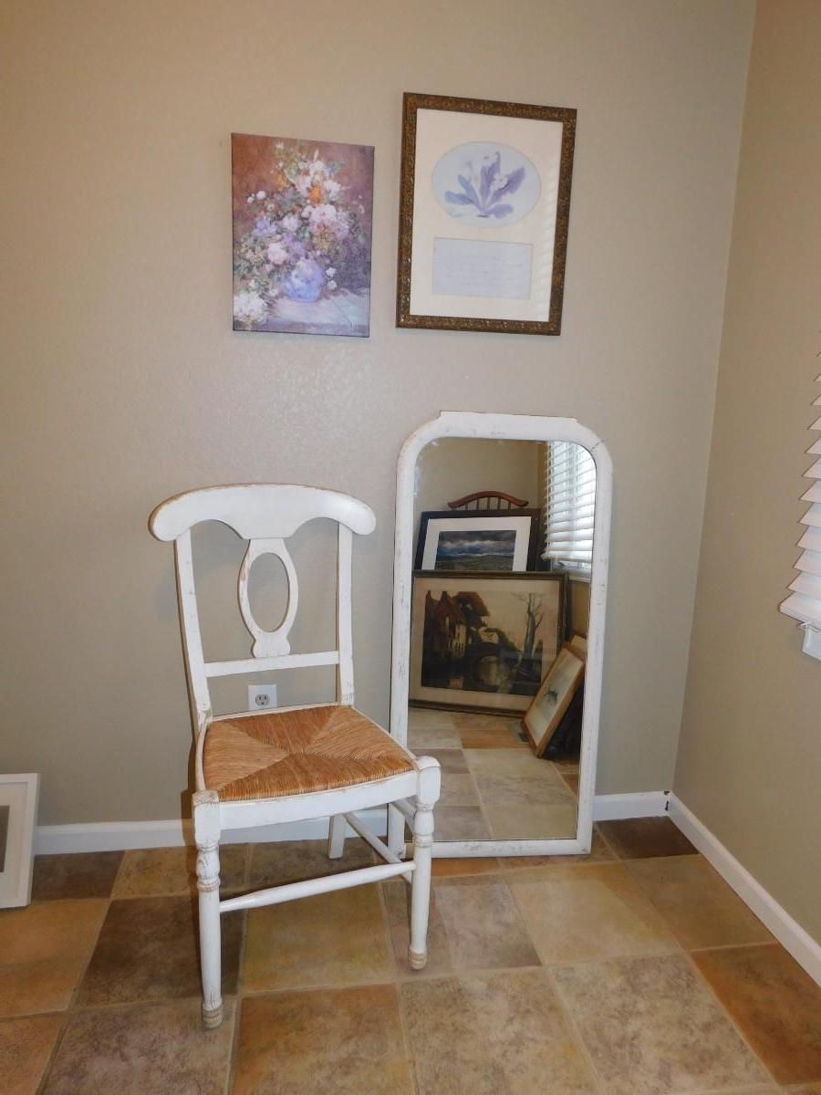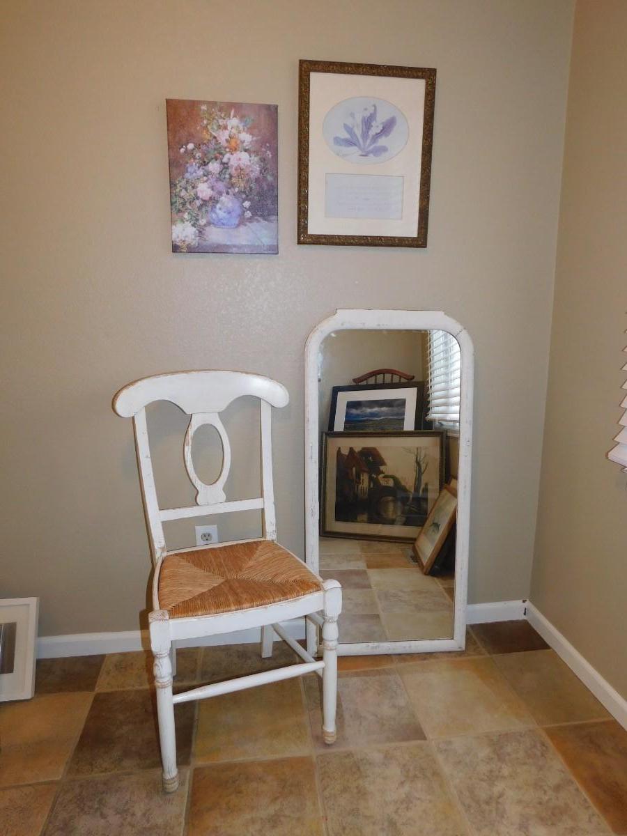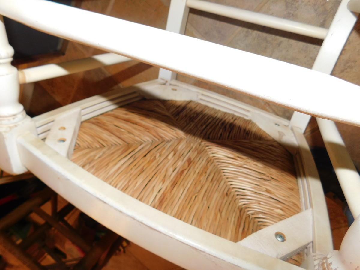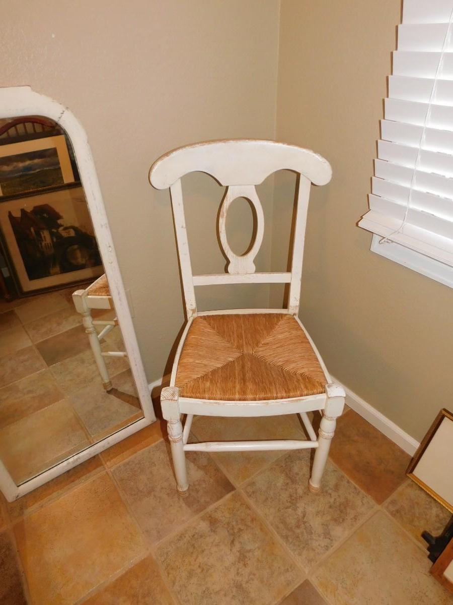 ANTIQUE MIRROR, CHAIR WITH A RUSH SEAT, AND TWO PICTURES