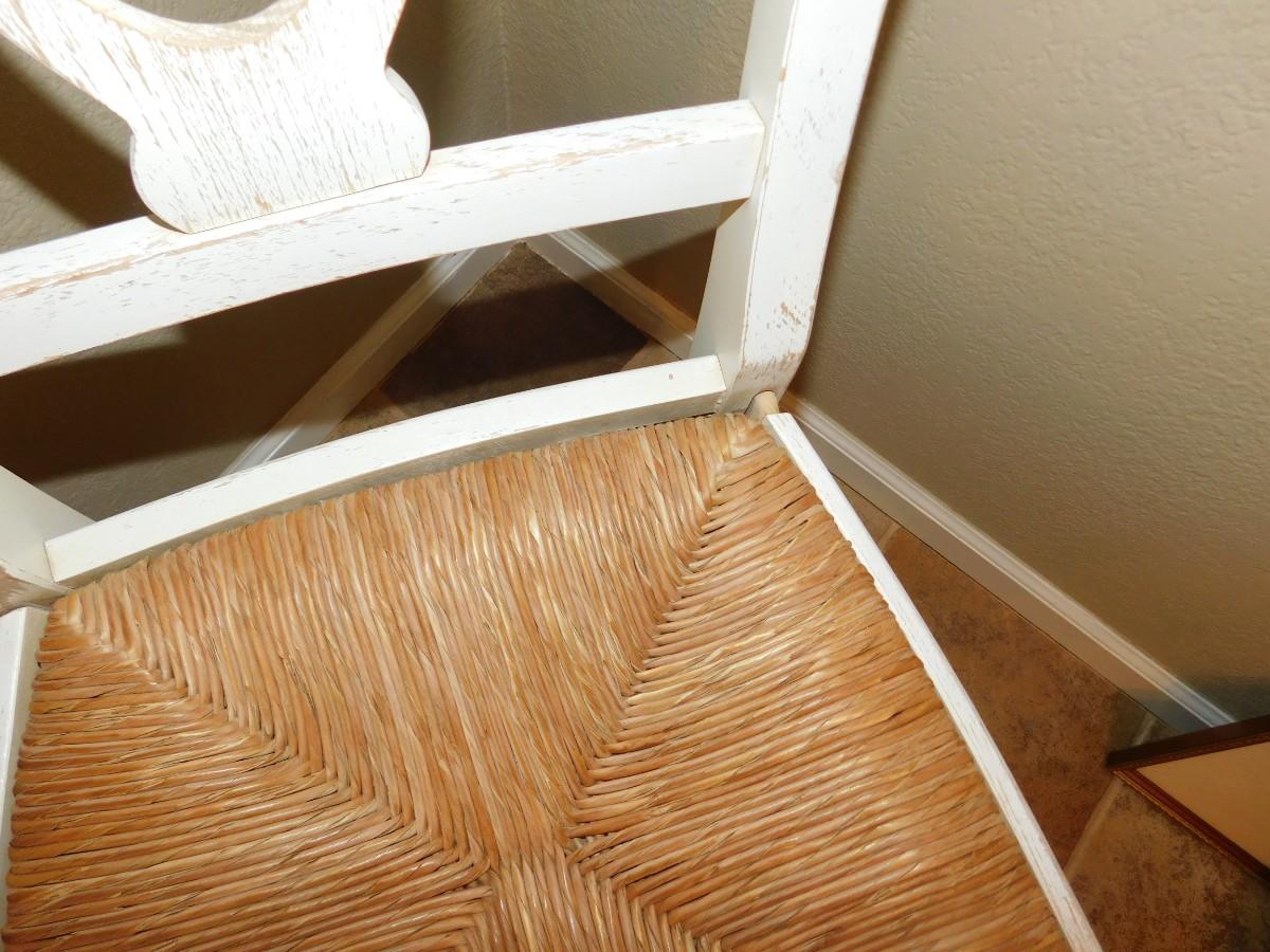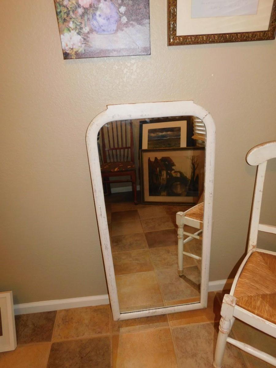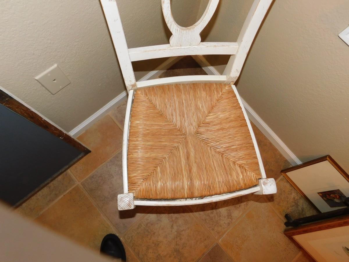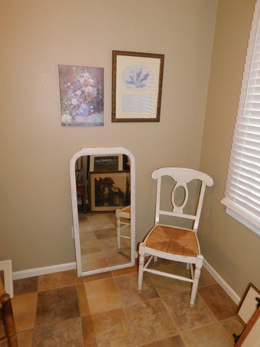 ANTIQUE MIRROR, CHAIR WITH A RUSH SEAT, AND TWO PICTURES
