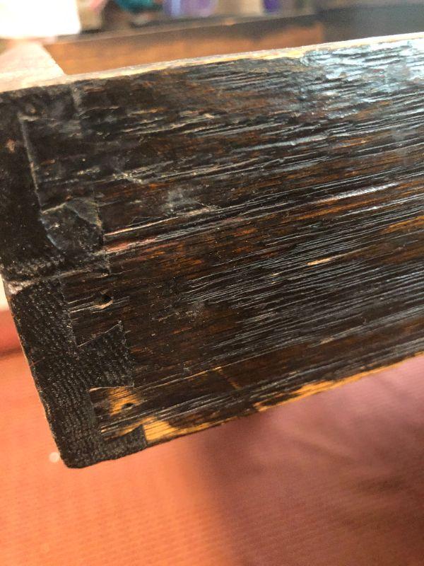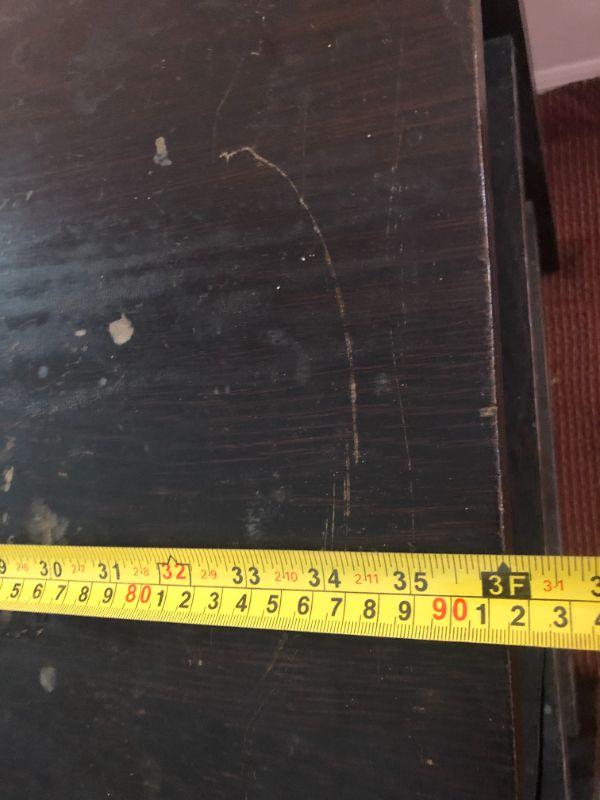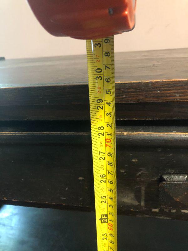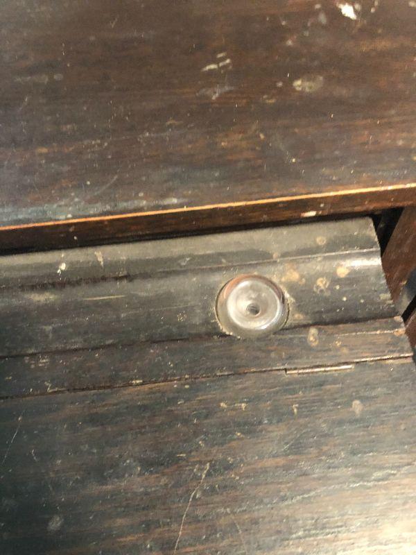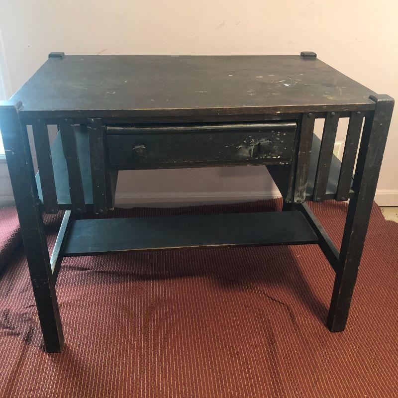 Please see all pictures. Desk has been painted and shows signs of use. A few minor repairs are needed but a great piece to strip and display. Ink well is intact
