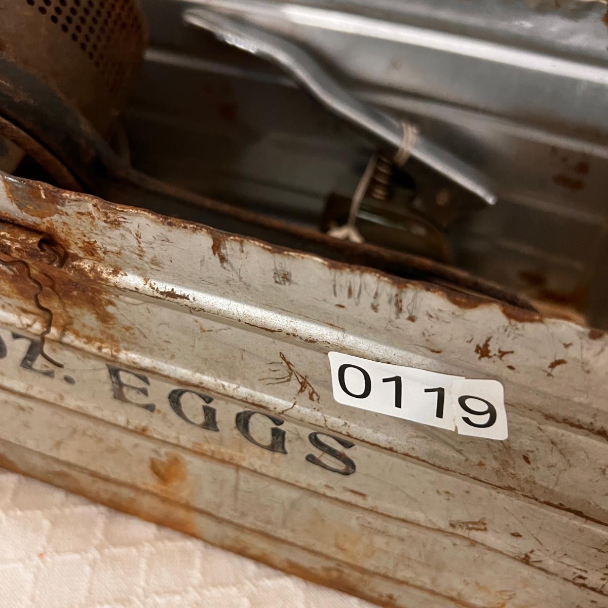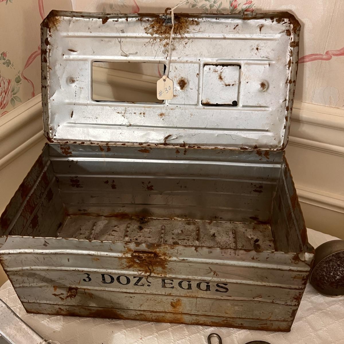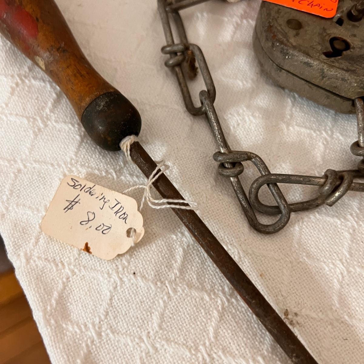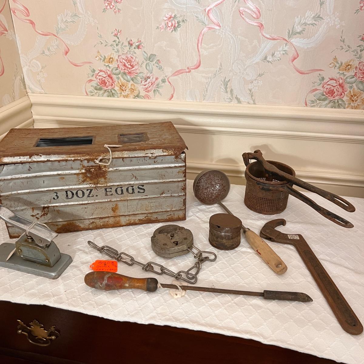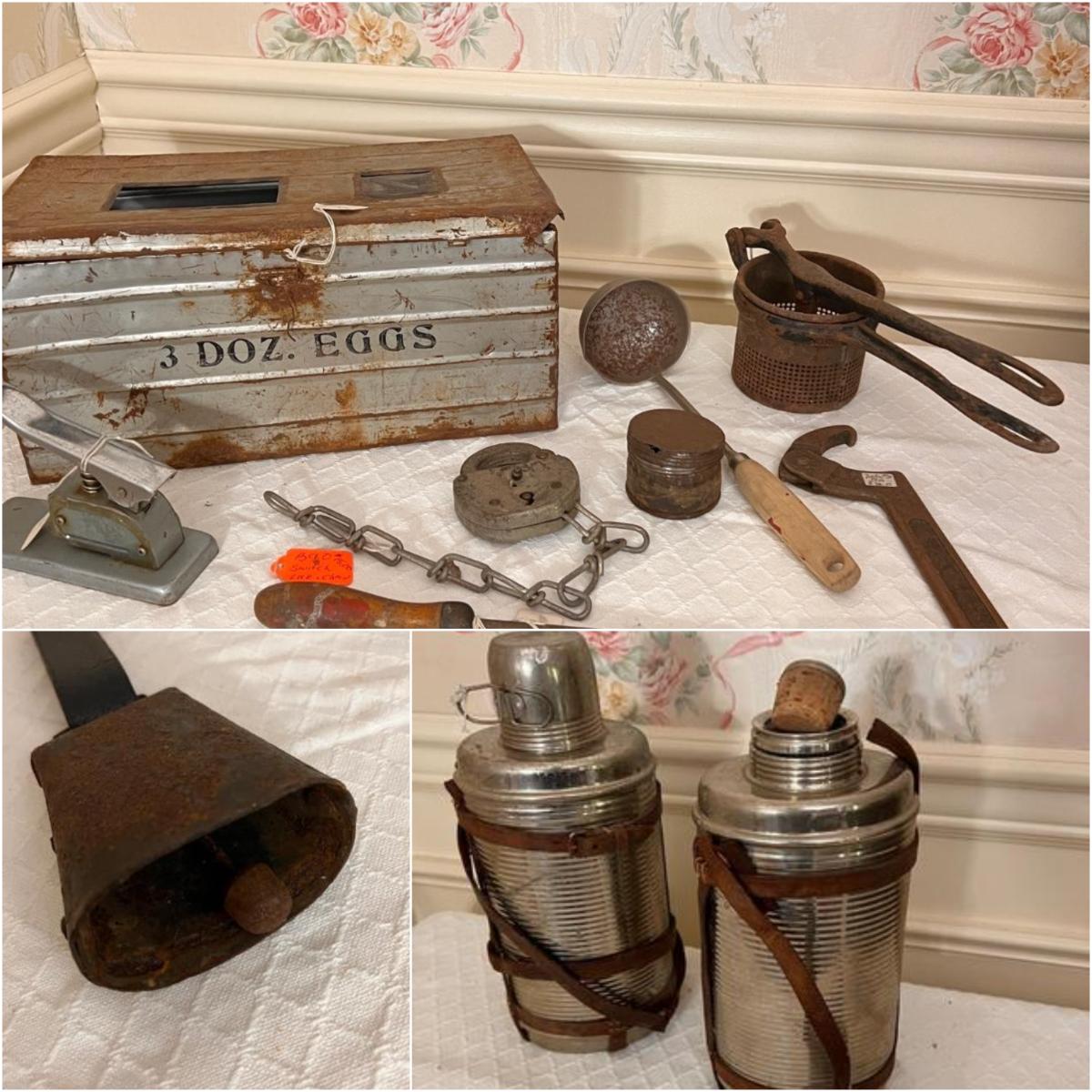 Pieces have their original antique store tags on them. Metal egg box, 1914 tool, switch lock and chain, 2 Gloria thermoses, cow bell and more. See all pics for condition.