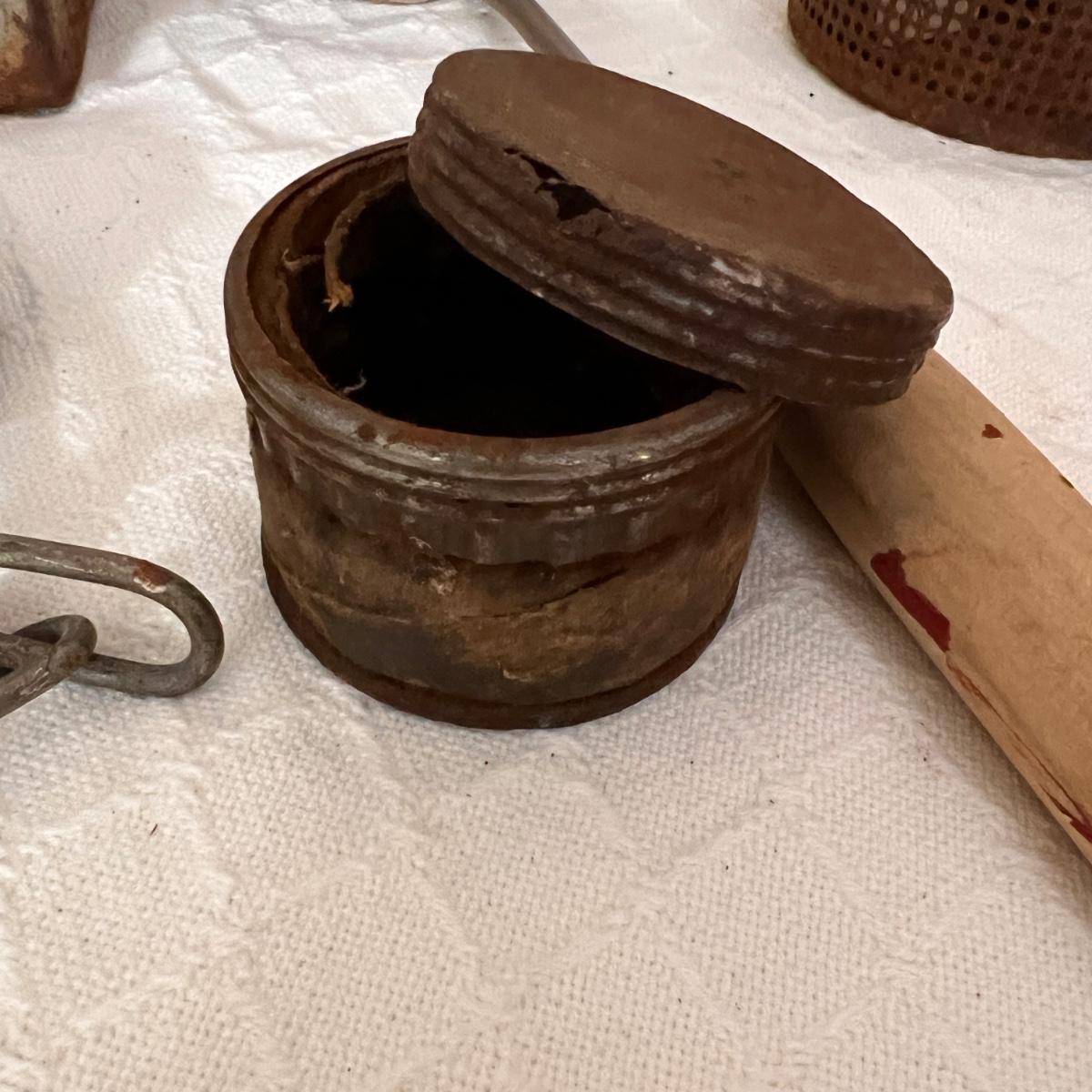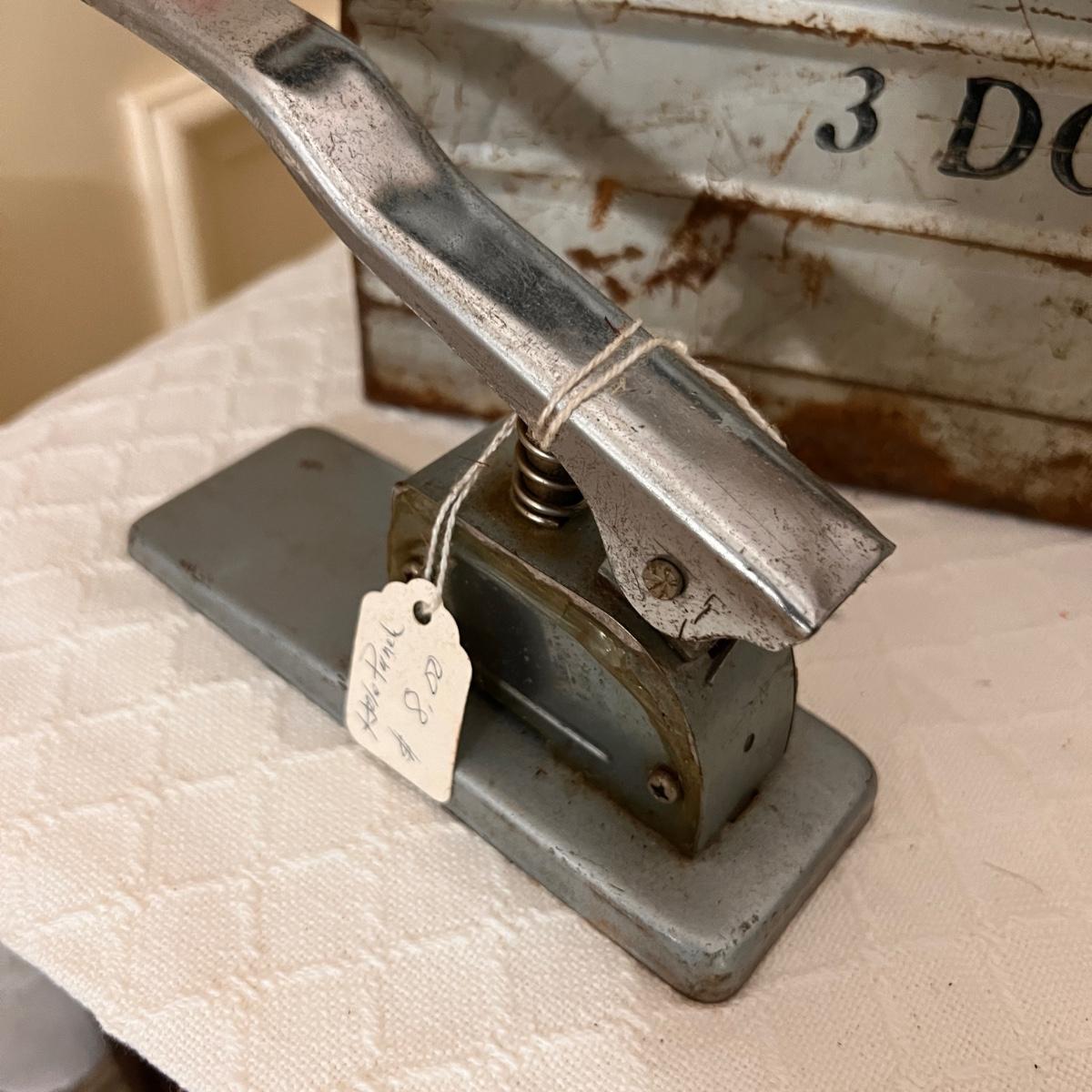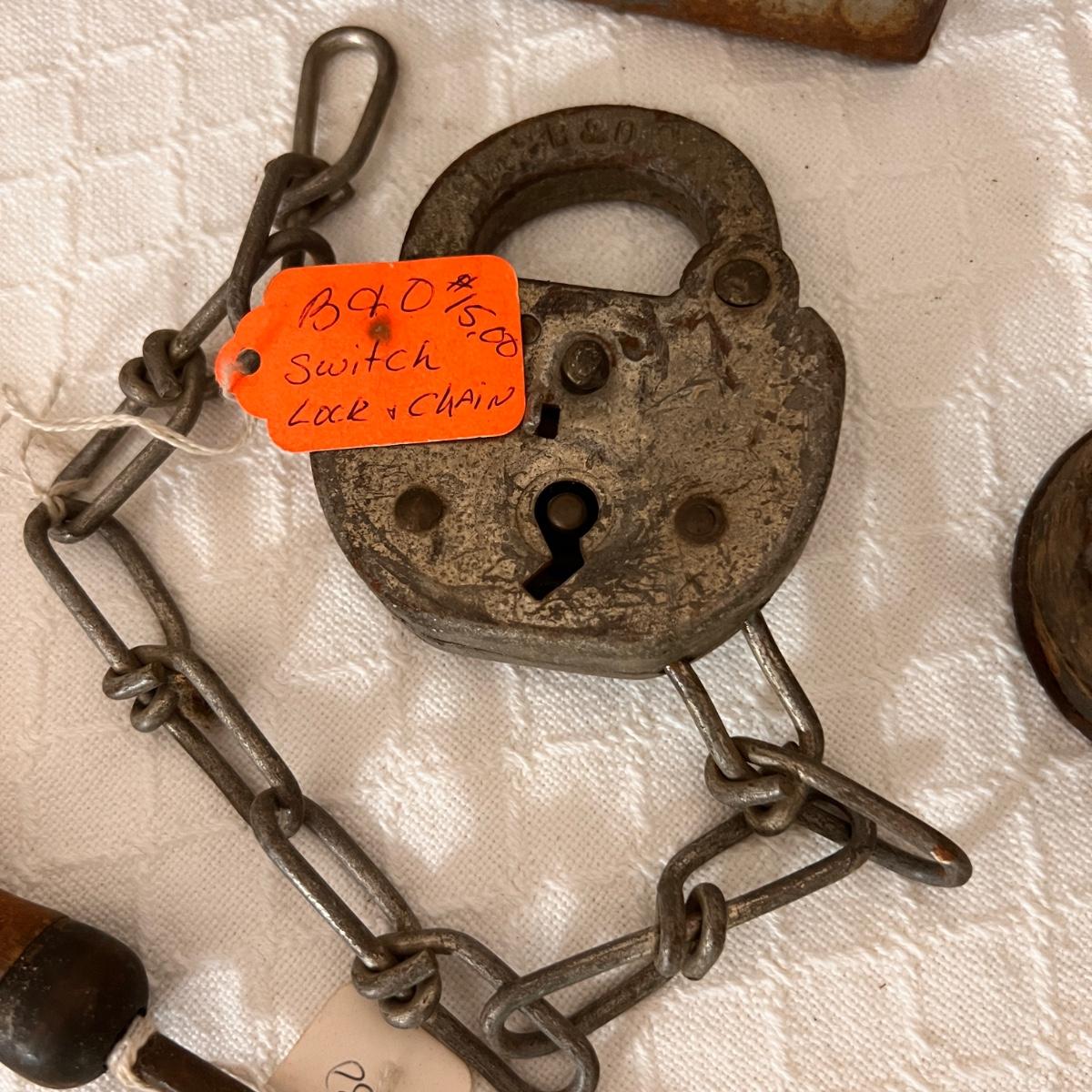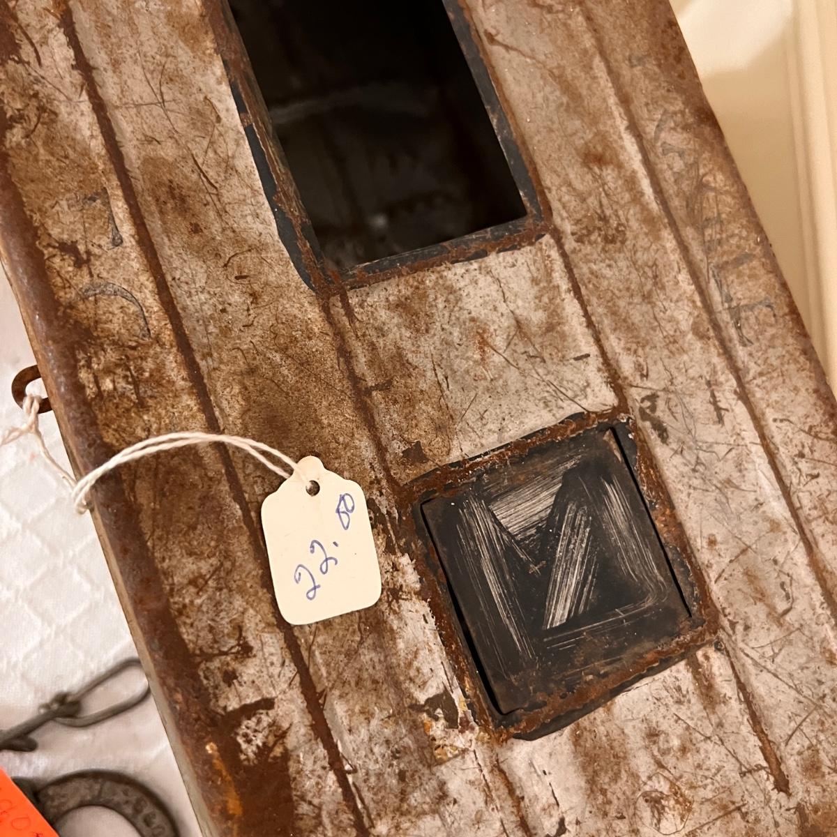 Pieces have their original antique store tags on them. Metal egg box, 1914 tool, switch lock and chain, 2 Gloria thermoses, cow bell and more. See all pics for condition.