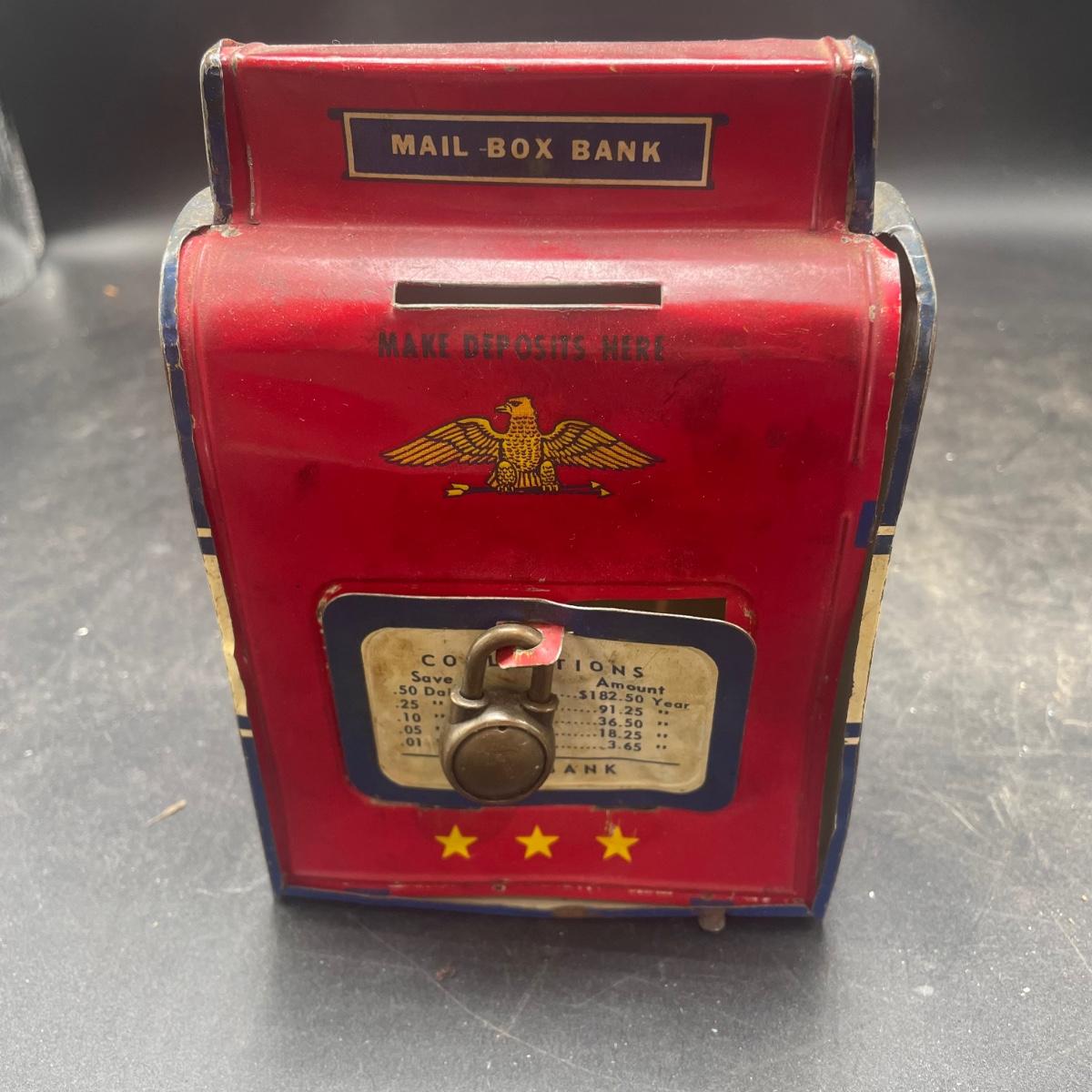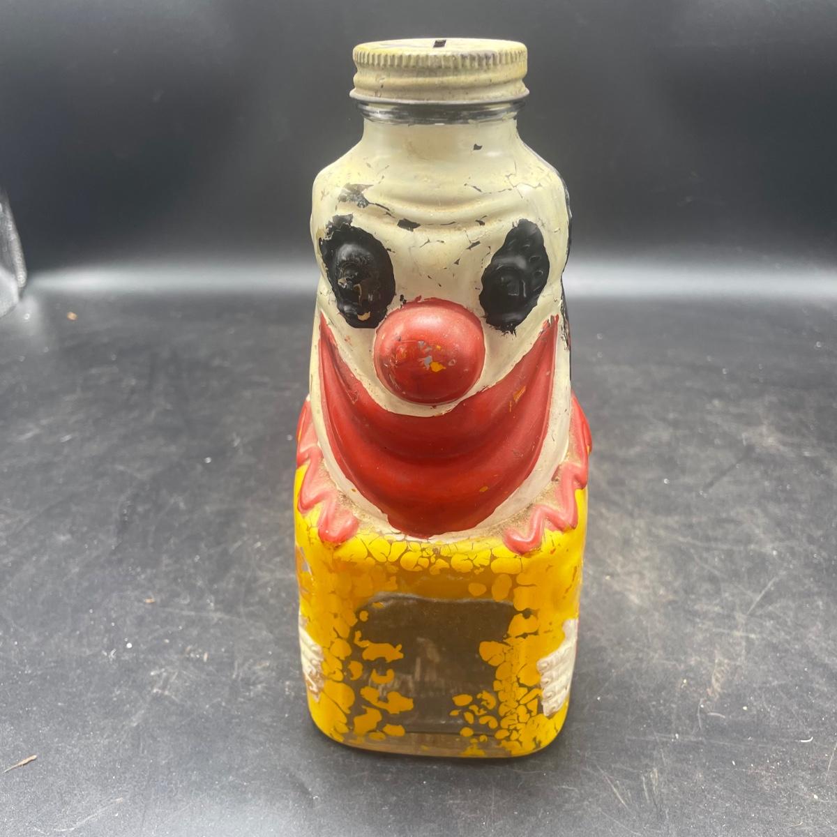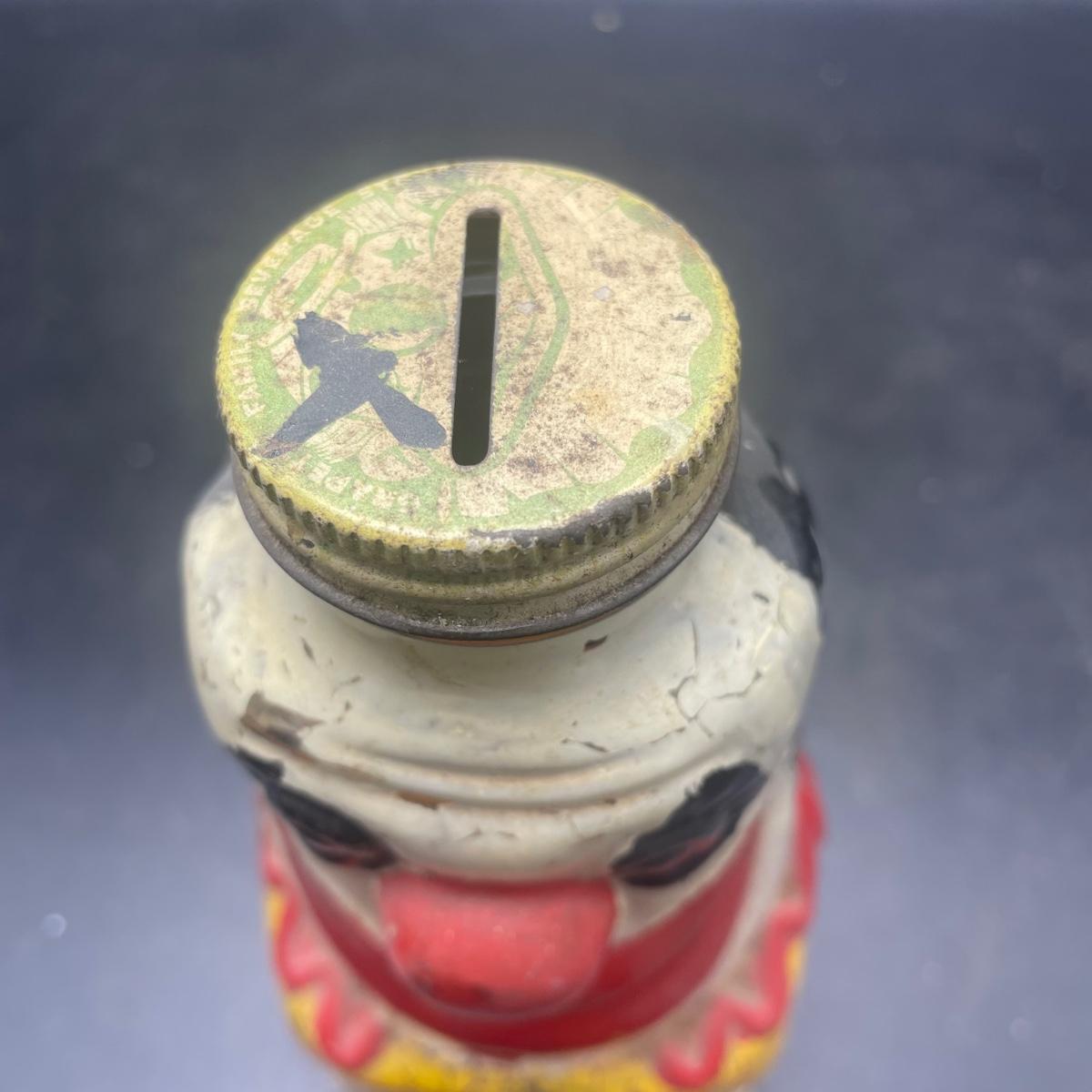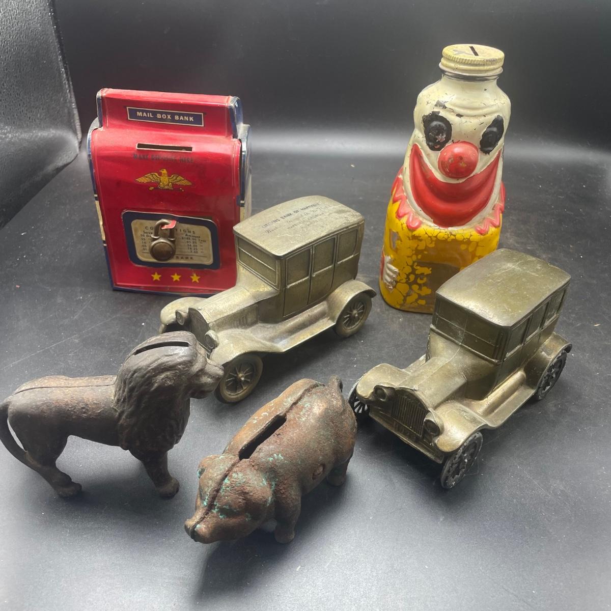 This wonderful collection of money banks includes a pair of brass cars, a metal pig and lion, a tin mail box, an Automatic Recording Safe shaped like a book and a glass bottle painted as a clown that measures 2.5” x 3” x 7”.