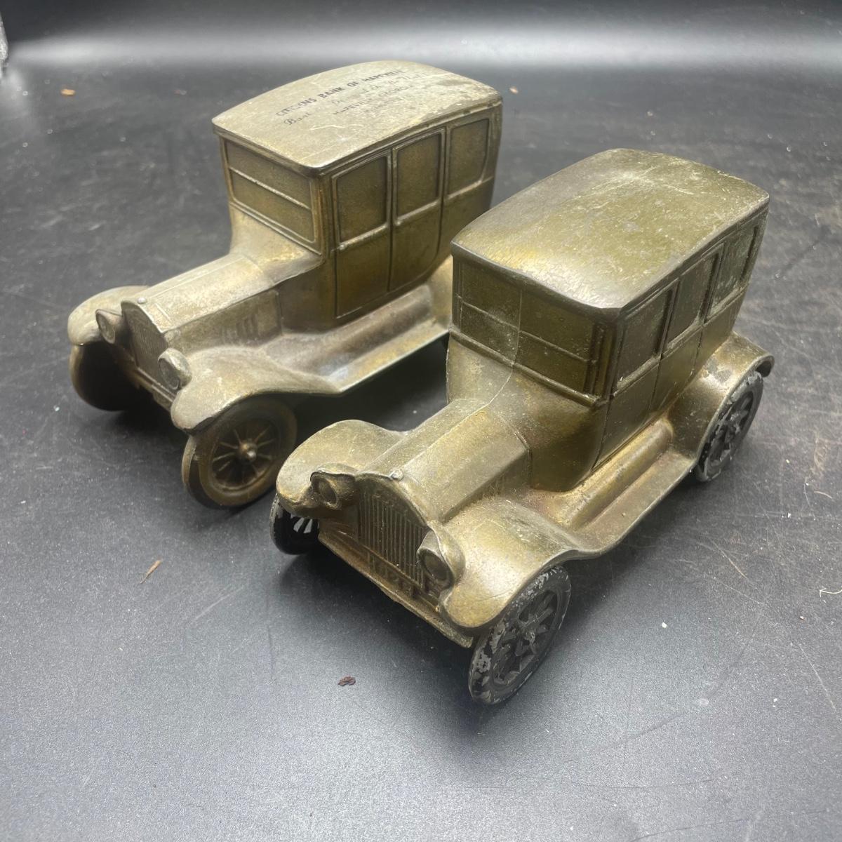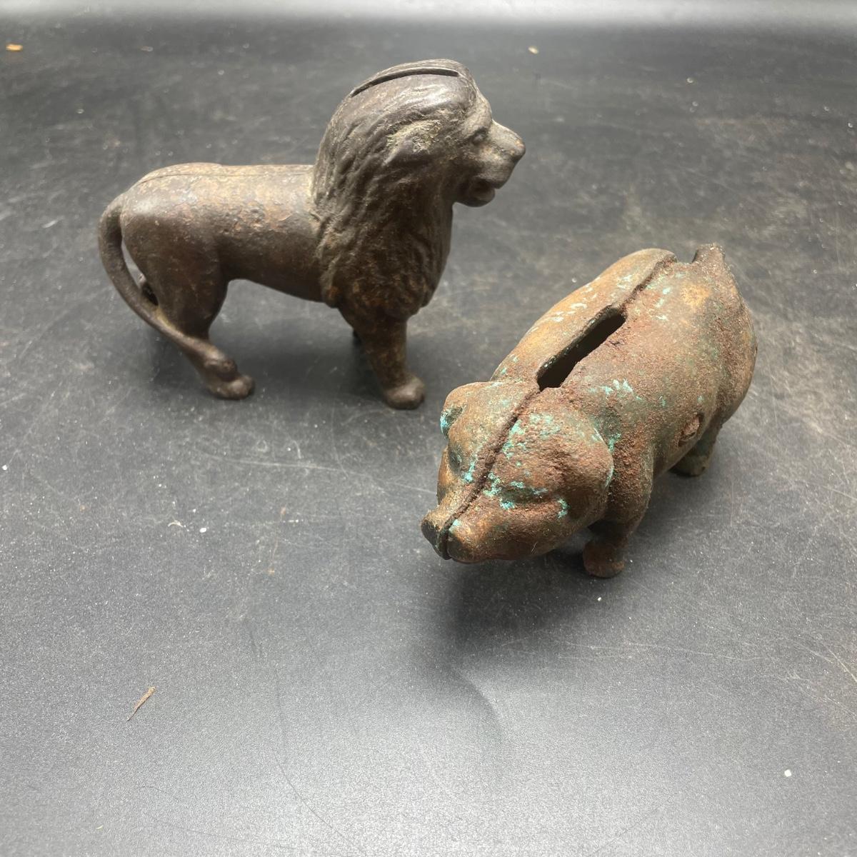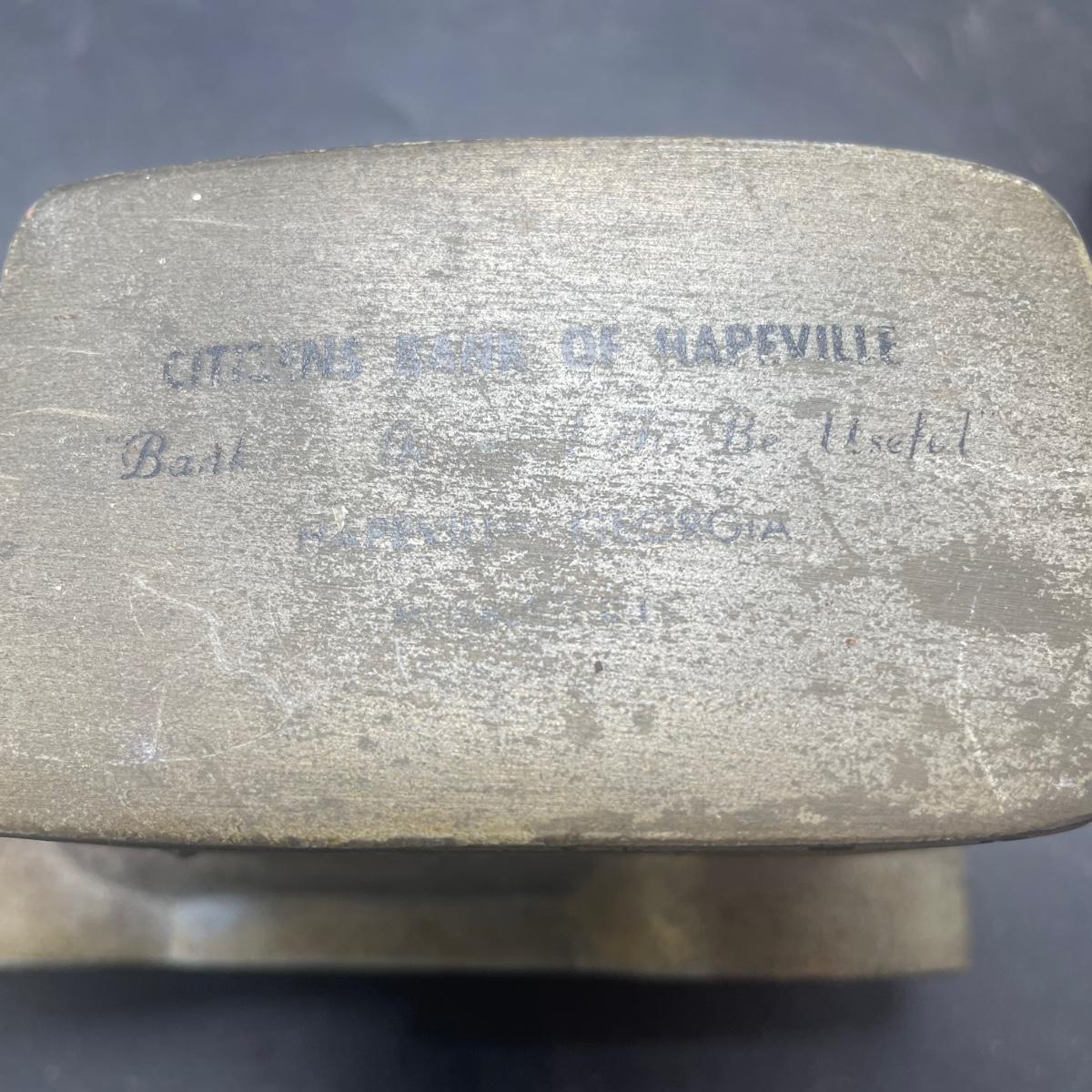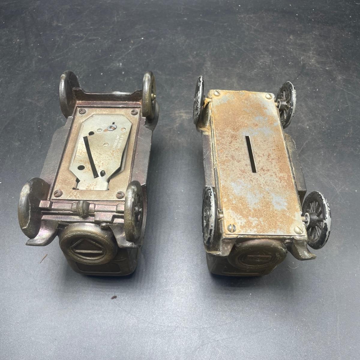 This wonderful collection of money banks includes a pair of brass cars, a metal pig and lion, a tin mail box, an Automatic Recording Safe shaped like a book and a glass bottle painted as a clown that measures 2.5” x 3” x 7”.