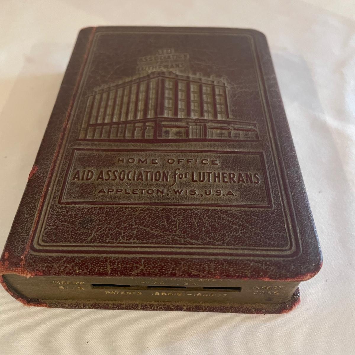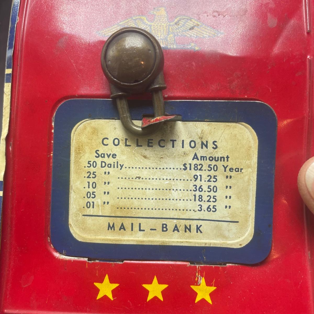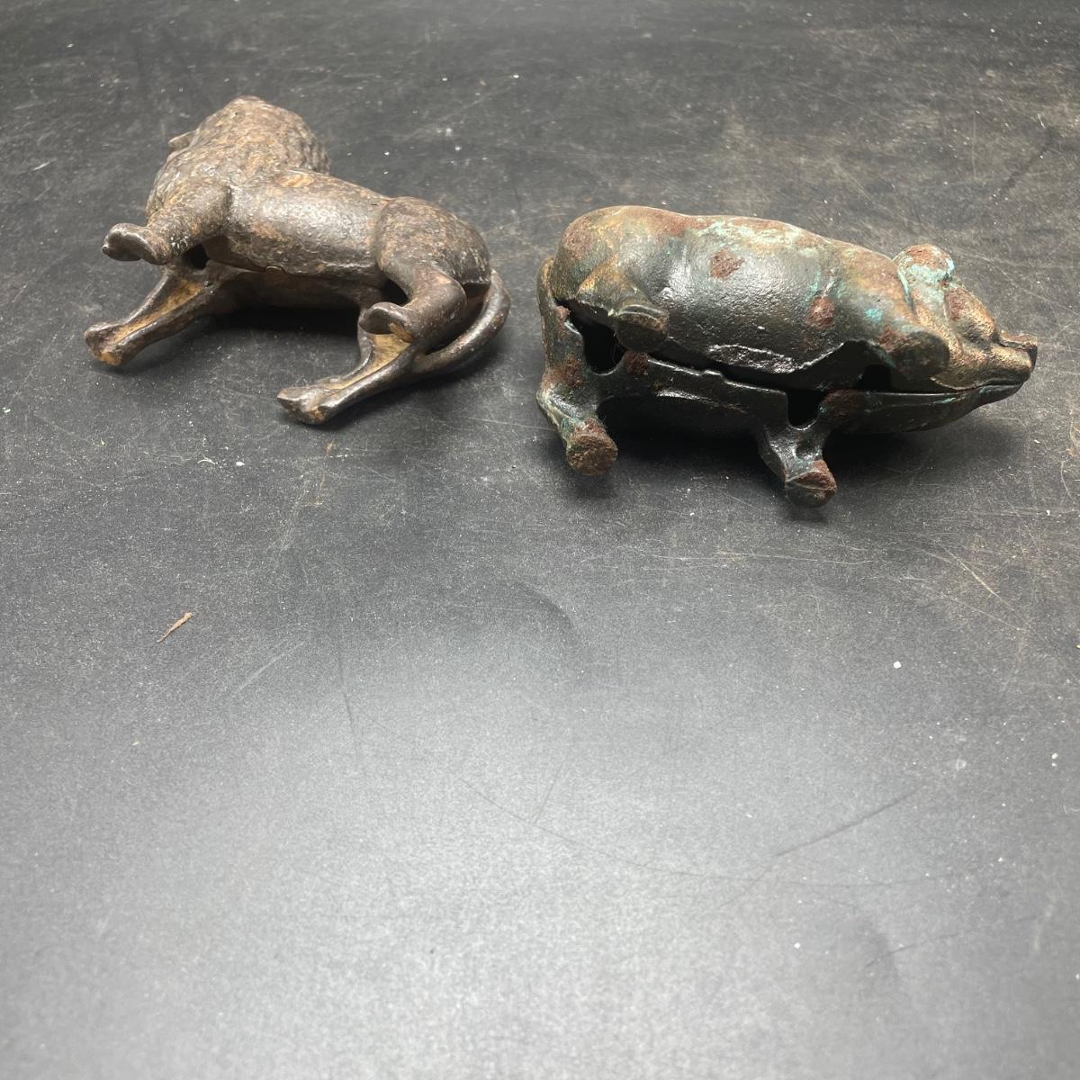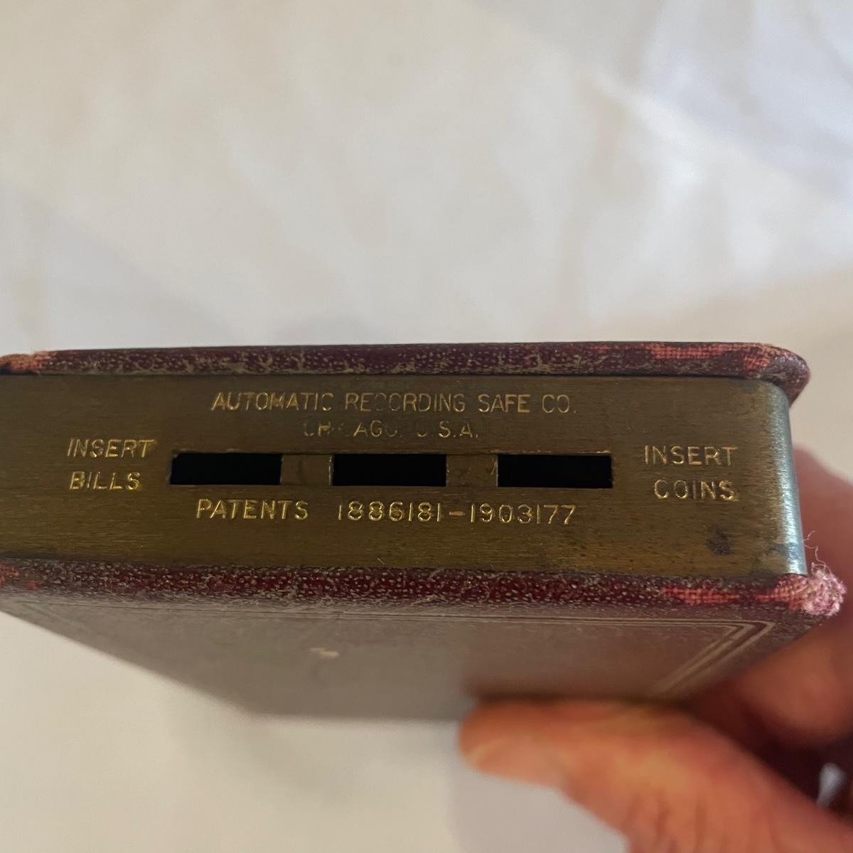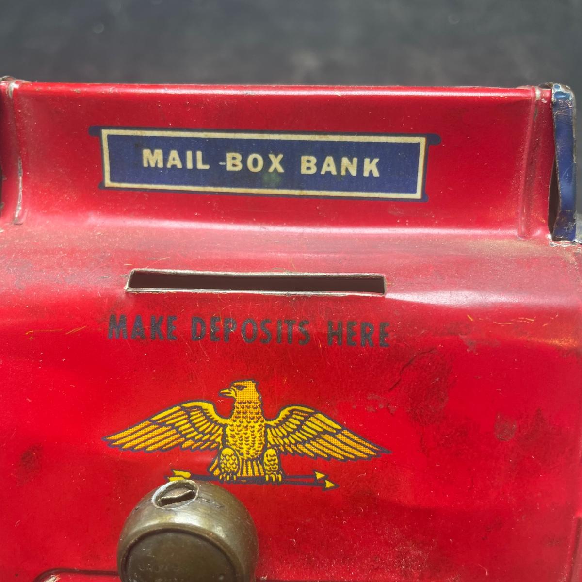 This wonderful collection of money banks includes a pair of brass cars, a metal pig and lion, a tin mail box, an Automatic Recording Safe shaped like a book and a glass bottle painted as a clown that measures 2.5” x 3” x 7”.