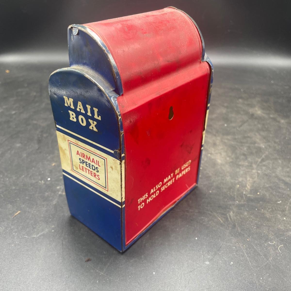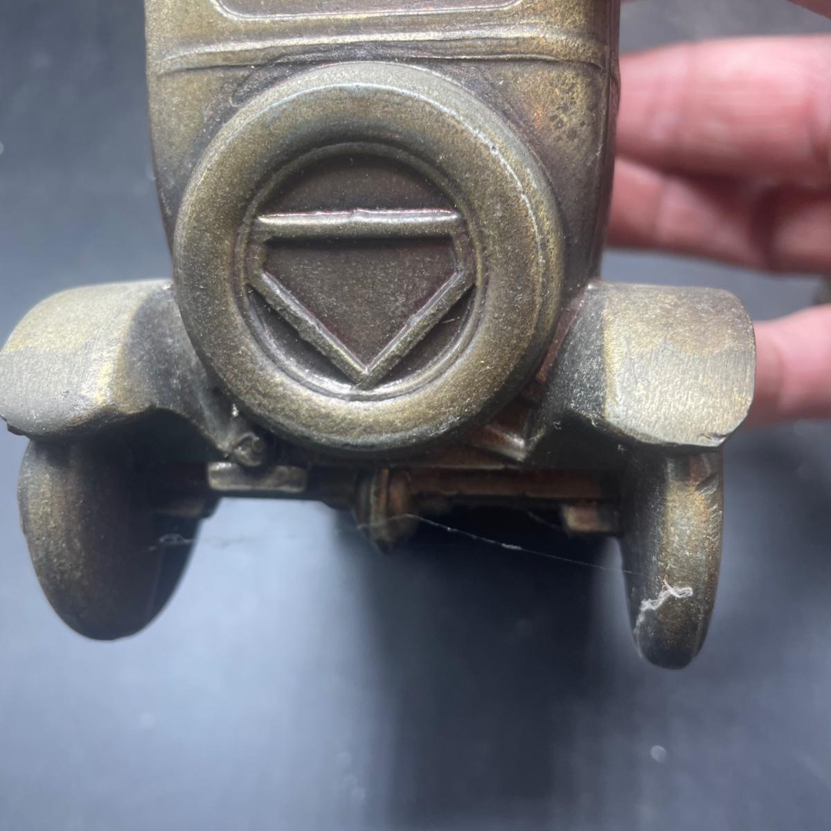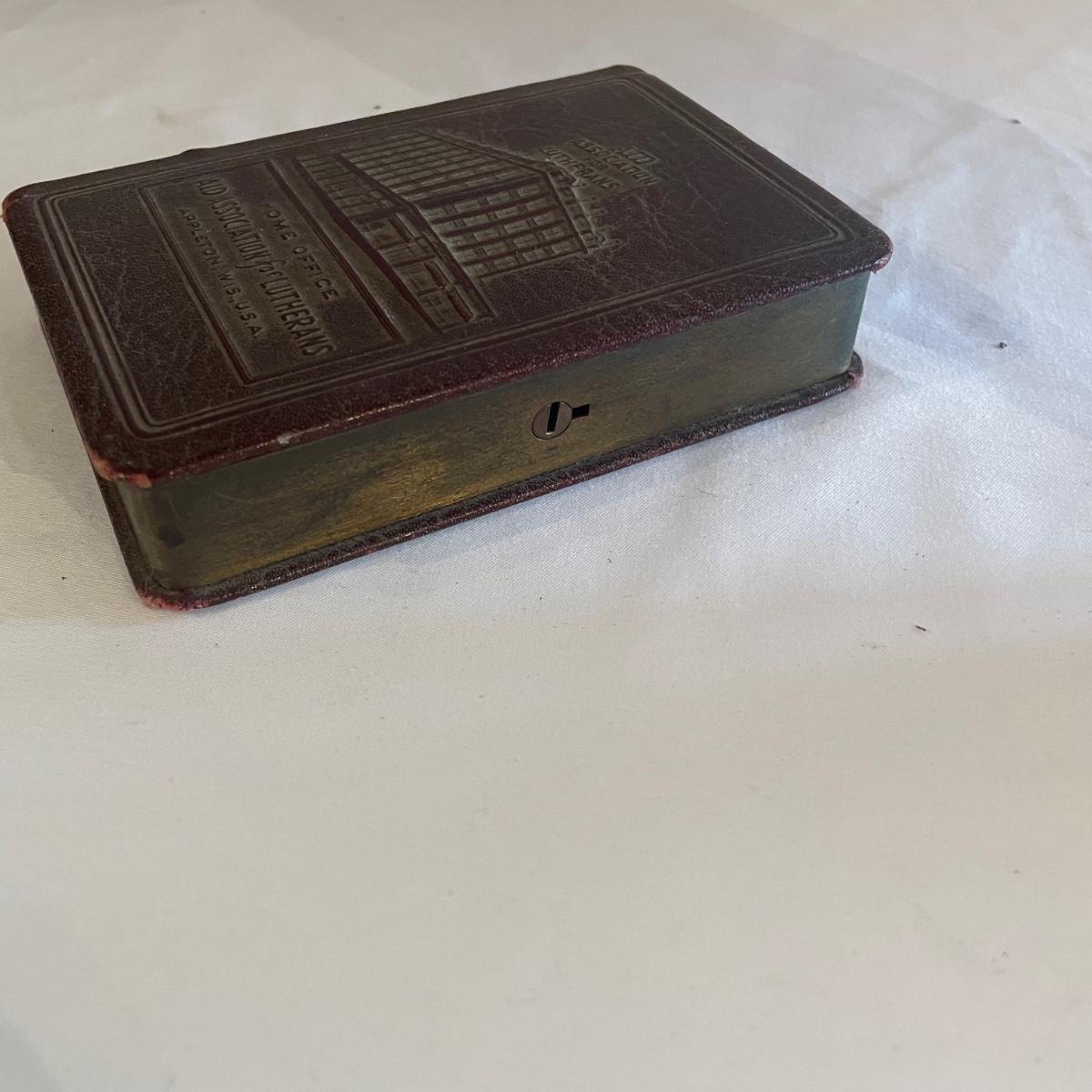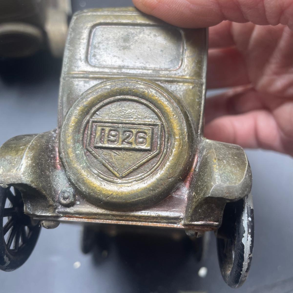 This wonderful collection of money banks includes a pair of brass cars, a metal pig and lion, a tin mail box, an Automatic Recording Safe shaped like a book and a glass bottle painted as a clown that measures 2.5” x 3” x 7”.
