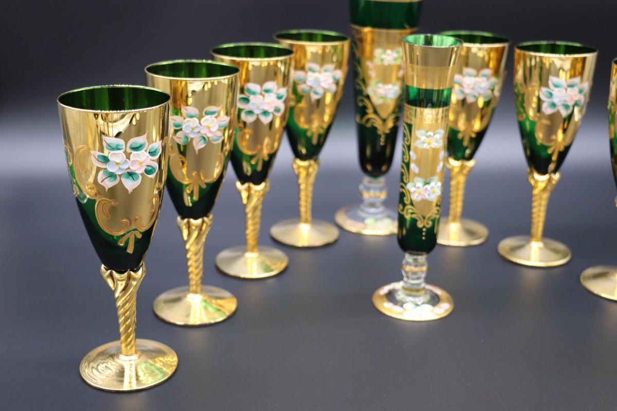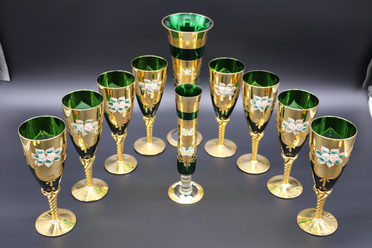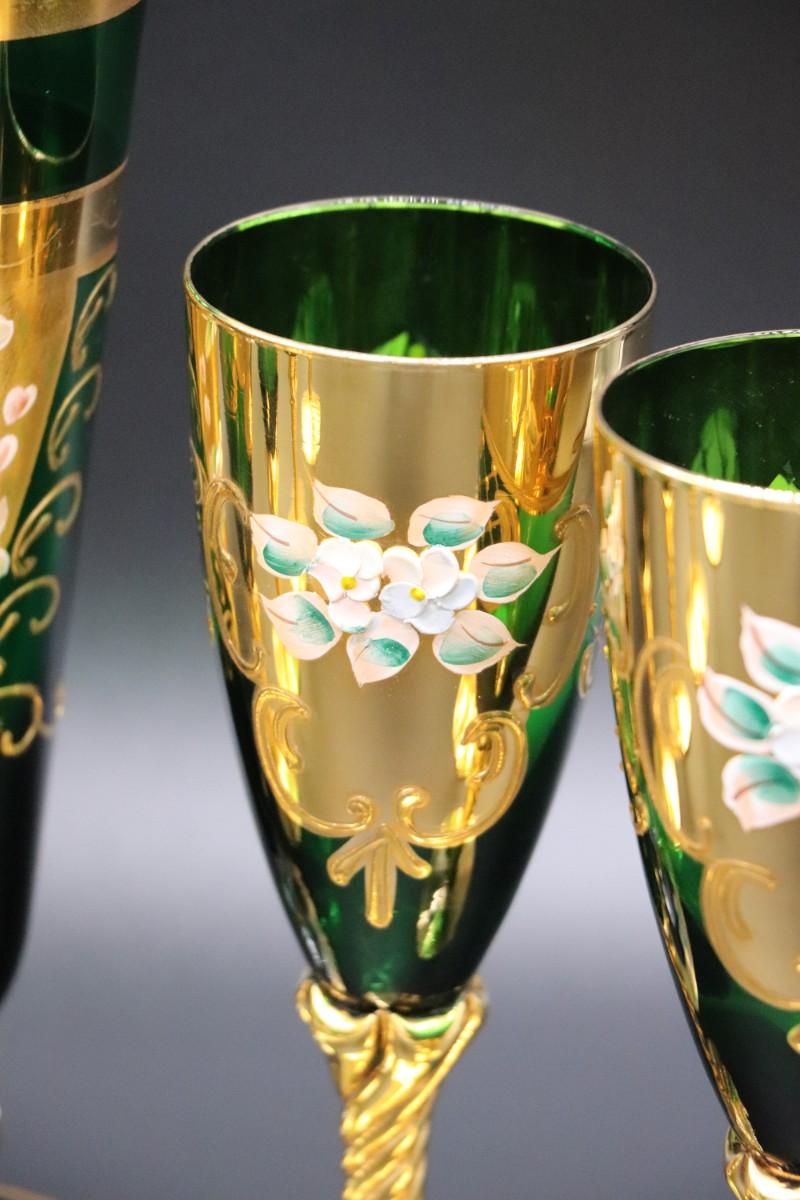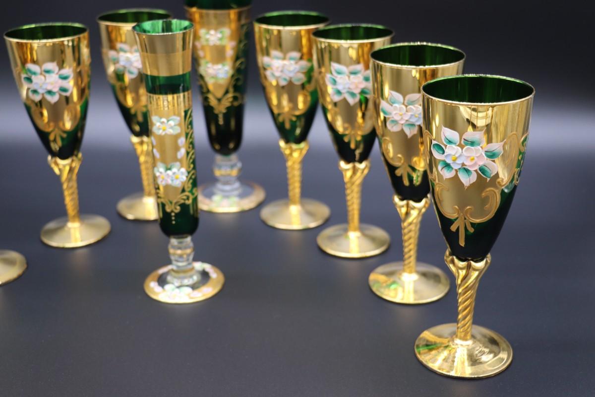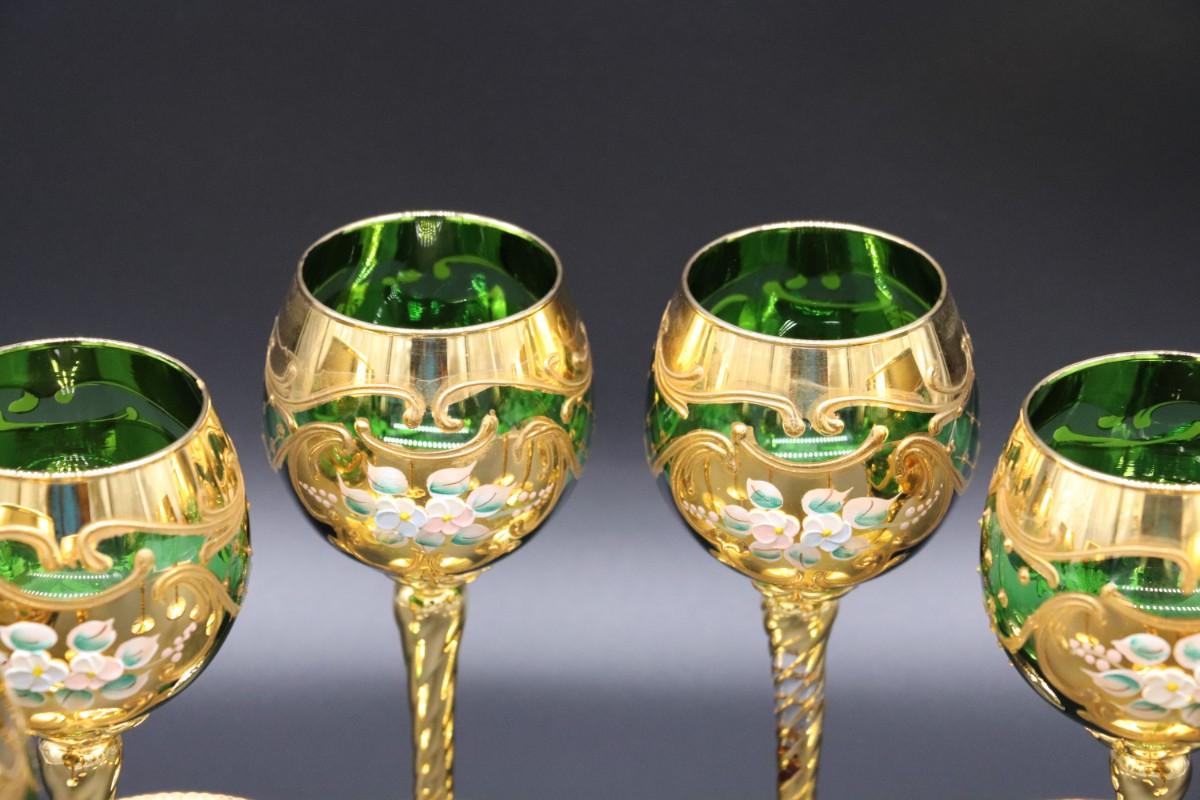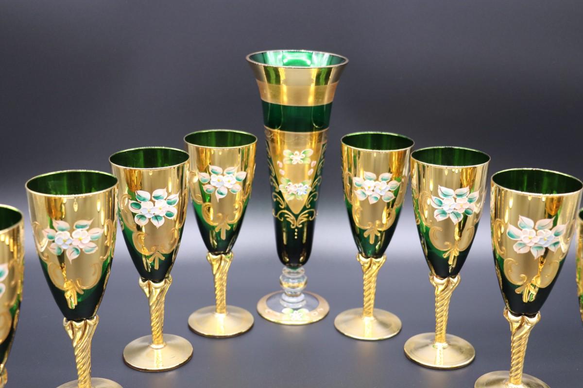Antique Bohemian Moser Deep Green Glass and Gold Gilt Floral Design Wine and Champagne Glasses with Vase. Murano Venetian glass hand painted in Italy. Some light signs of wear, as shown. 1 flower vase, 8 champagne glasses, 8 wine glasses. From the estate of an antique store owner. Condition as shown.