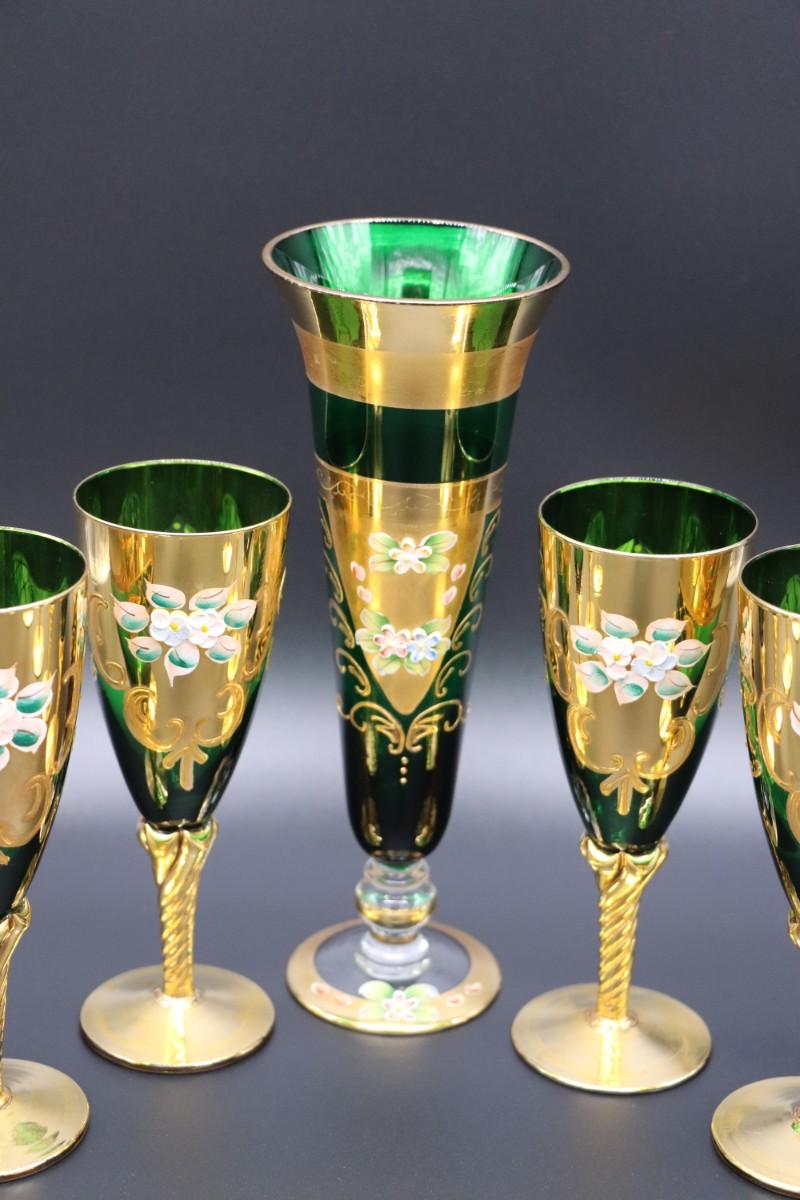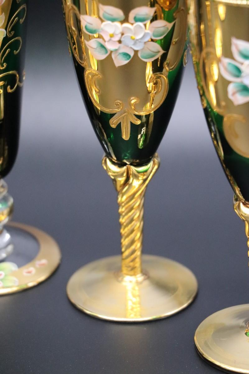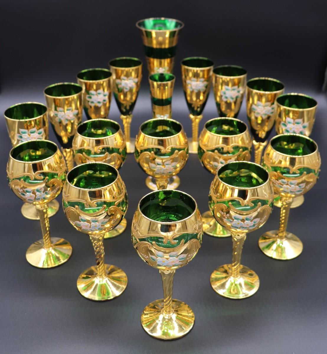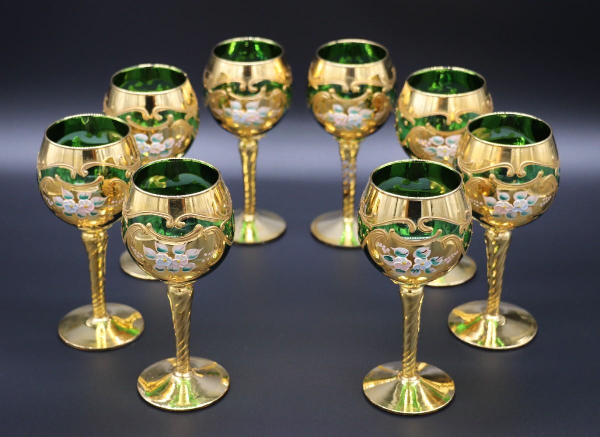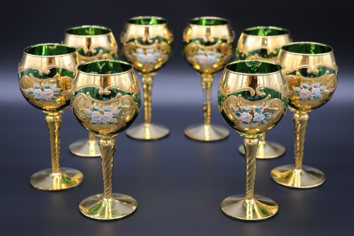 Antique Bohemian Moser Deep Green Glass and Gold Gilt Floral Design Wine and Champagne Glasses with Vase. Murano Venetian glass hand painted in Italy. Some light signs of wear, as shown. 1 flower vase, 8 champagne glasses, 8 wine glasses. From the estate of an antique store owner. Condition as shown.