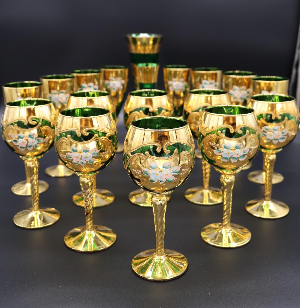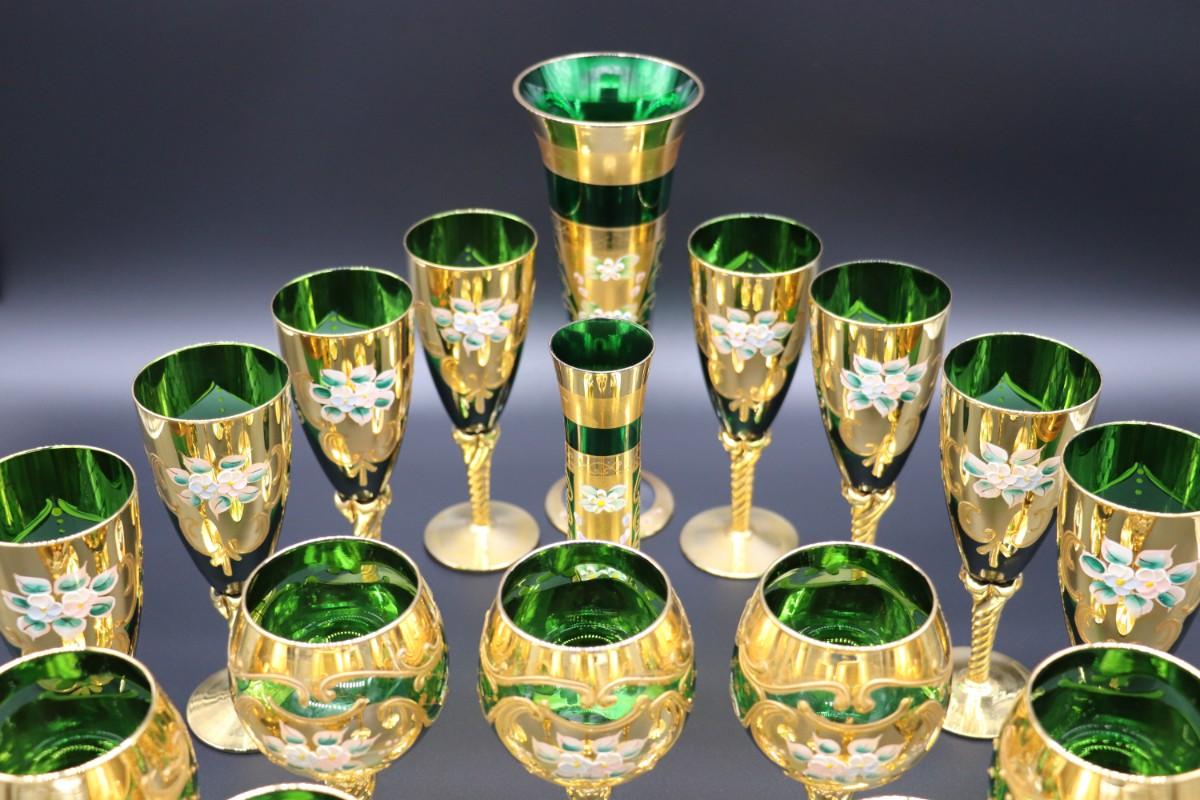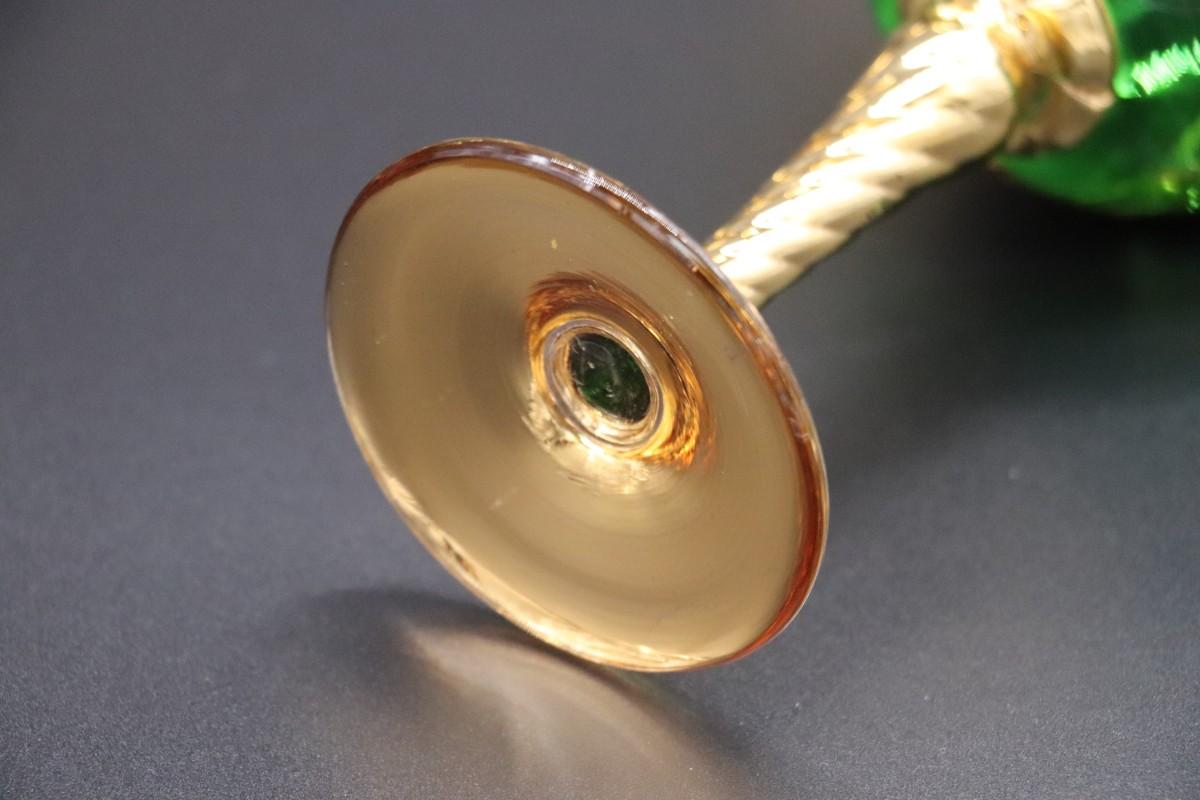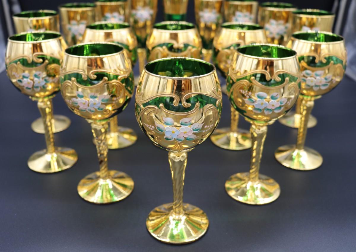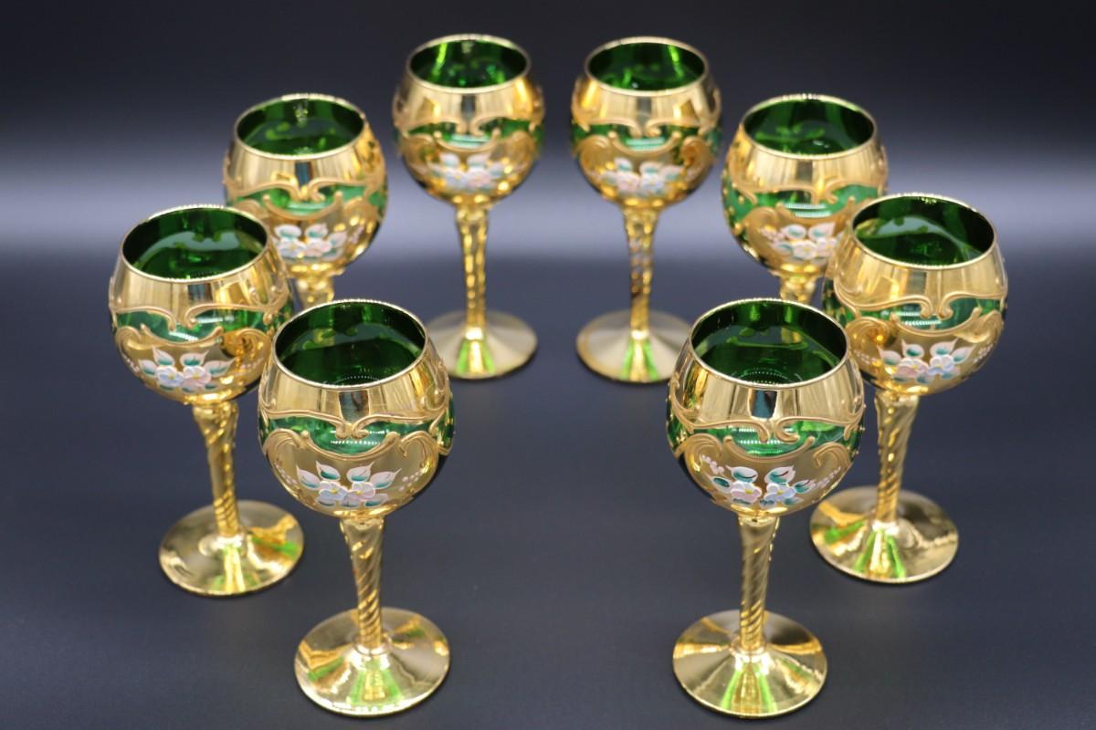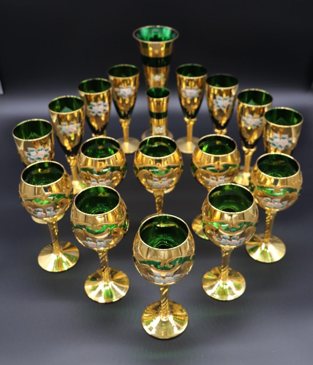 Antique Bohemian Moser Deep Green Glass and Gold Gilt Floral Design Wine and Champagne Glasses with Vase. Murano Venetian glass hand painted in Italy. Some light signs of wear, as shown. 1 flower vase, 8 champagne glasses, 8 wine glasses. From the estate of an antique store owner. Condition as shown.