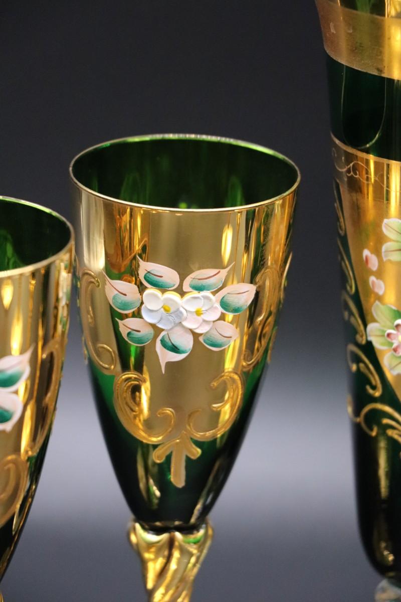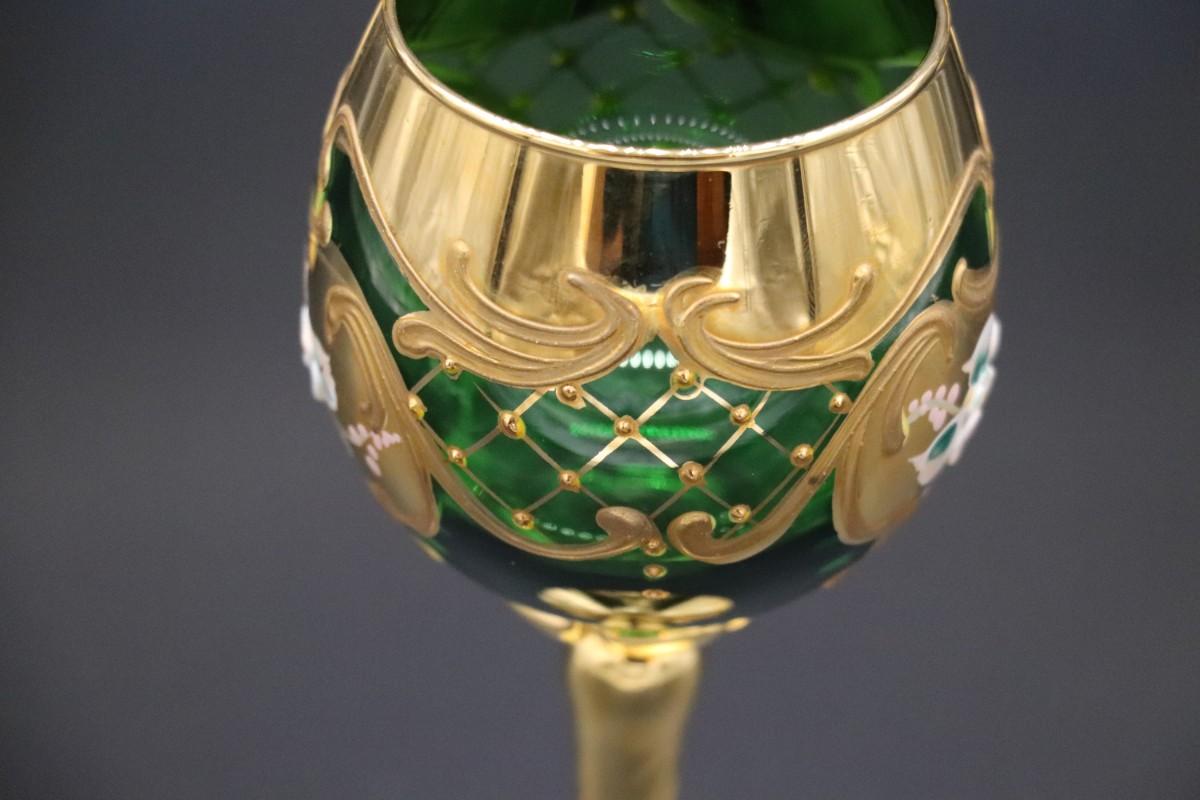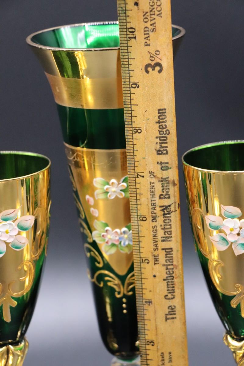 Antique Moser Green Glass and Gold Enamel Floral Design Wine and Champagne Glasses with Vase