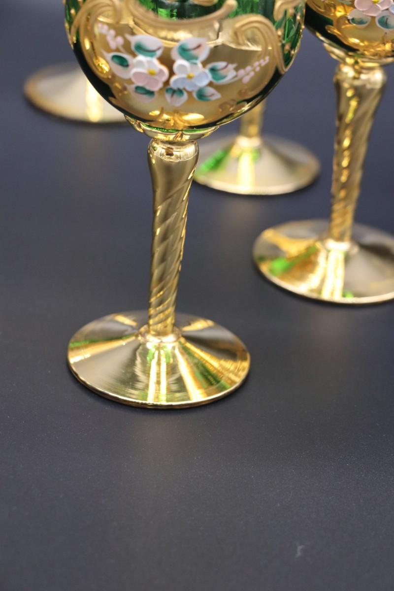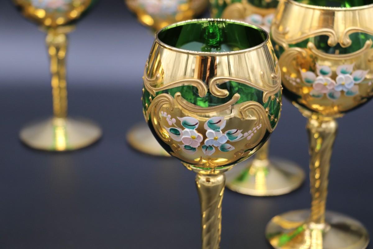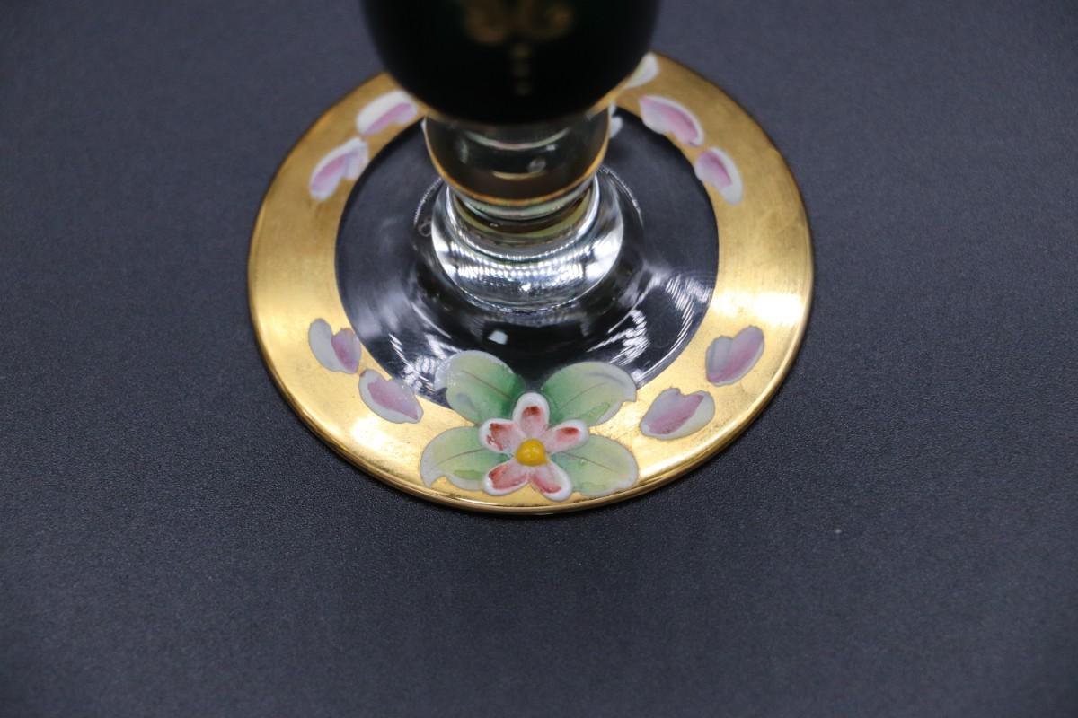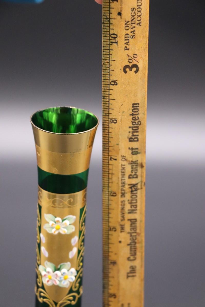 Antique Moser Green Glass and Gold Enamel Floral Design Wine and Champagne Glasses with Vase