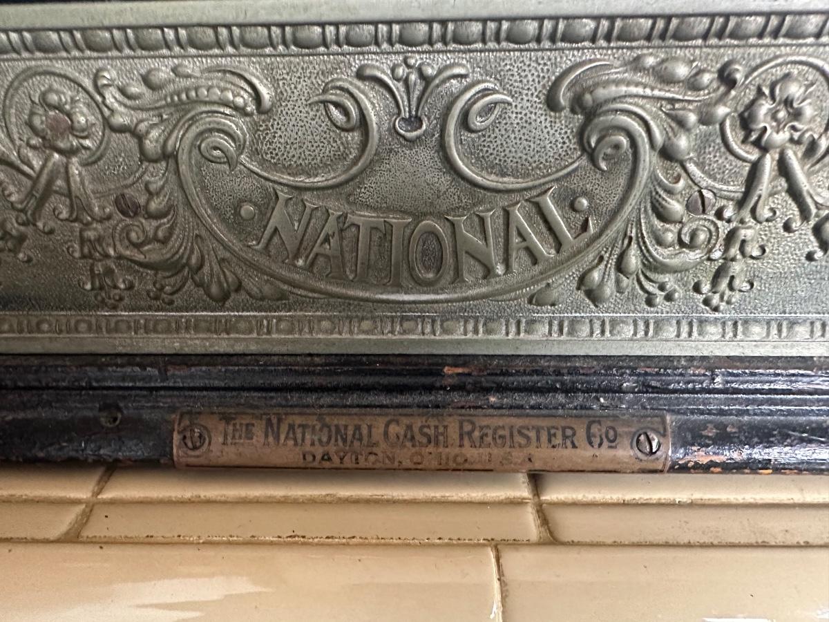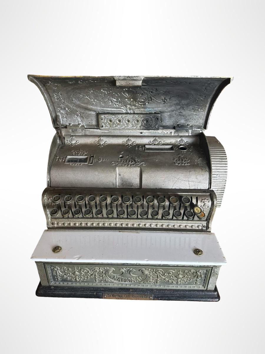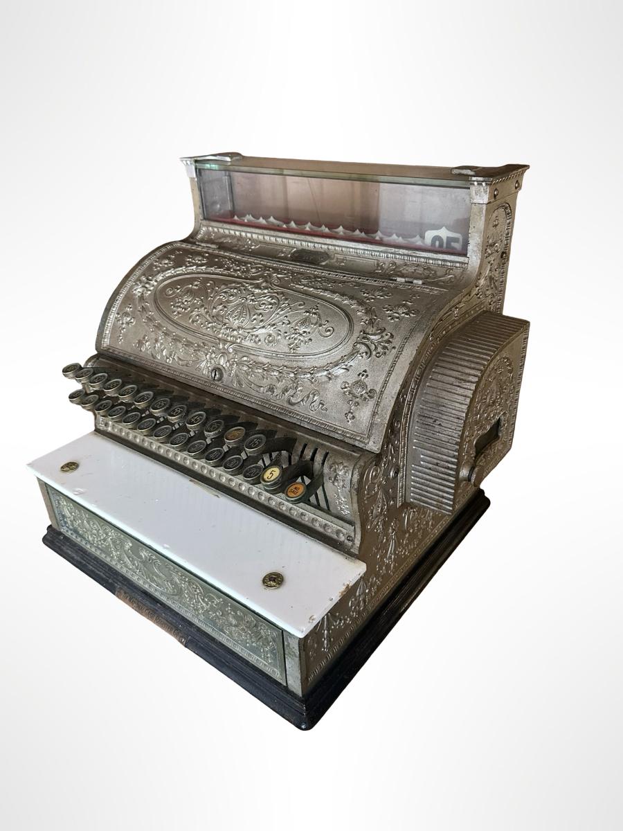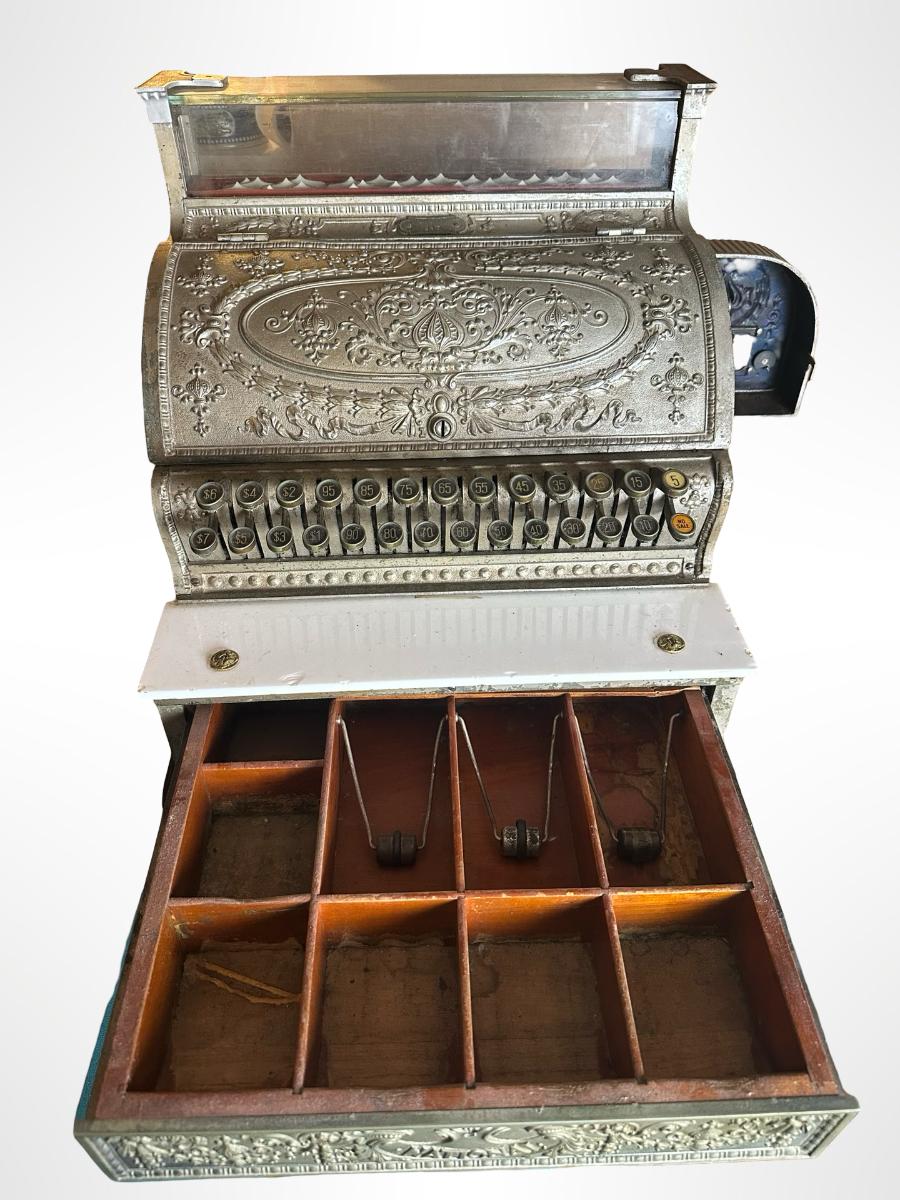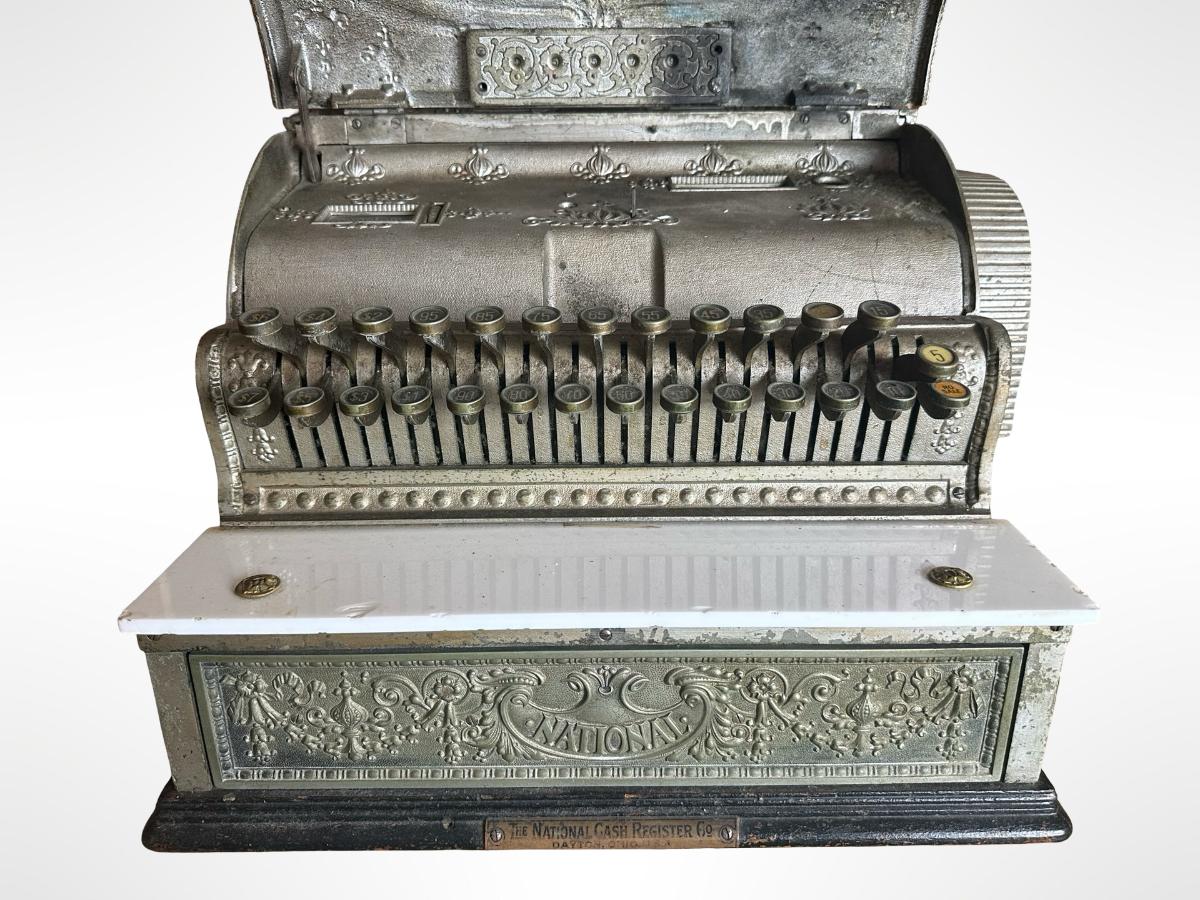 Antique National Cash Register Co. (Dayton, Ohio) cast metal cash register with ornate detailing, glass top, and original drawer. Interior mechanisms present. Shows wear consistent with age and use. Untested for operation.