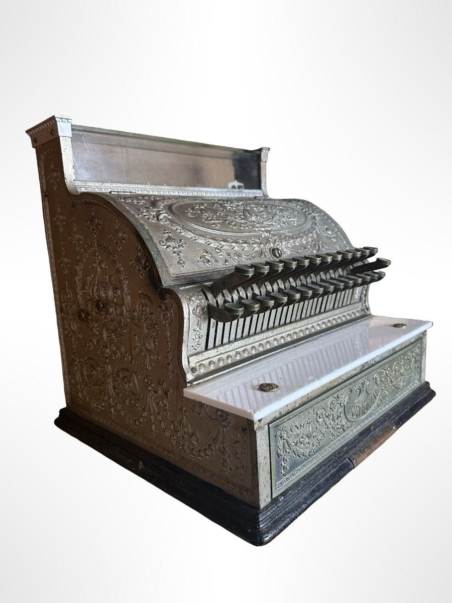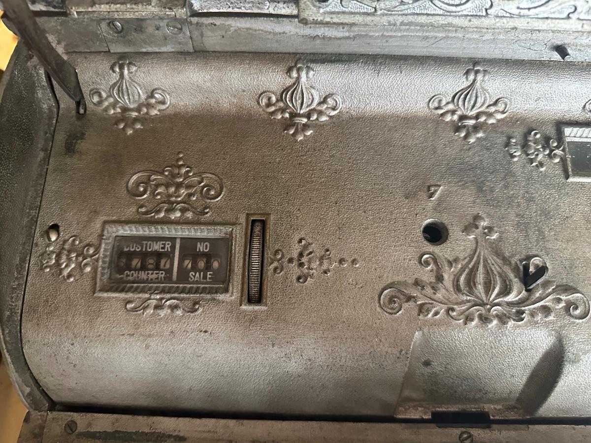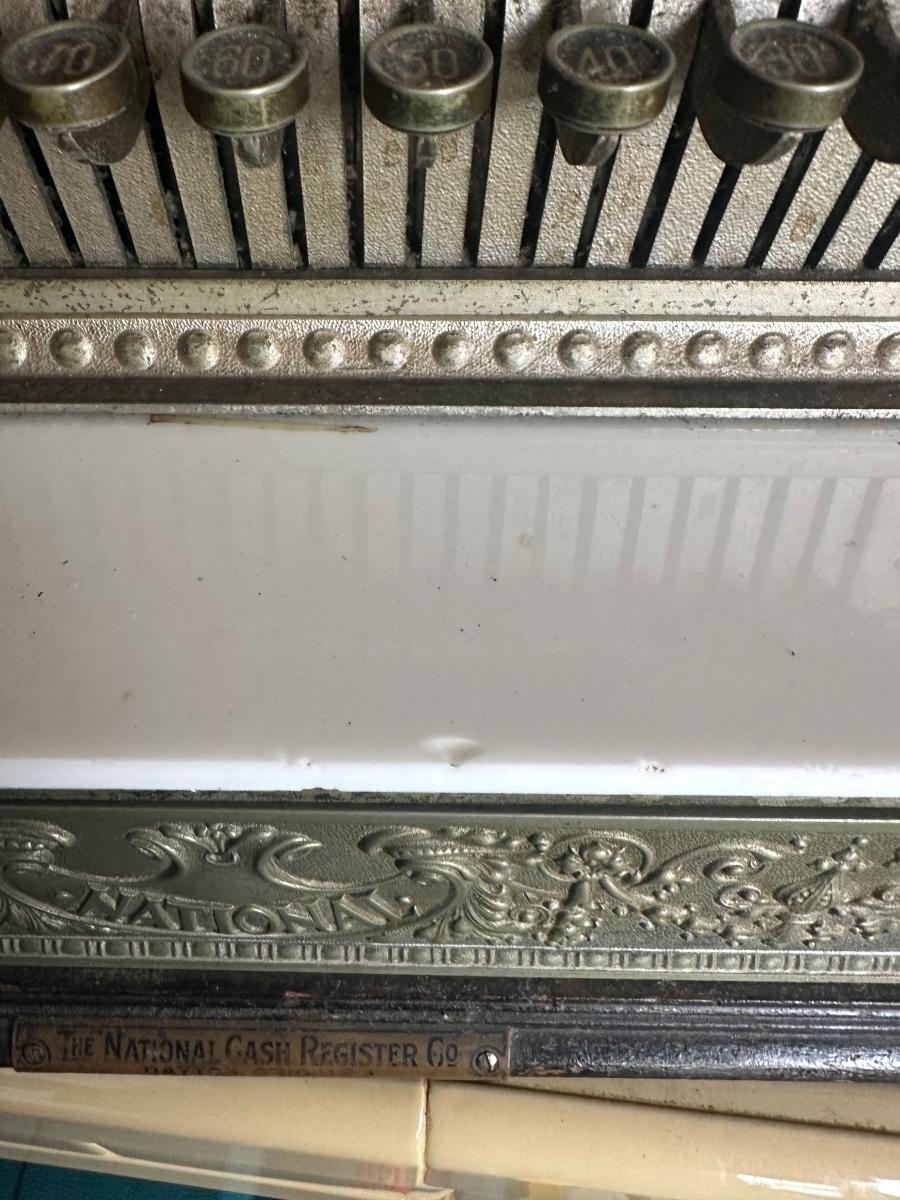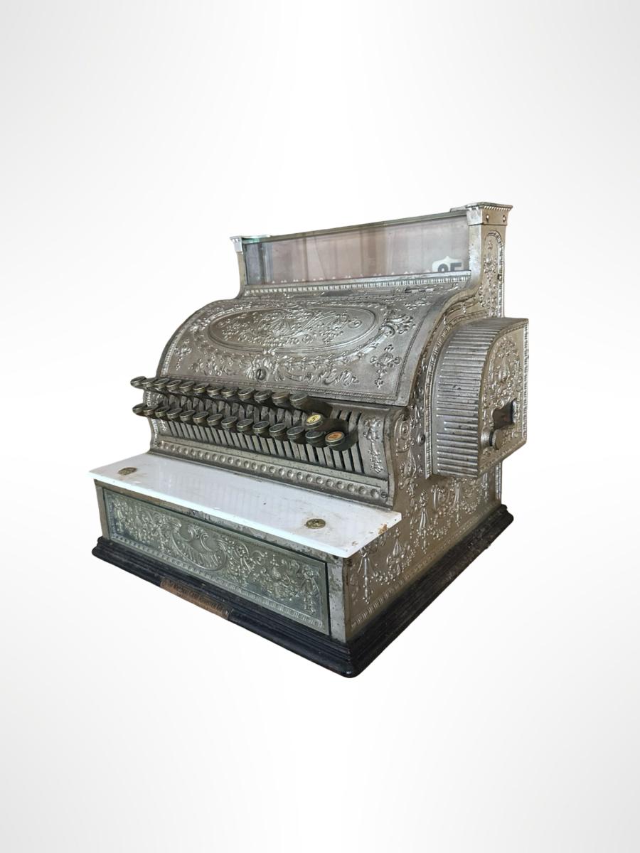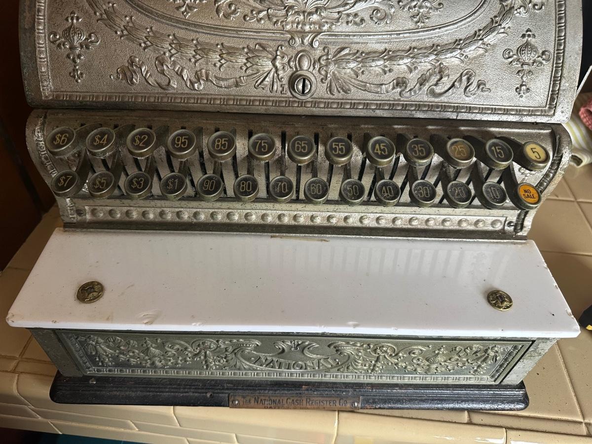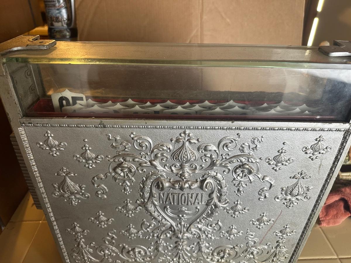 Antique National Cash Register Co. (Dayton, Ohio) cast metal cash register with ornate detailing, glass top, and original drawer. Interior mechanisms present. Shows wear consistent with age and use. Untested for operation.
