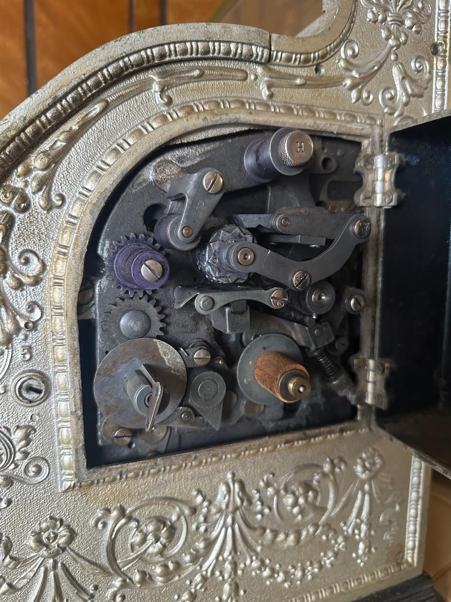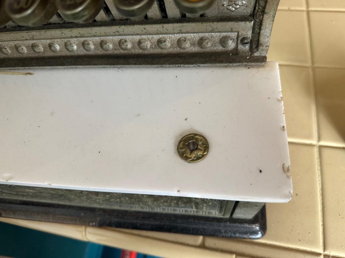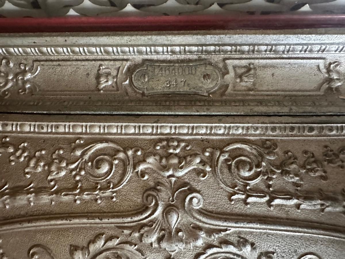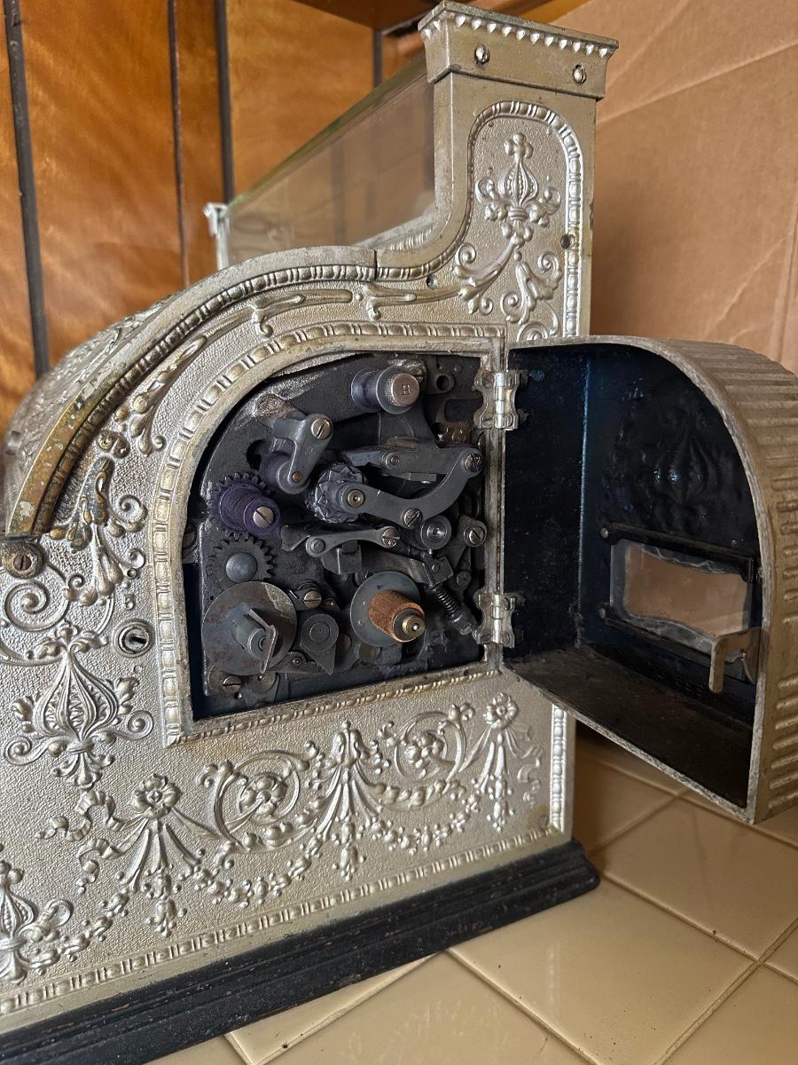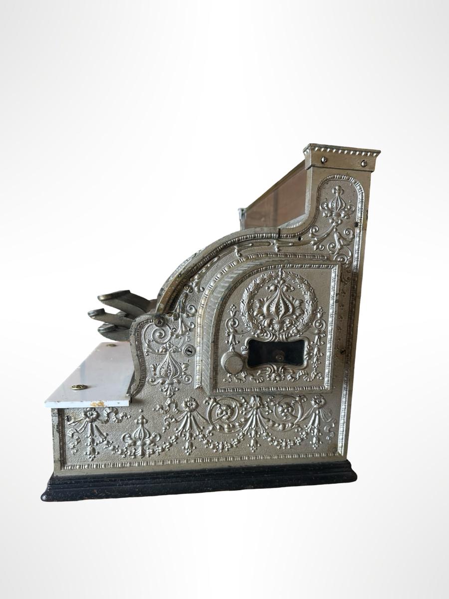 Antique National Cash Register Co. (Dayton, Ohio) cast metal cash register with ornate detailing, glass top, and original drawer. Interior mechanisms present. Shows wear consistent with age and use. Untested for operation.
