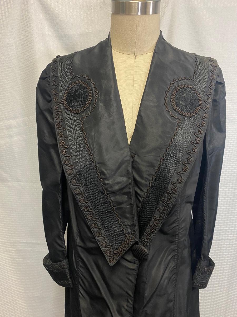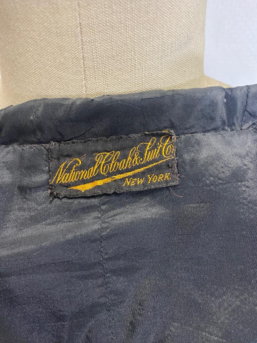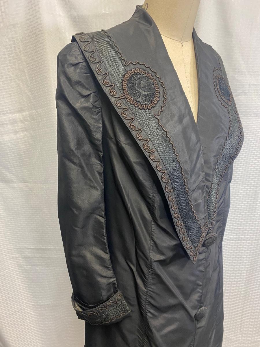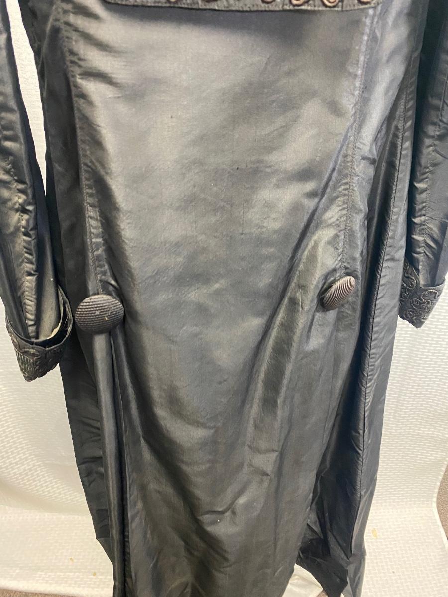 Antique National Cloak & Suit Co. Art Deco Black Trench Coat Jacket Duster. On the larger side, the fit is kind of odd. In good antique condition. Black on black design. Shin length. No pockets.
