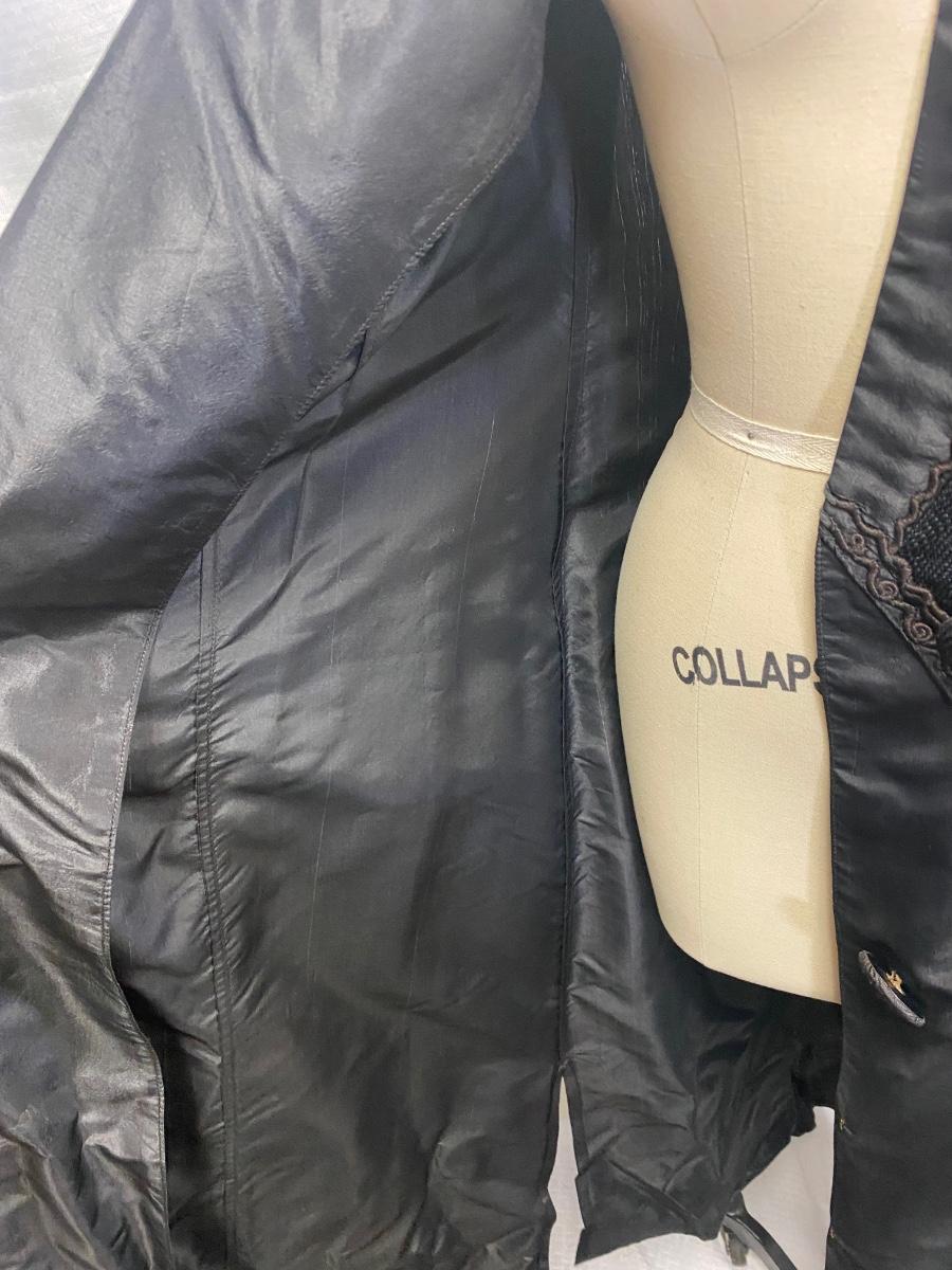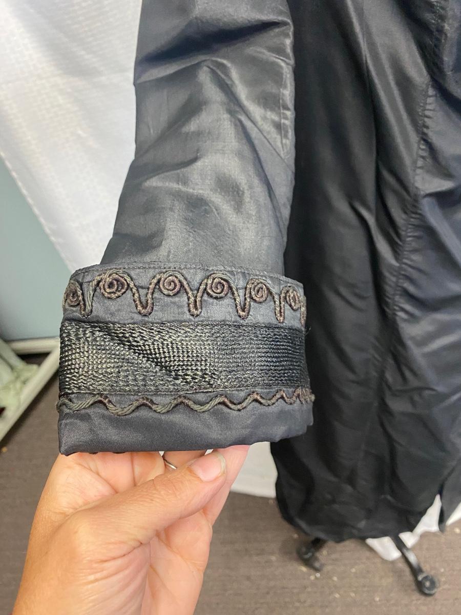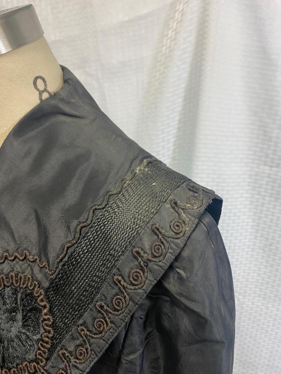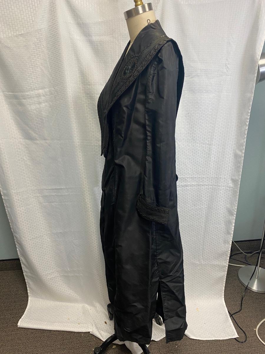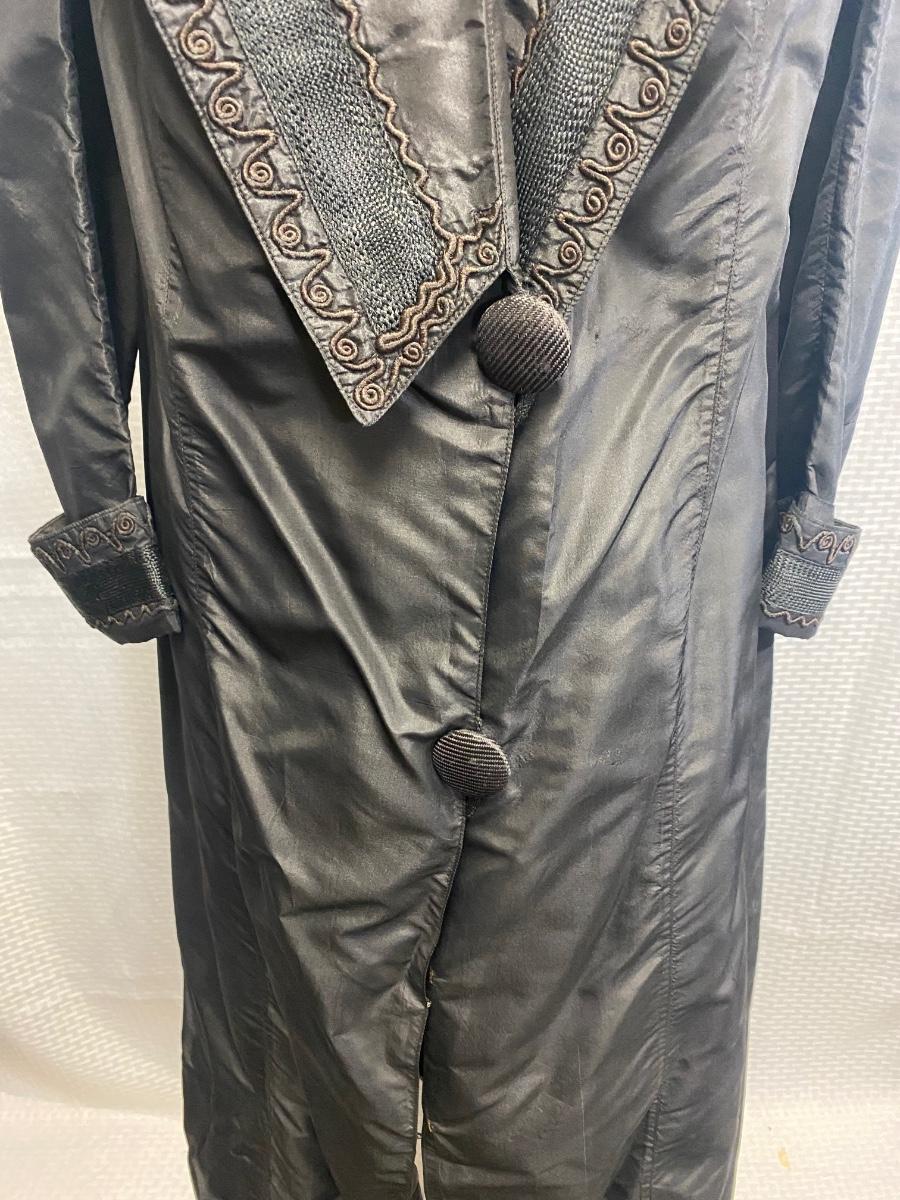 Antique National Cloak & Suit Co. Art Deco Black Trench Coat Jacket Duster. On the larger side, the fit is kind of odd. In good antique condition. Black on black design. Shin length. No pockets.