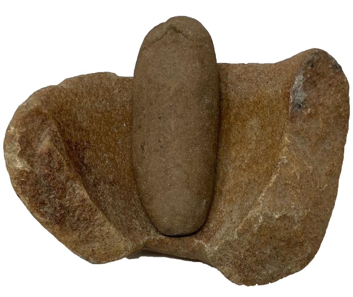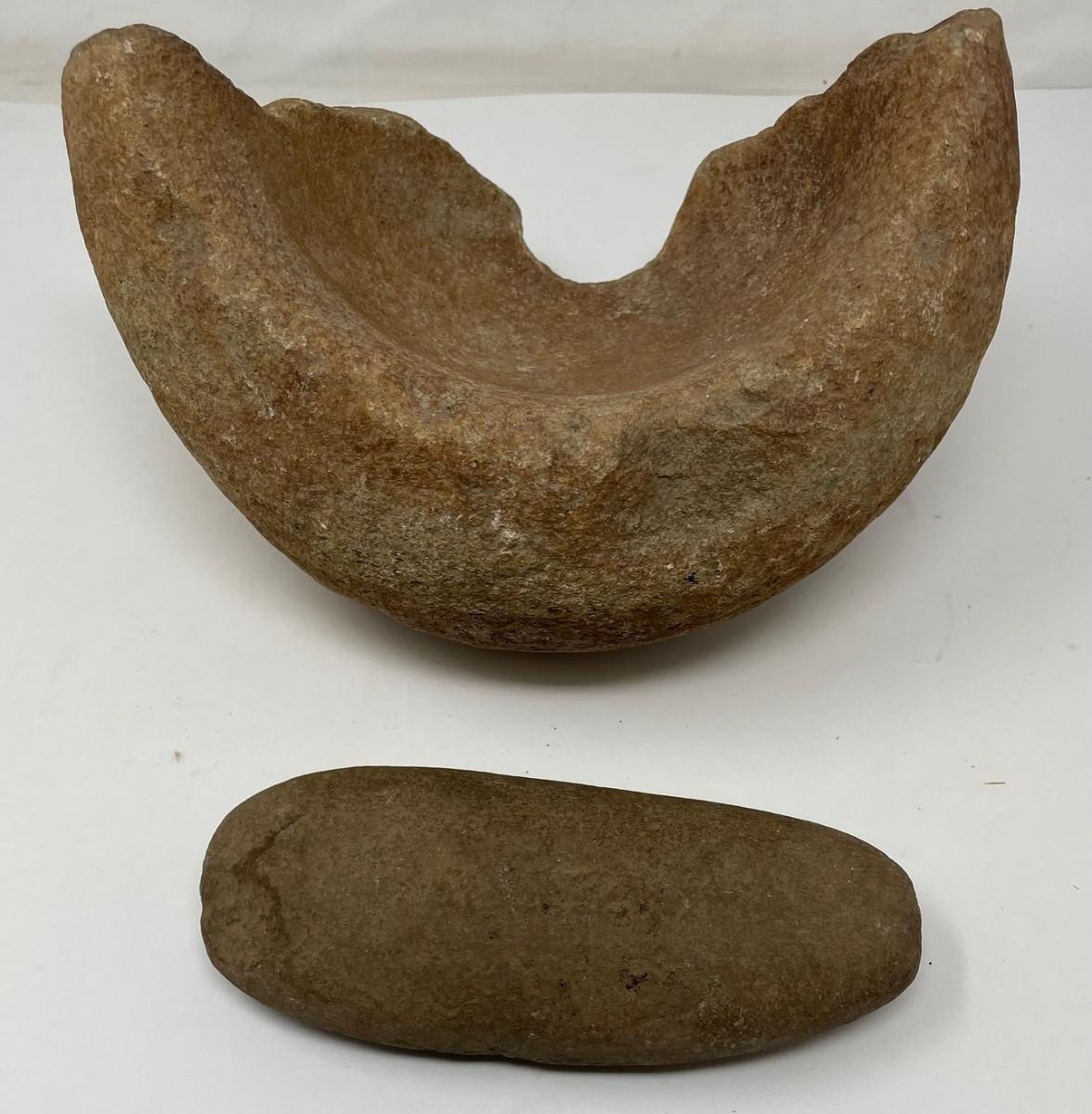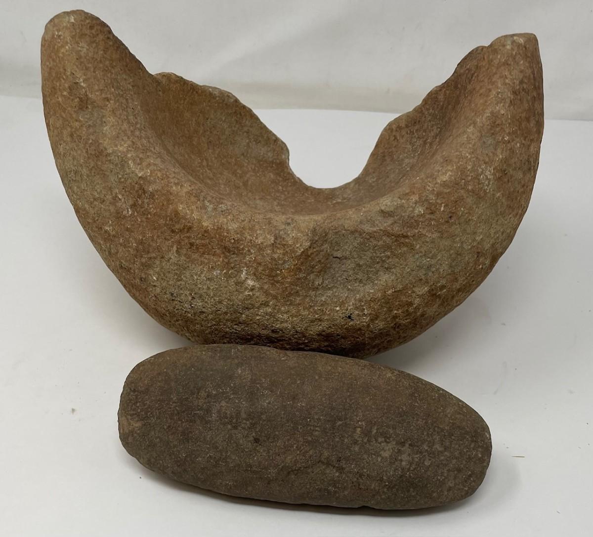 Description: Antique Native American Indian Mortar Stone & Pestle; Material: Stone; Measurement approximate: 10x5 in. (mortar stone); 7 in. (pestle)