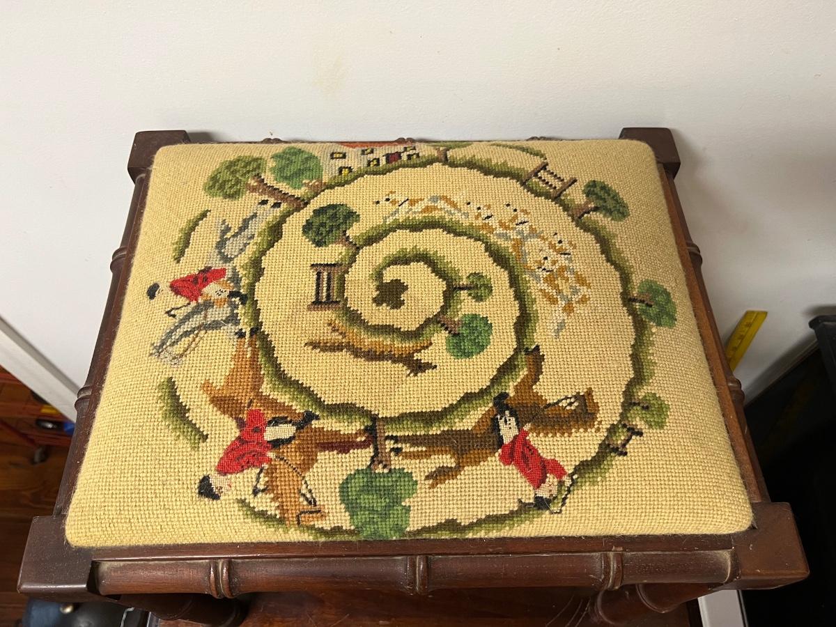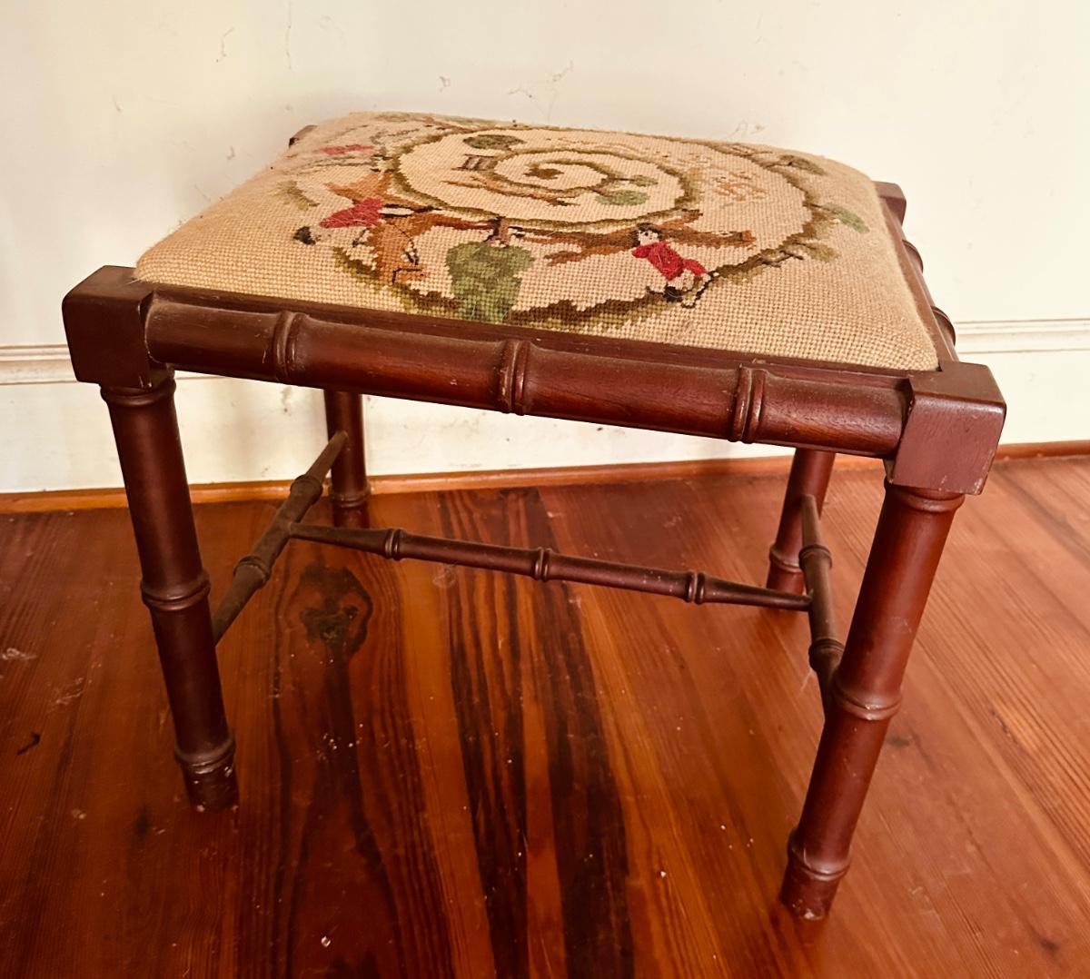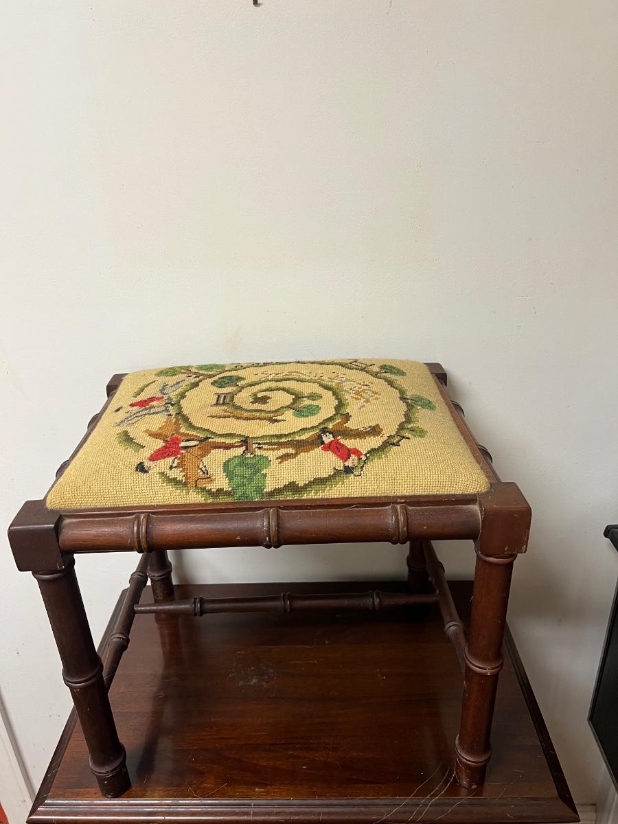 antique needle point seat hunt scene cane cut stool 60.5 X 19.25 x15.25