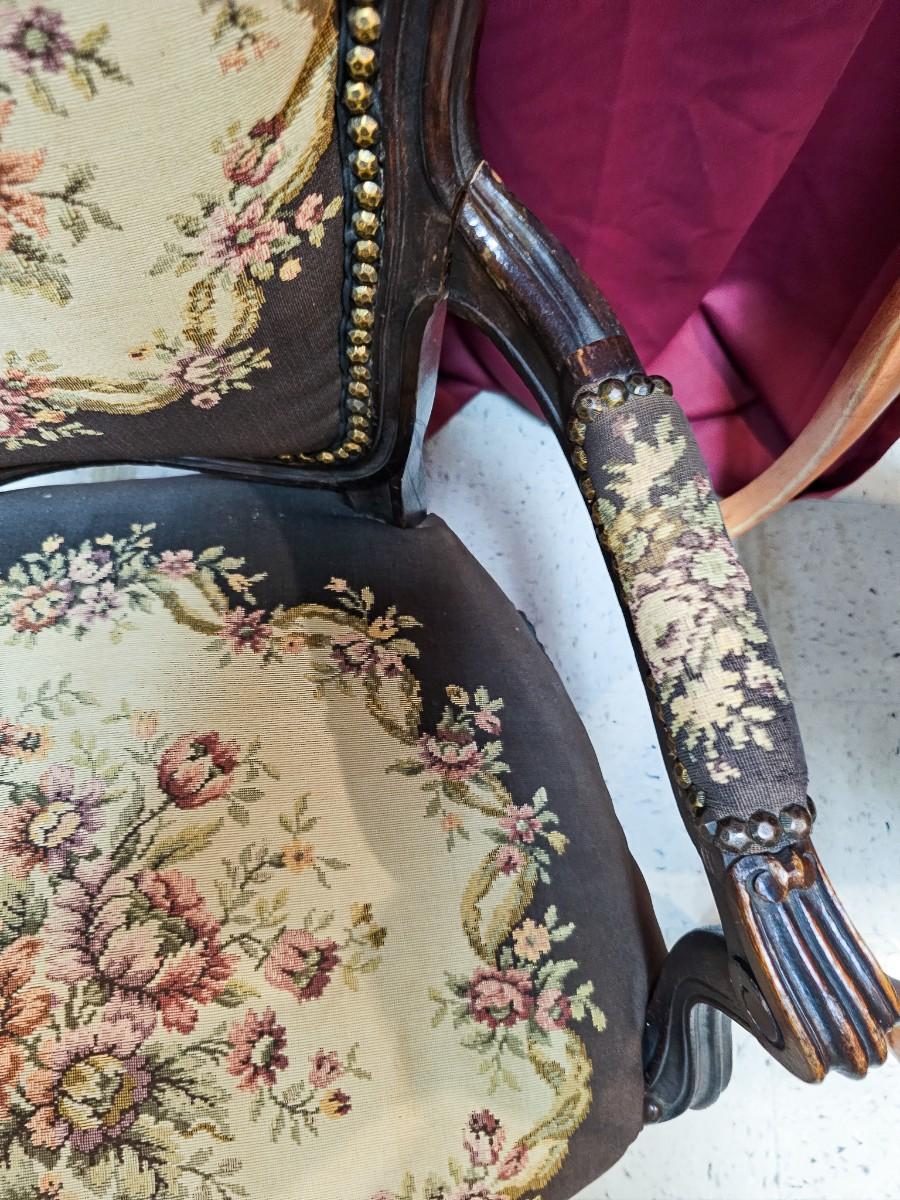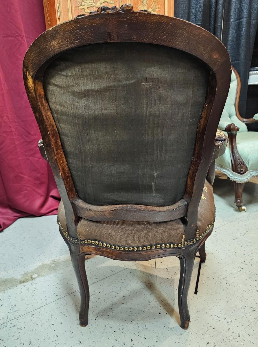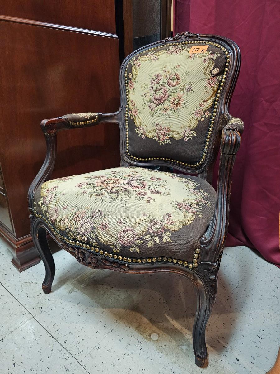 Antique Louis XV style needlepoint occasional chair with floral motif, c. 1920 24" W x 22" D x 33"H back, 16" H seat