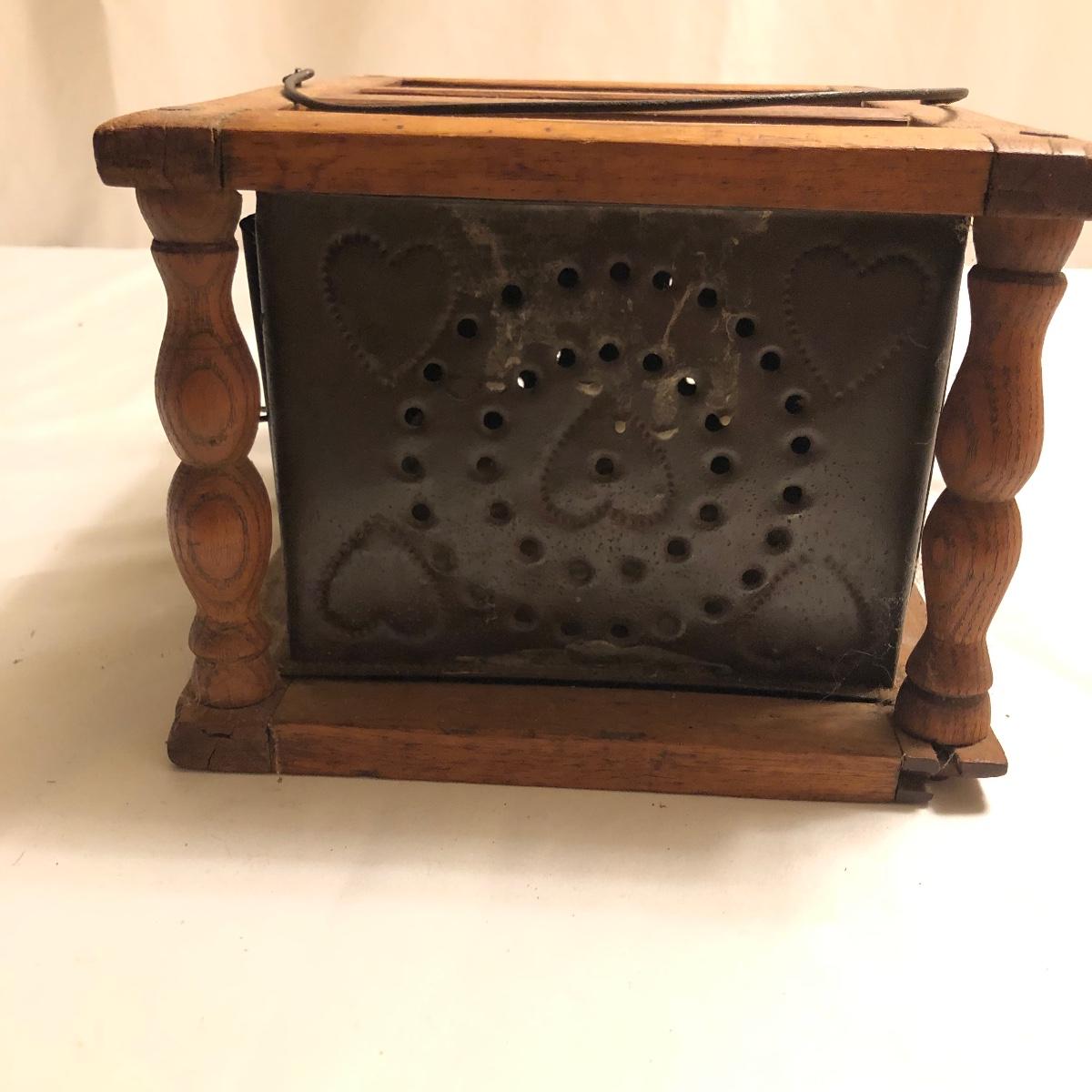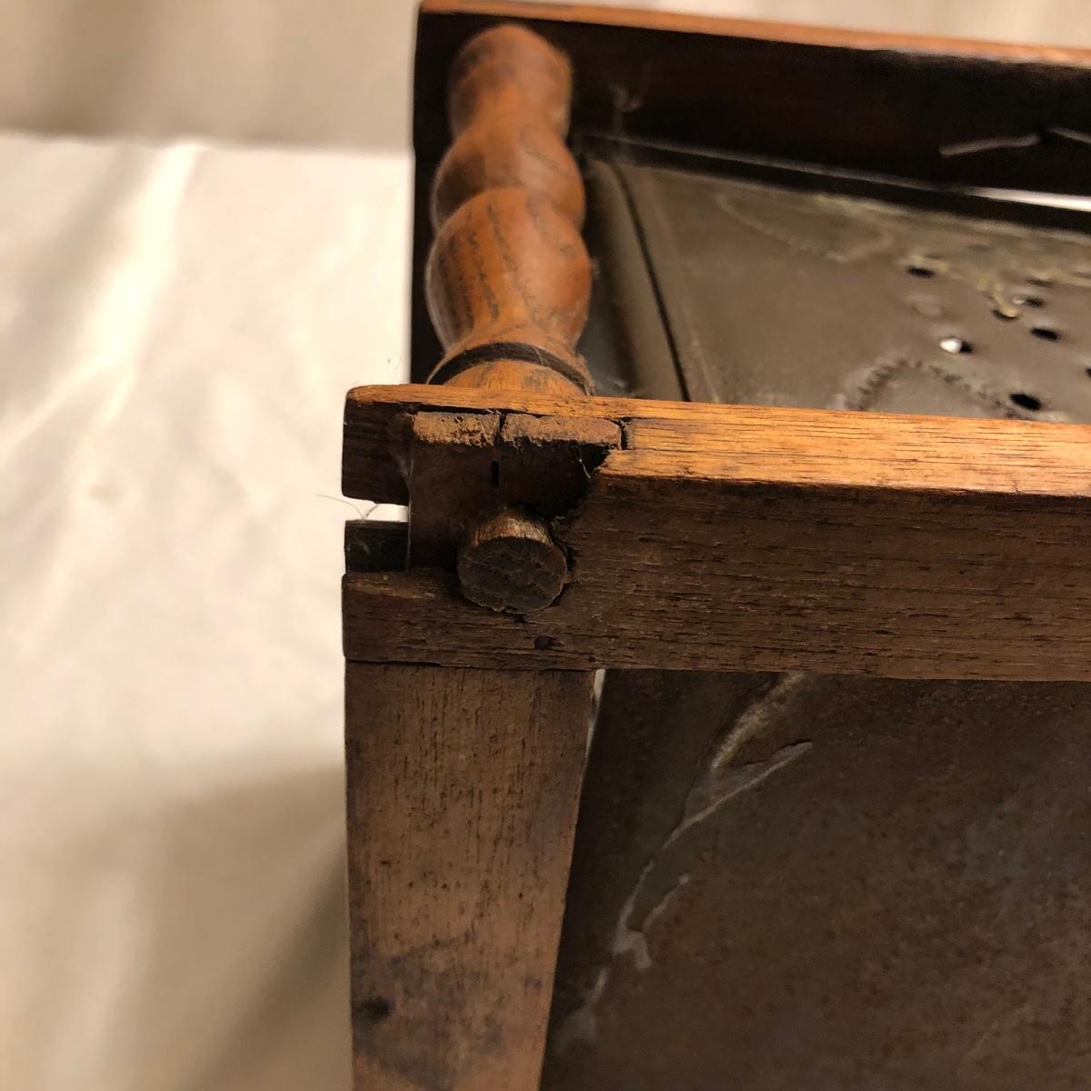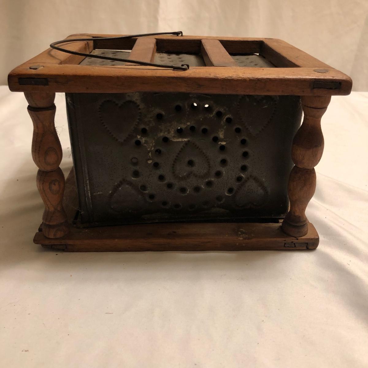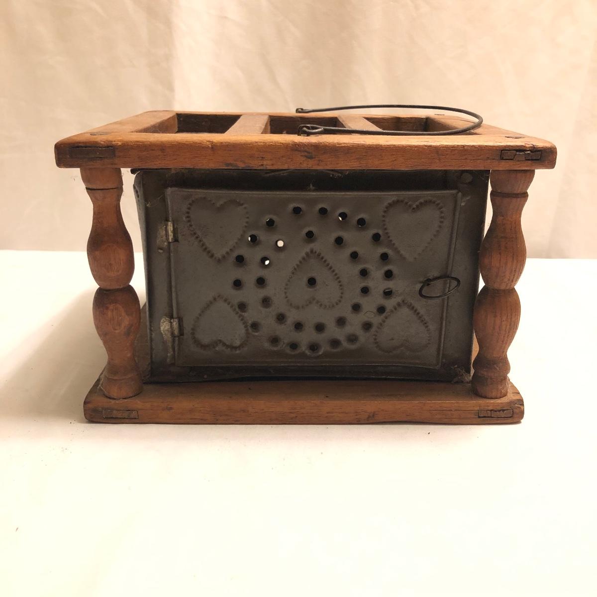 Lot includes an antique wooden New England foot warmer with a tin ember box with hole punched heart shaped and other designs. Warmer has a small piece of wood missing on bottom corner, see pictures.