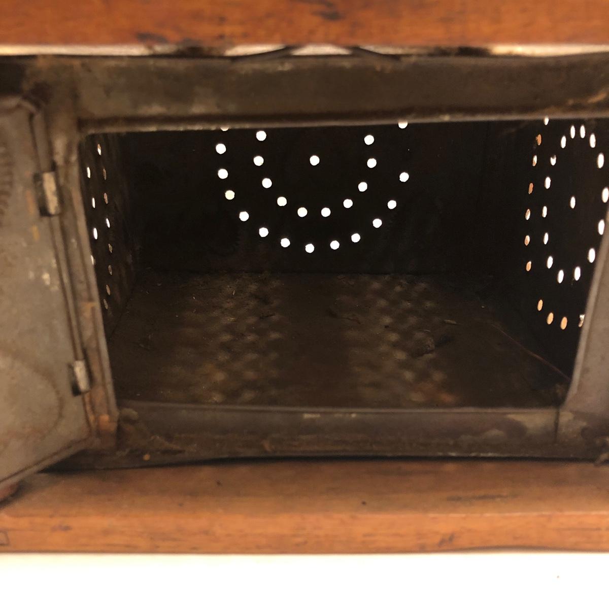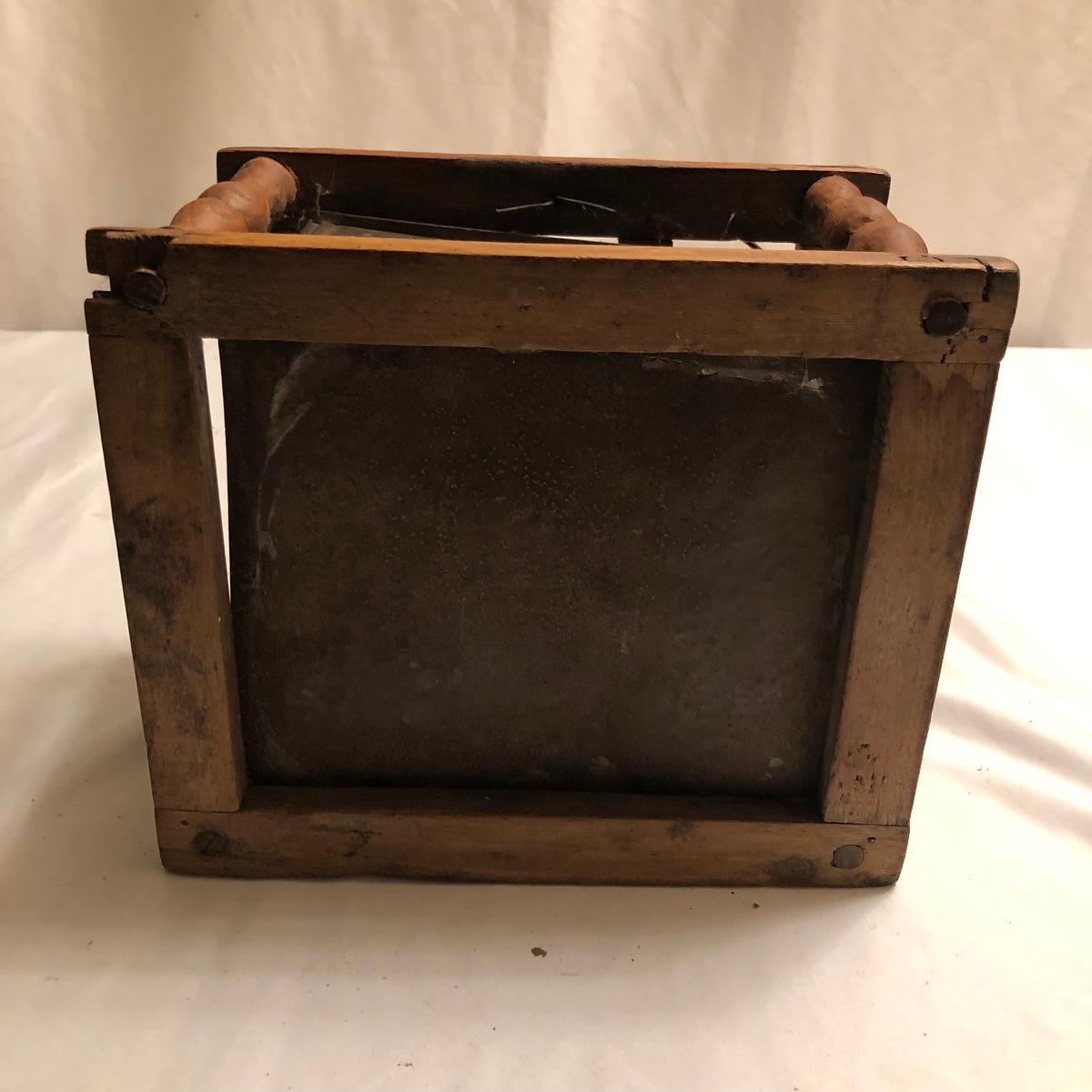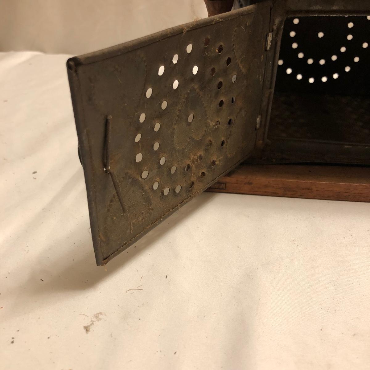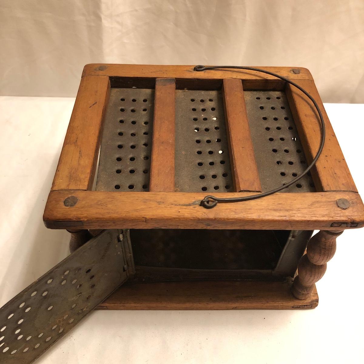 Lot includes an antique wooden New England foot warmer with a tin ember box with hole punched heart shaped and other designs. Warmer has a small piece of wood missing on bottom corner, see pictures.