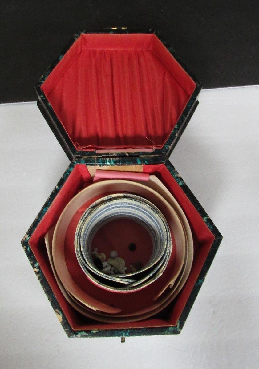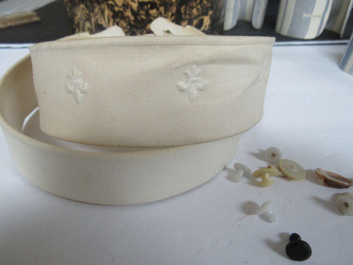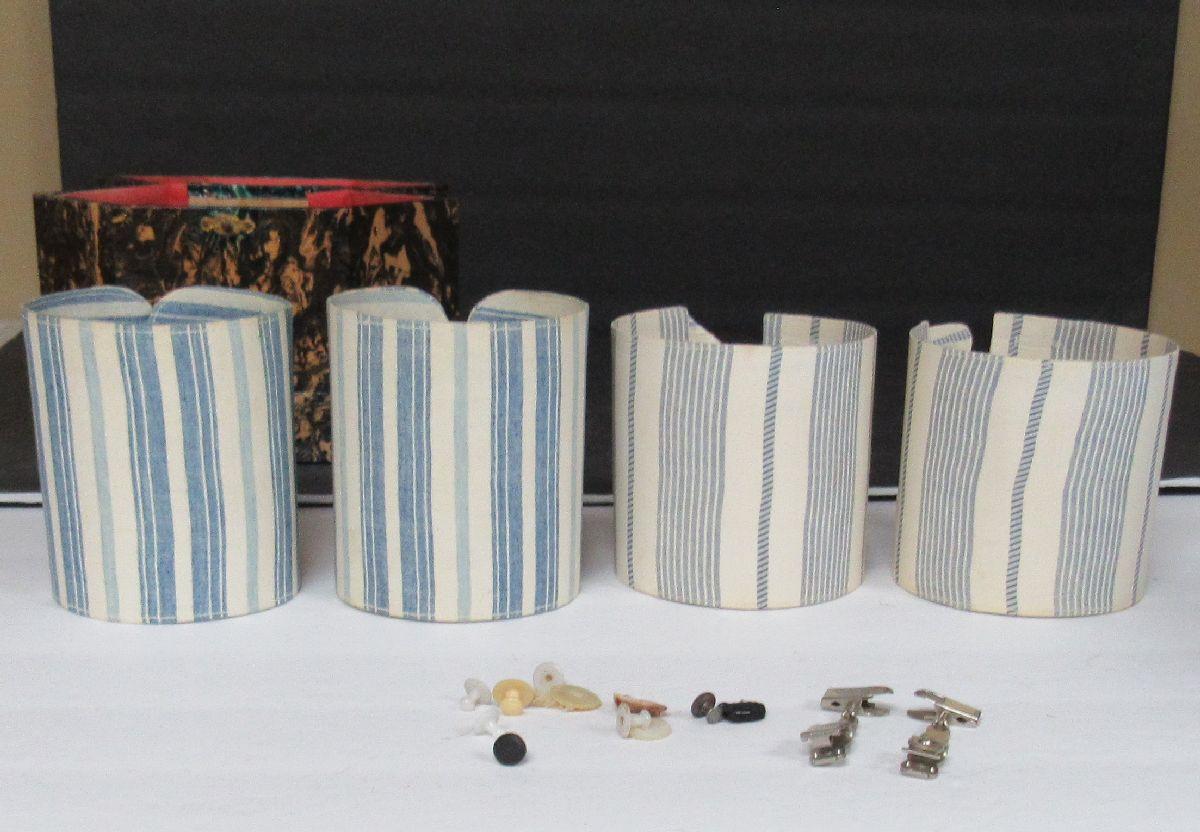The box top is embossed cuffs and collars. Unfortunately the back of the box has damage, the outer layer is peeling off and you can see the wood underneath. Would make a beautiful display piece if the back is concealed. It includes 2 off white vintage stiffened collars, one has slight staining. Also 2 sets of stiffened blue/white striped cuffs. Also some buttons and clips are included. You don't often see these old sets around and are pricey when found with original box! Shipping is available at shipping cost plus $5.00 handling fee on one box, $10.00 handling fee on two boxes, $15.00 handling fee on 3 boxes. Helps cover shipping materials and labor cost.