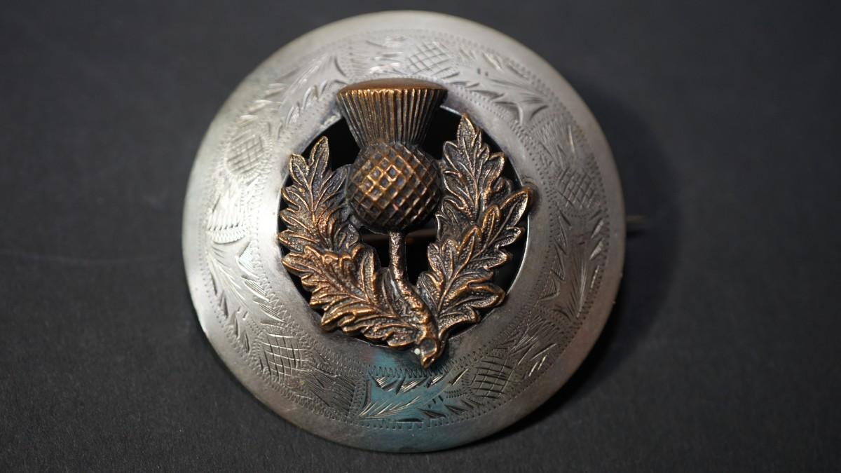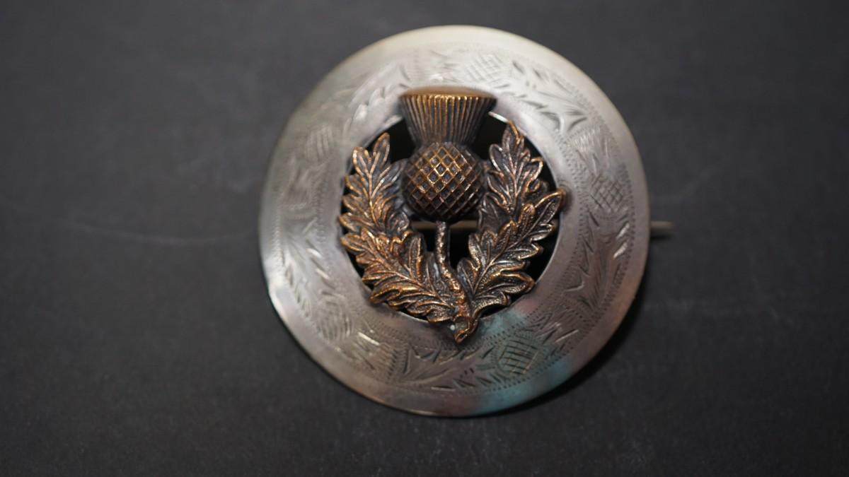 Approximate 2 1/2" round engraved brooch with copper over nickel silver applied thistle with branch of leaves.