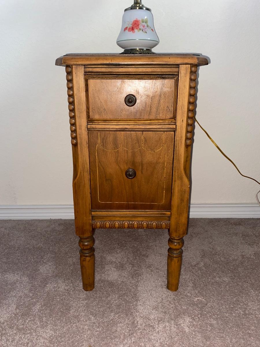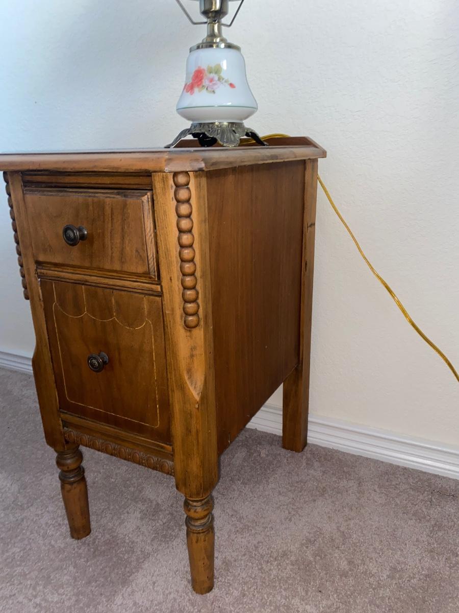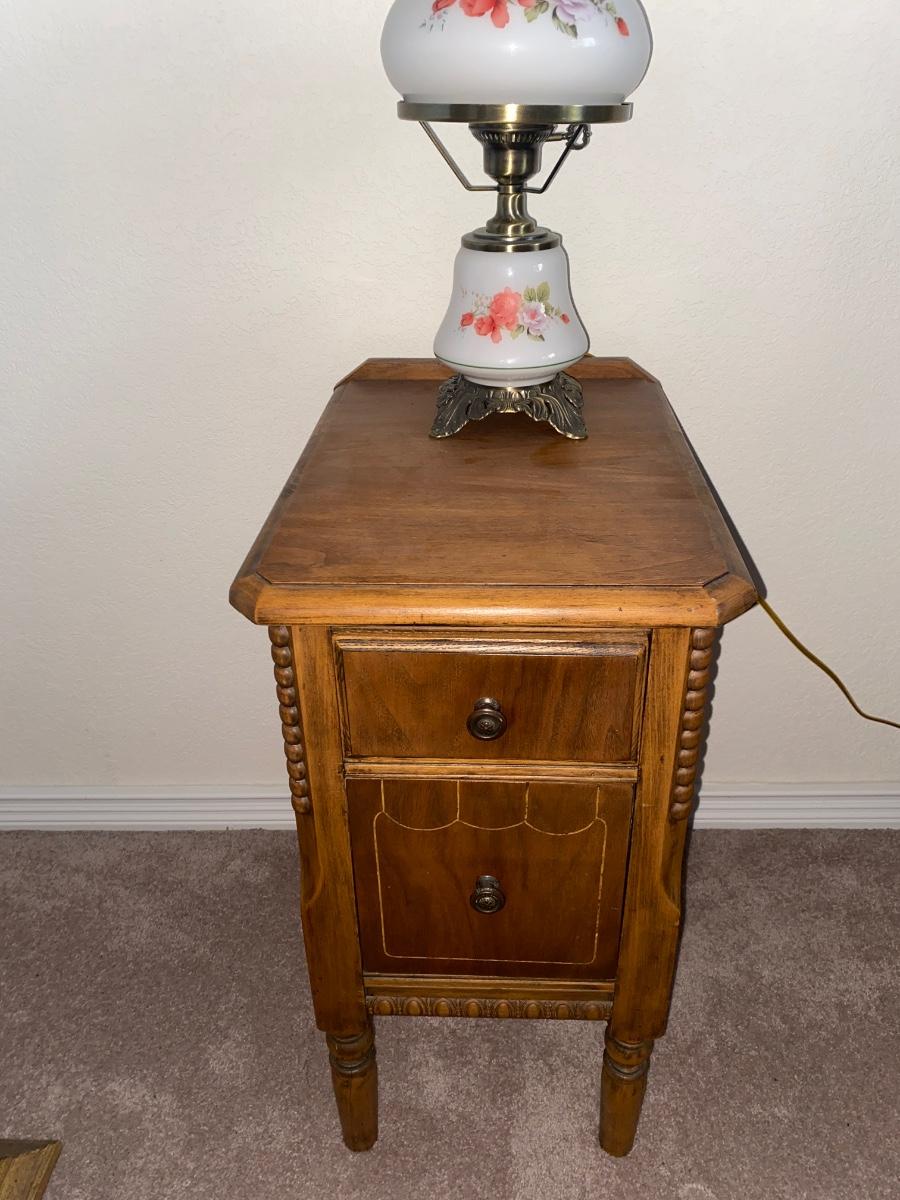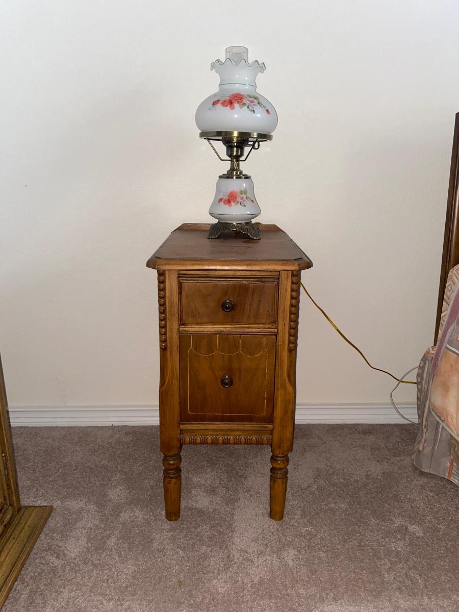 ANTIQUE 2 DRAWER NIGHT STAND AND GLASS GLOBE LAMP (1of2)