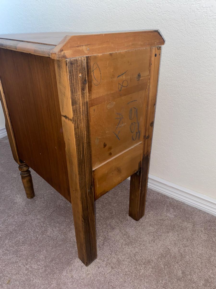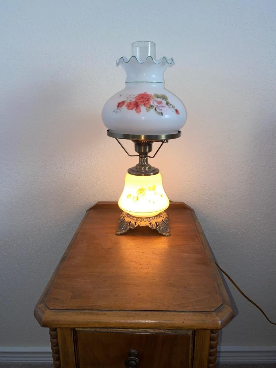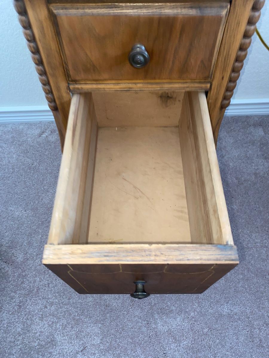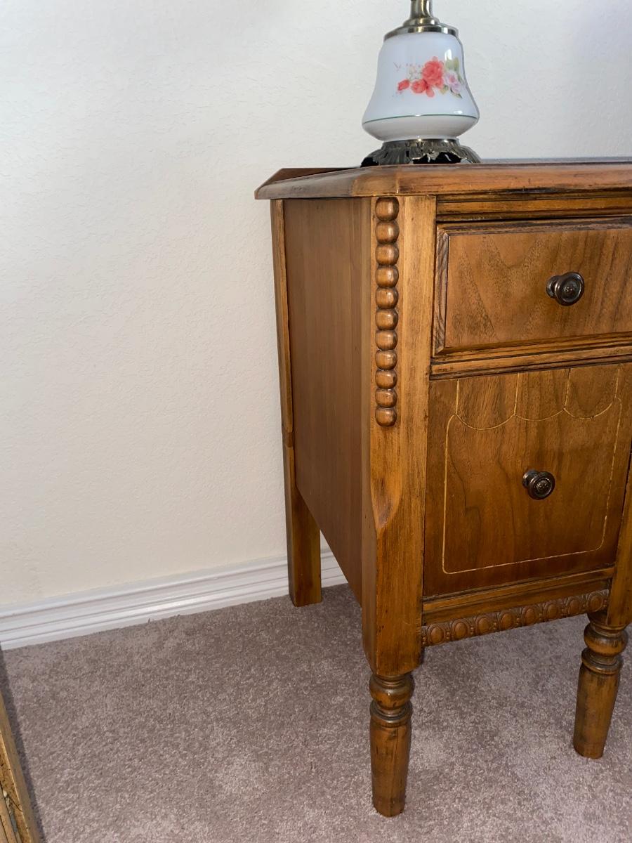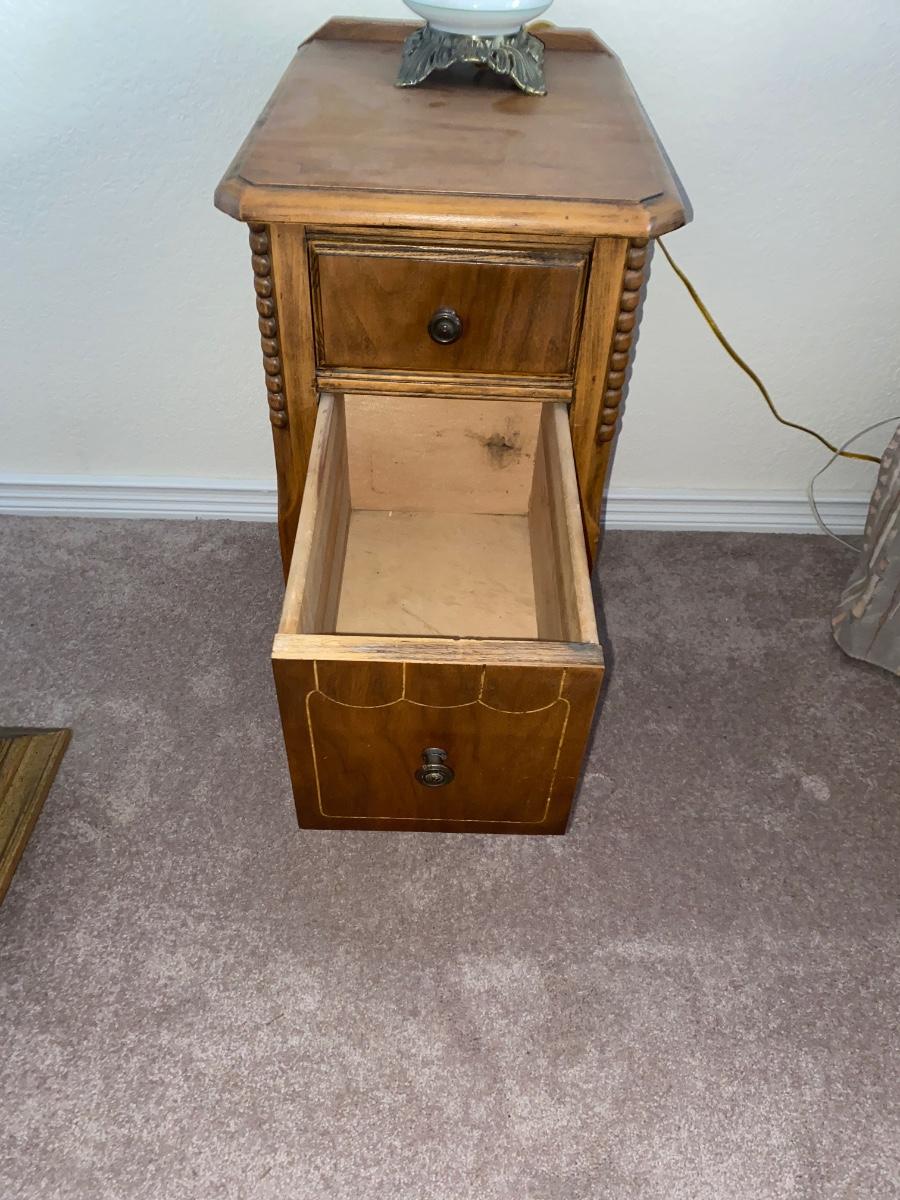 ANTIQUE 2 DRAWER NIGHT STAND AND GLASS GLOBE LAMP (1of2)