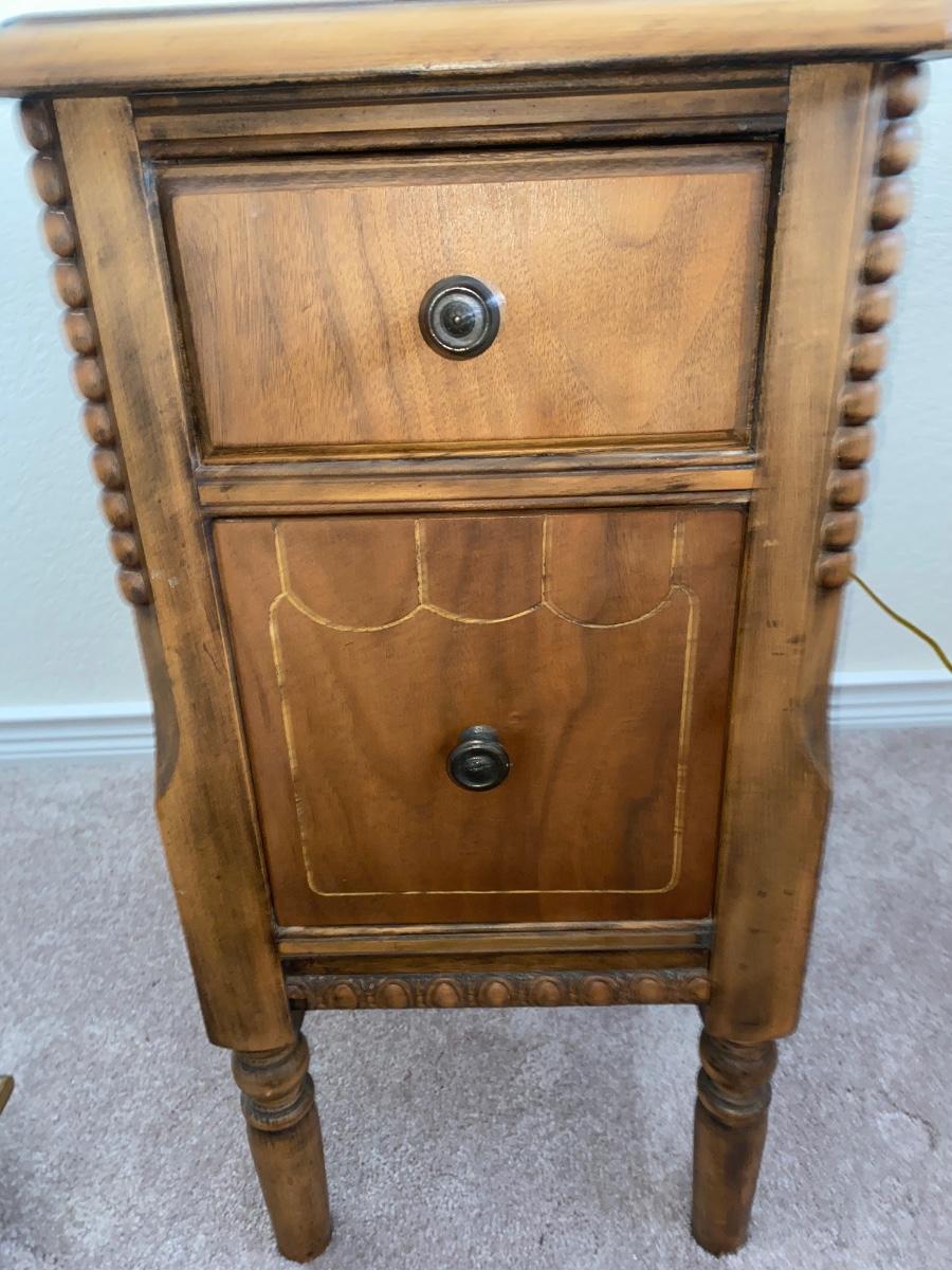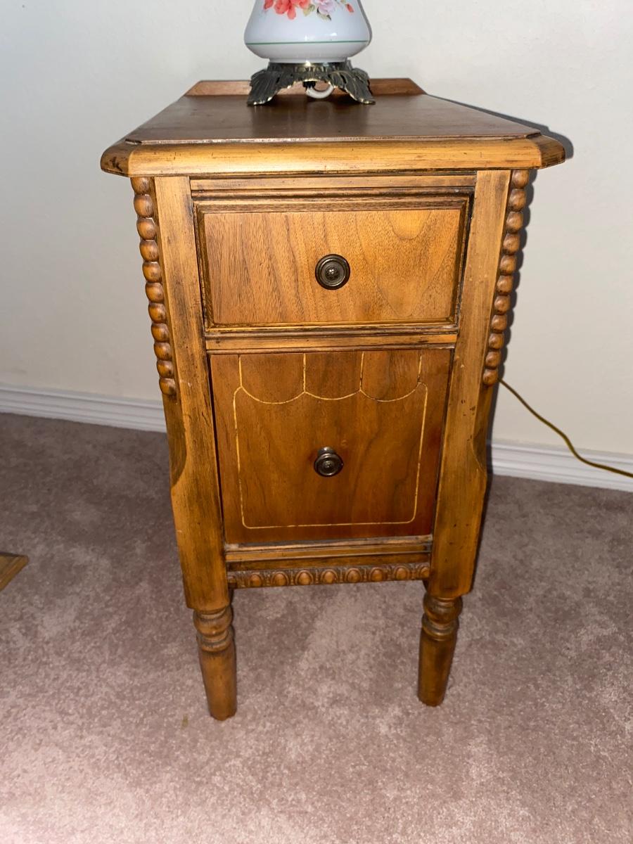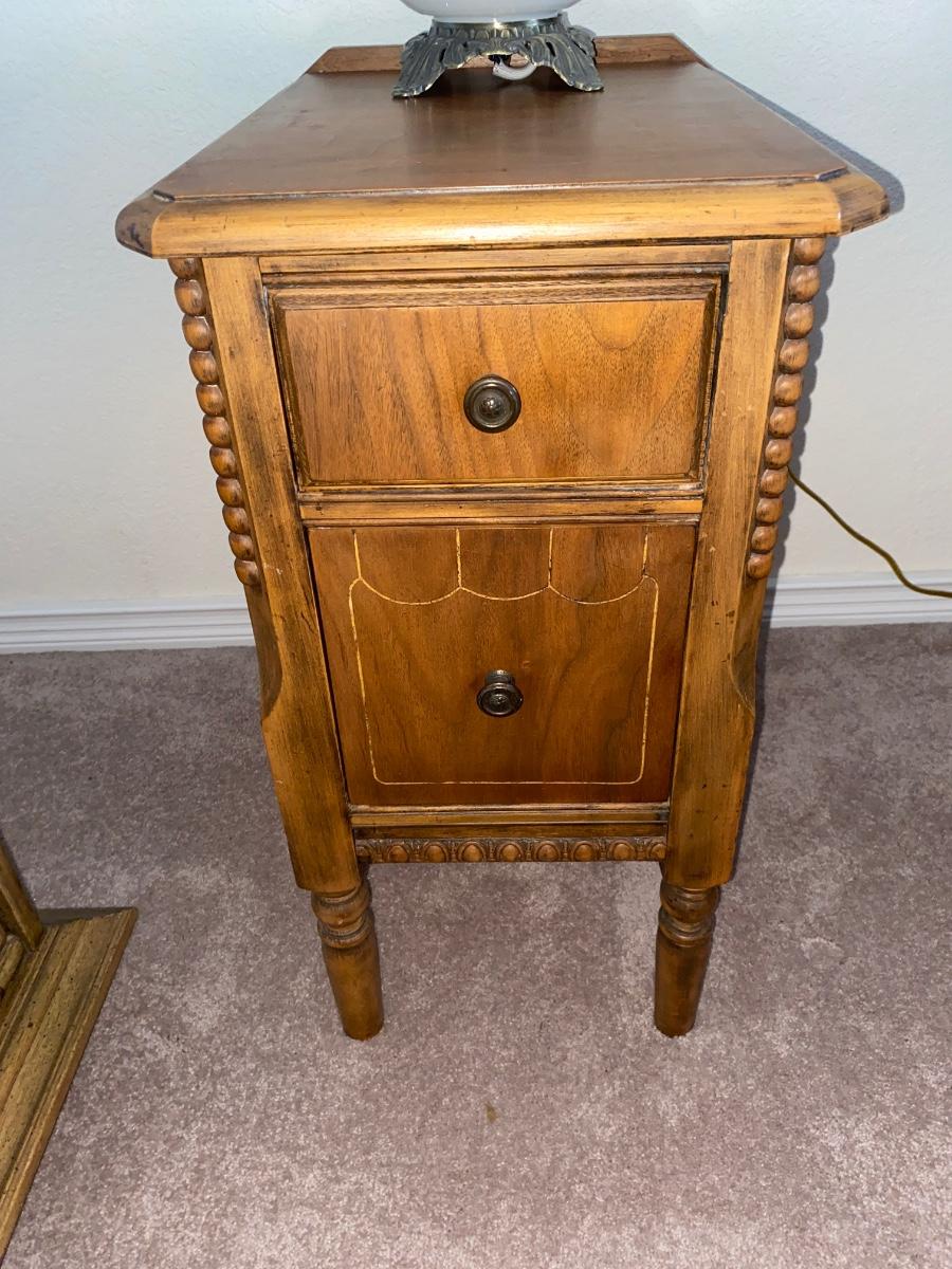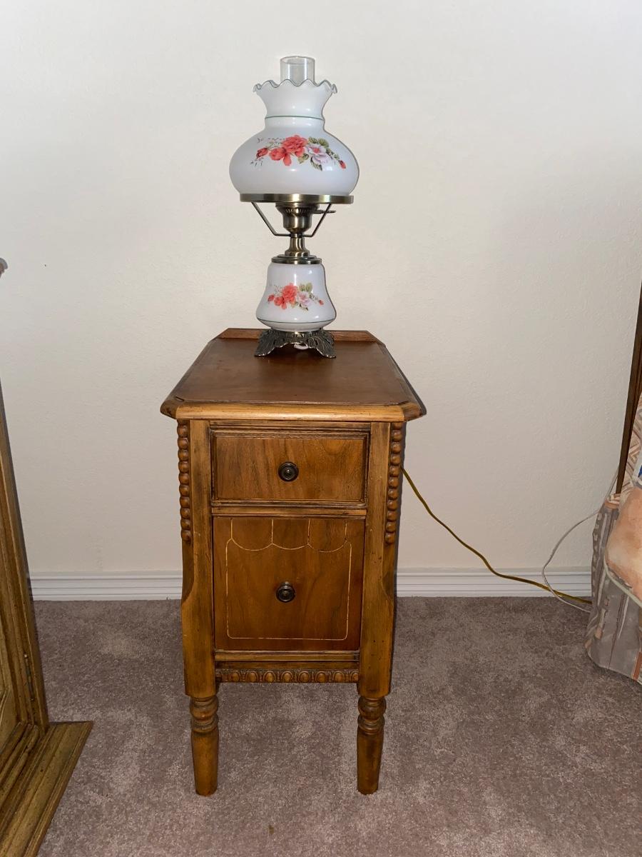 ANTIQUE 2 DRAWER NIGHT STAND AND GLASS GLOBE LAMP (2of2)