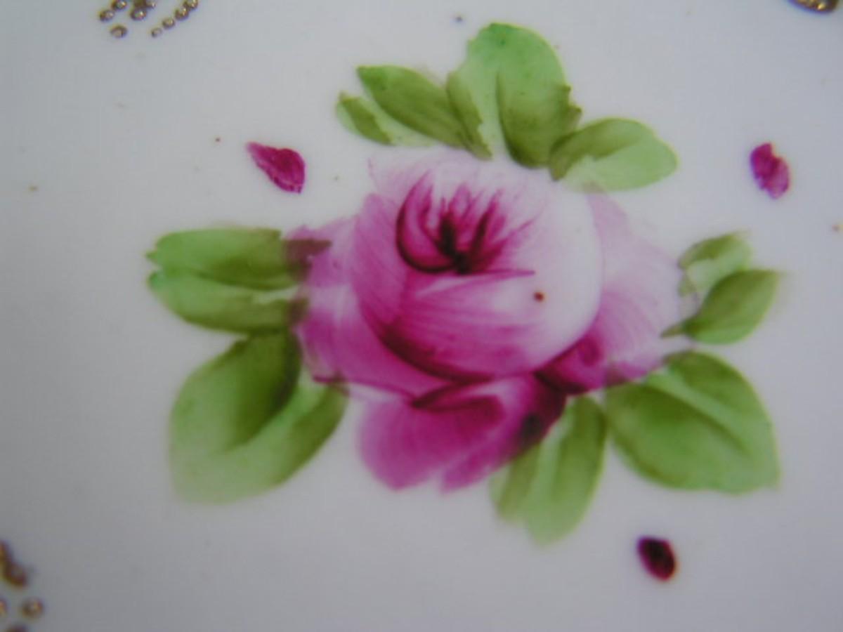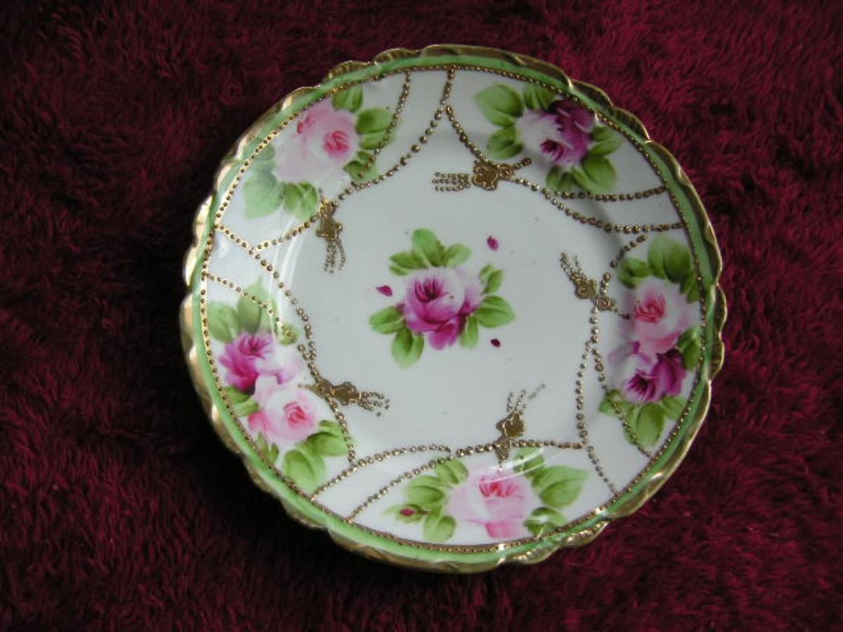 Antique Nippon hand painted porcelain believed to be pre 1900. Gold rim and beading, pink roses. About 6-3/8" dia.