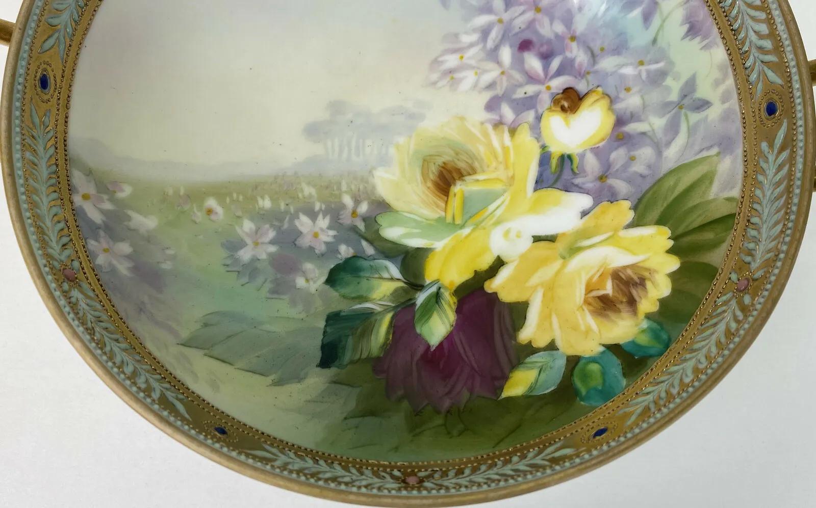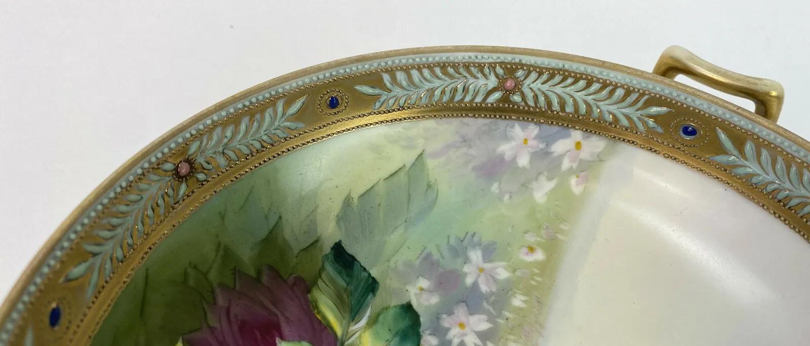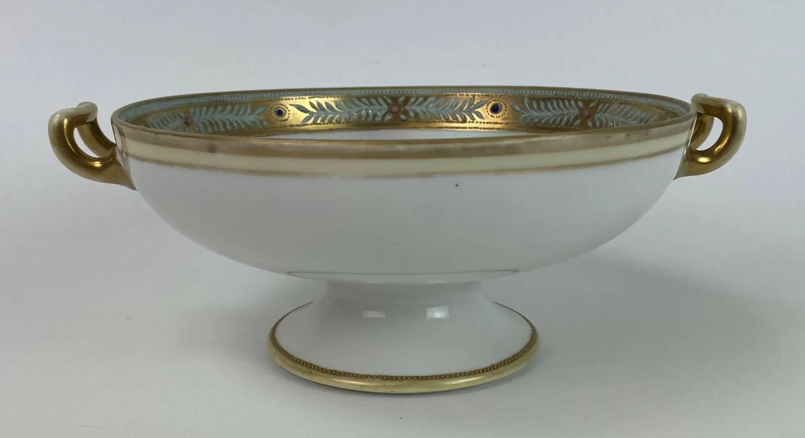 Here is a 7 x 3" tall hand=painted pedestal bowl that bears the Nippon Morimura mark made in Japan circa 1911-1921 I believe...No chips..some wear on gilt handles..I found two tight hairlines on one side.