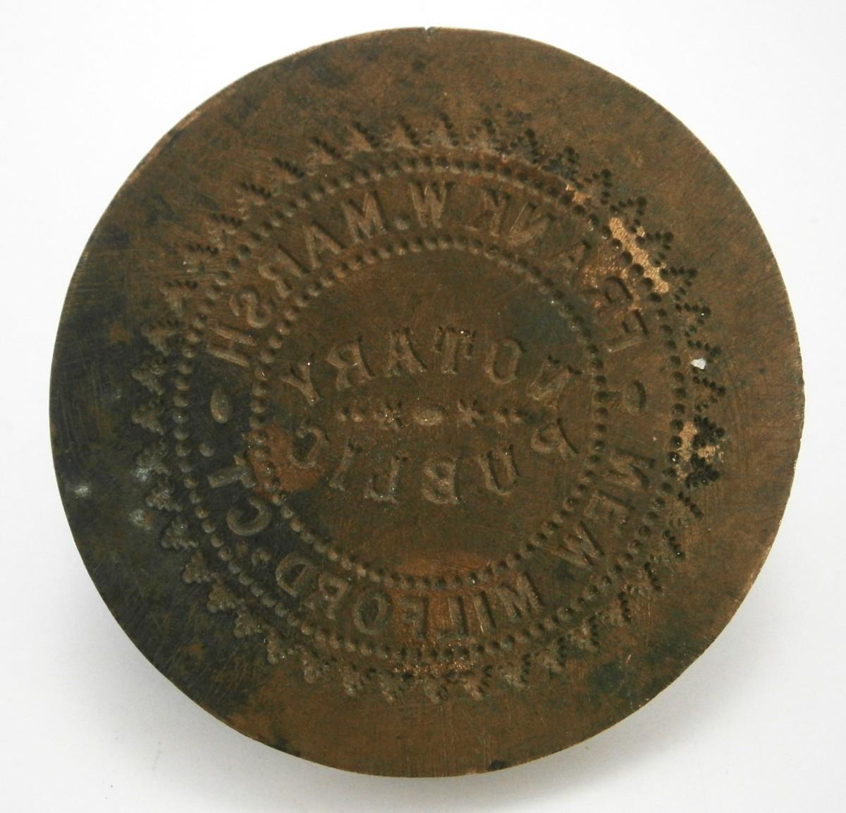 Antique NOTARY PUBLIC Seal Insert for FRANK W MARSH, New Milford, Ct., 2 1/8 in. diameter, cast brass.