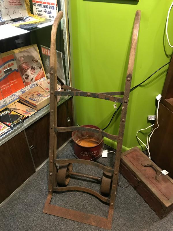 Very heavy duty antique oak and iron barrel dolly. Curved back to fit barrels. Iron wheels. Original patina. Very good usable condition. 20" x 20" x 49" H