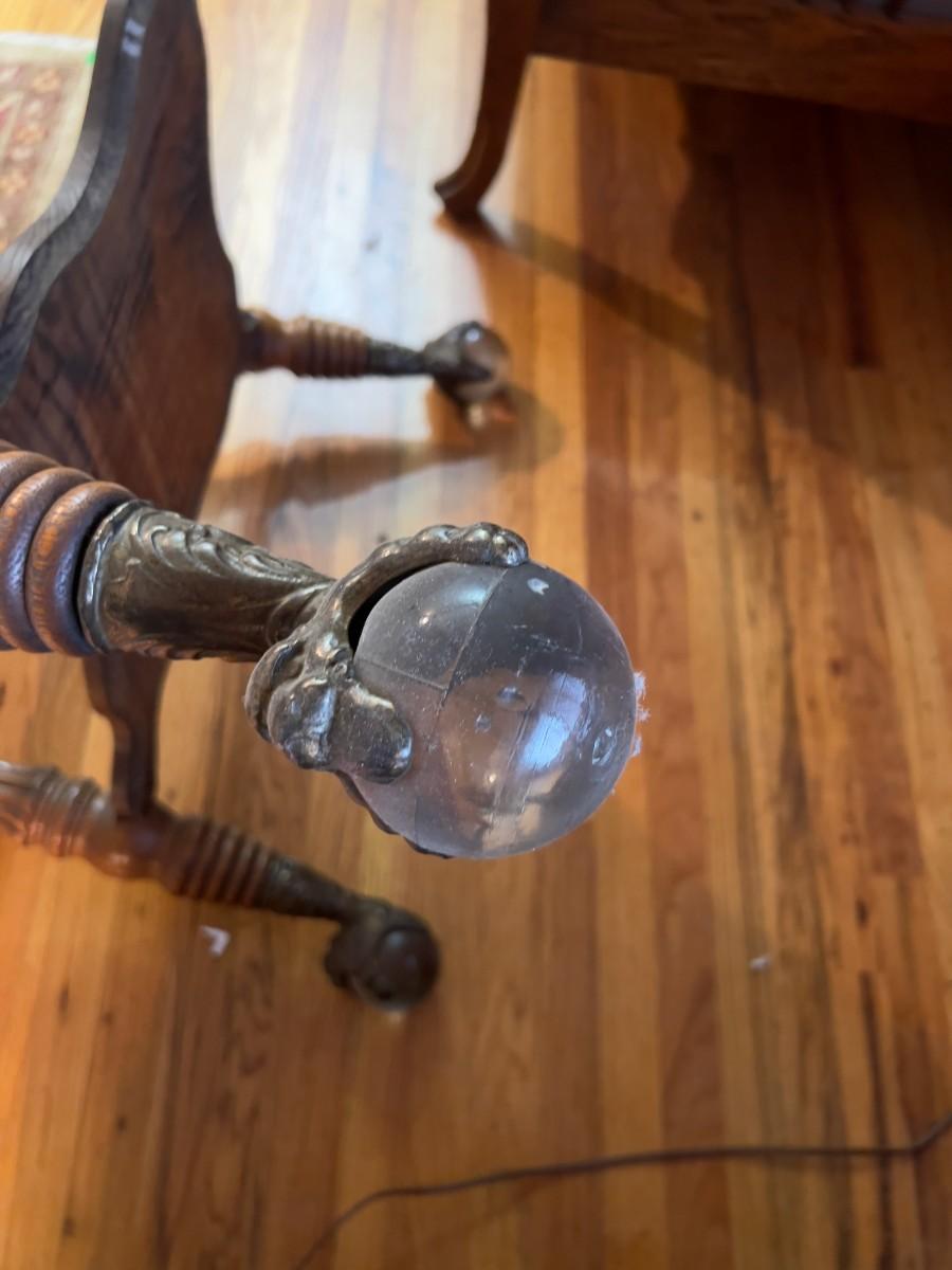 Refinished in the last 30 years. GOOD Condition. 27" Square by 28" Tall. Glass Balls are 3" Diameter.