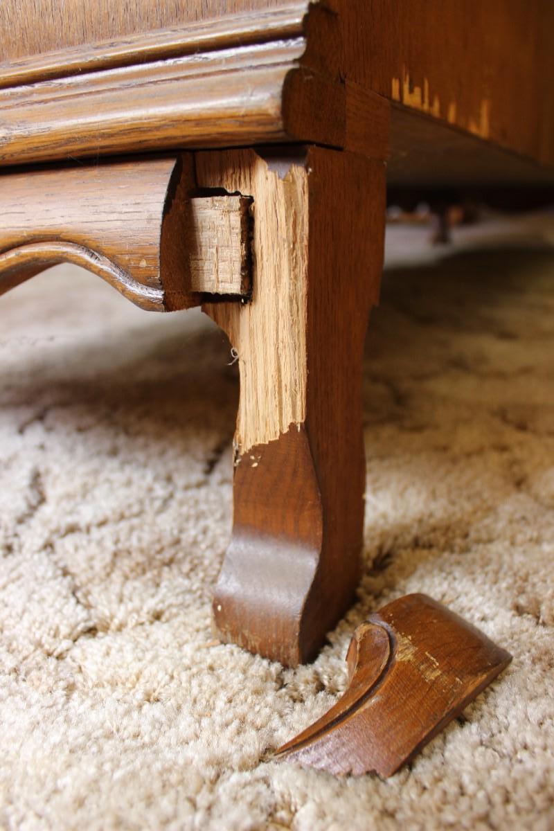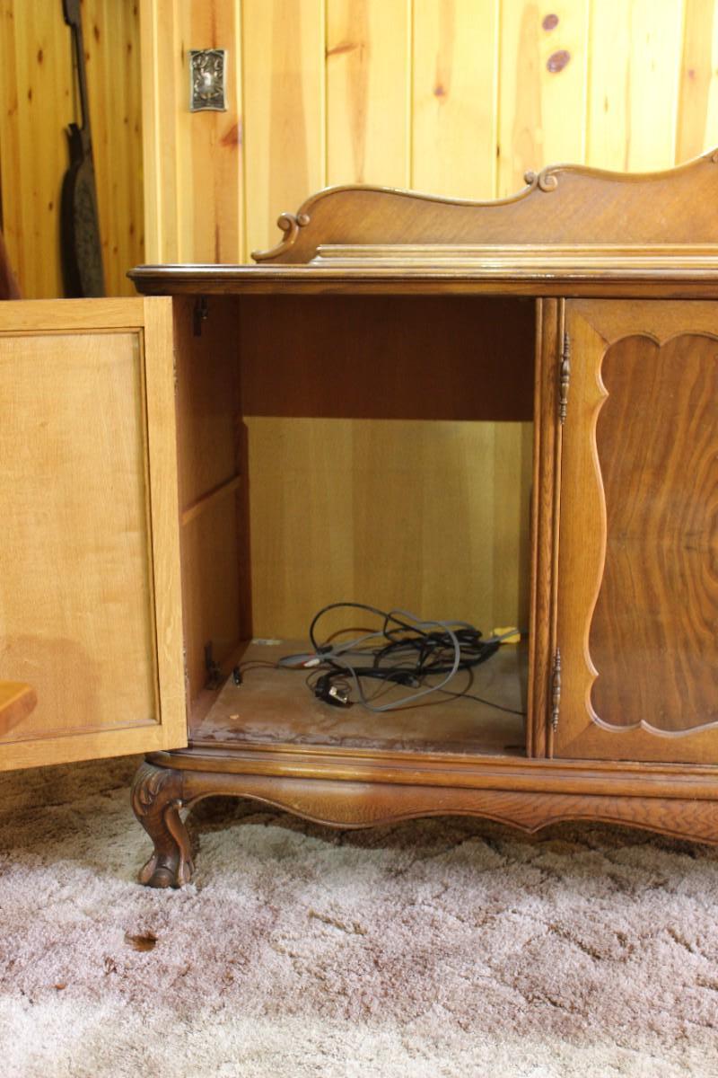 Antique oak buffet cabinet. Drawers on one side, single shelf in the center, full open space on other side. Back leg has some damage but it looks cosmetic not structural. LOCAL PICK UP IN ANGELUS OAKS.
