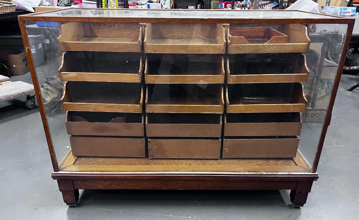 Impressive! Super Cool for a collector to display and organize Collection. Old Good Condition and still usable for a commercial retail space. Measures: 24 x 36 x 49" Bring 2 Adults to move and a proper vehicle to move it in. Its Large and Heavy.