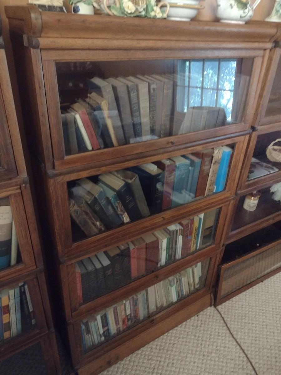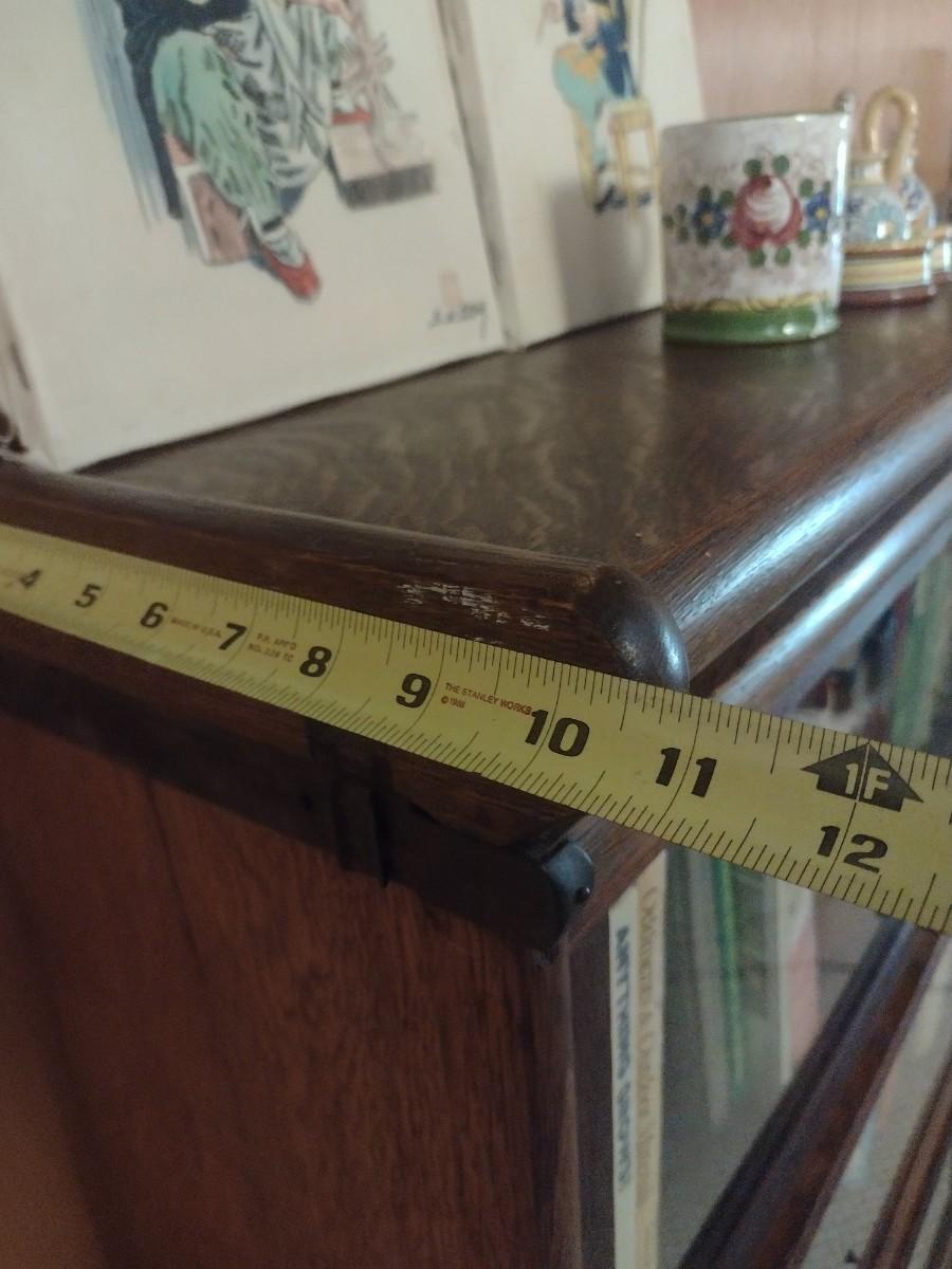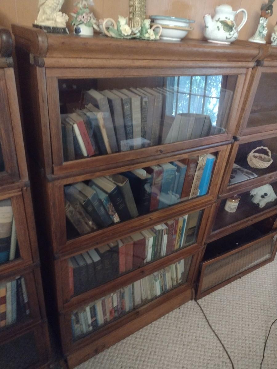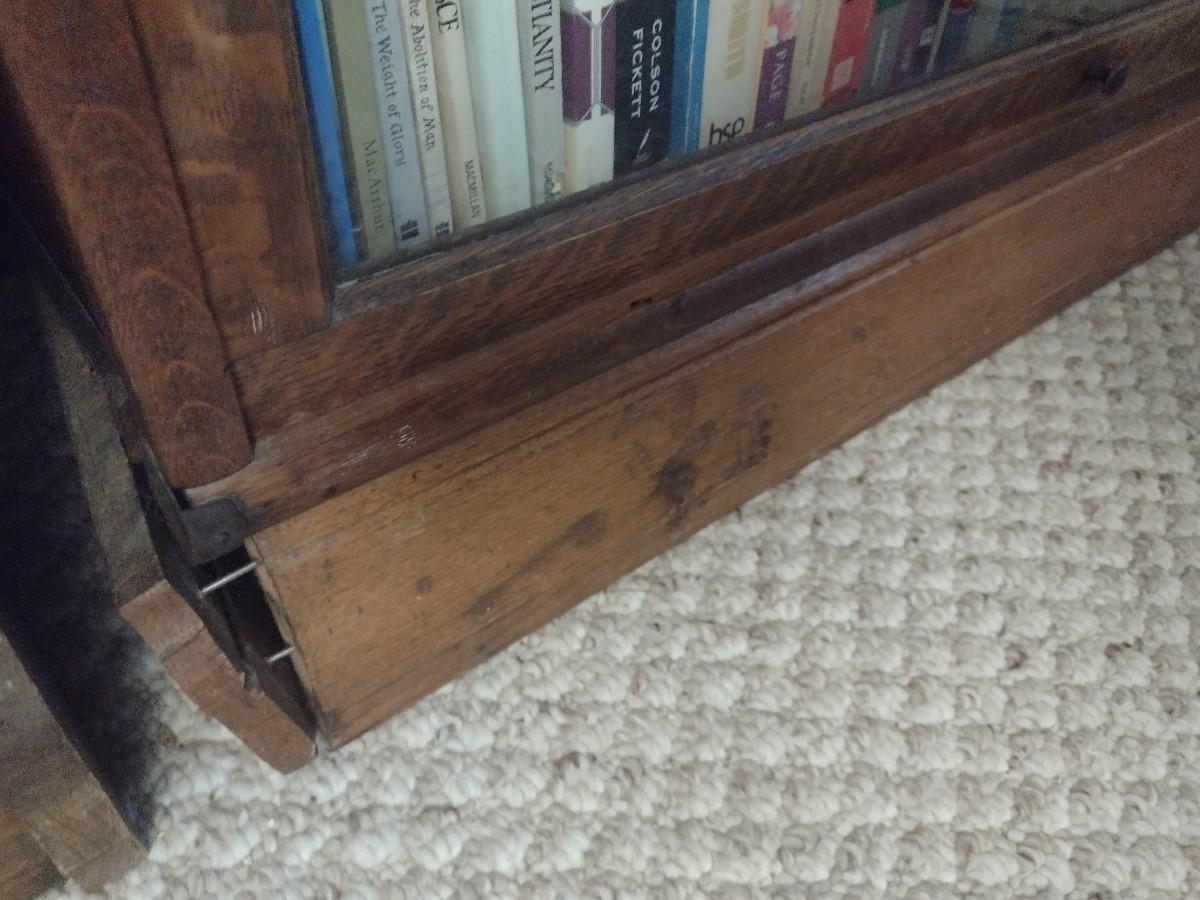 Antique Oak Globe-Wernicke Stack Barrister Cabinet Choice B (No Contents) Base toe mold has separated as shown.