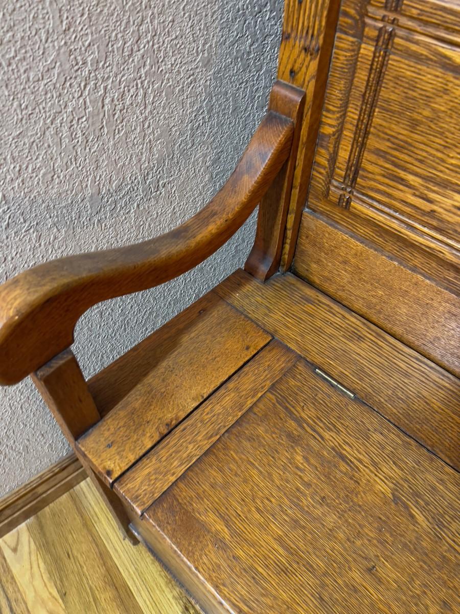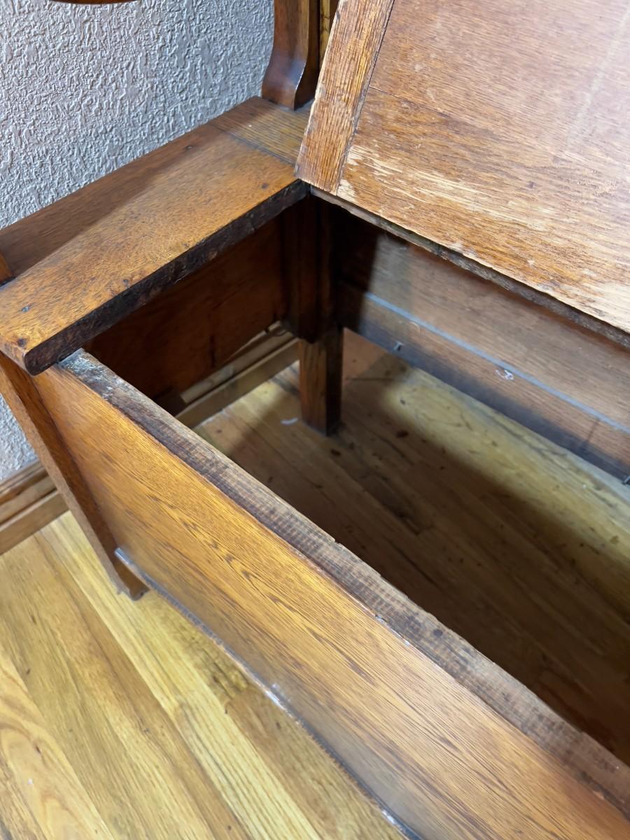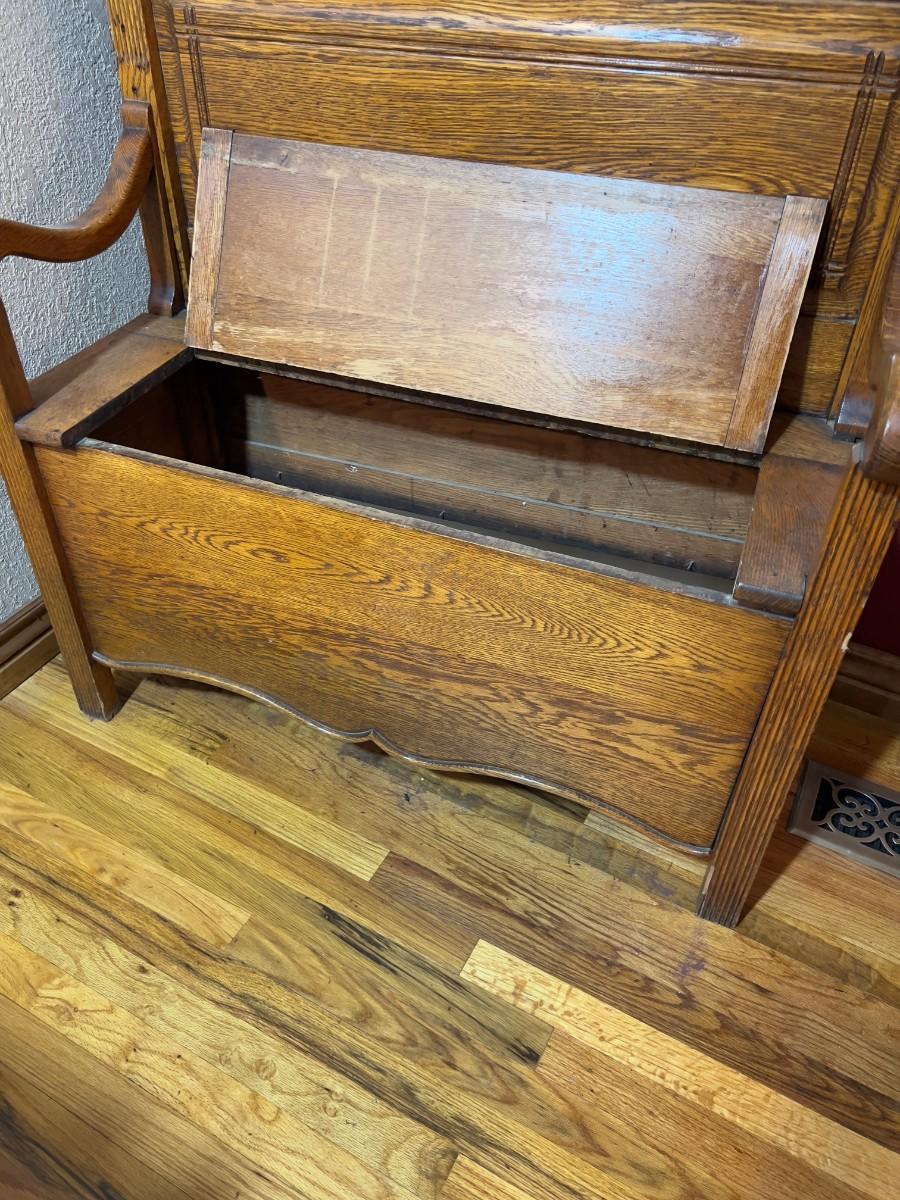 Circa 1890, refinished at some point in the last 40 years, no bottom in the bench box. 36x85" 16" deep on the bench