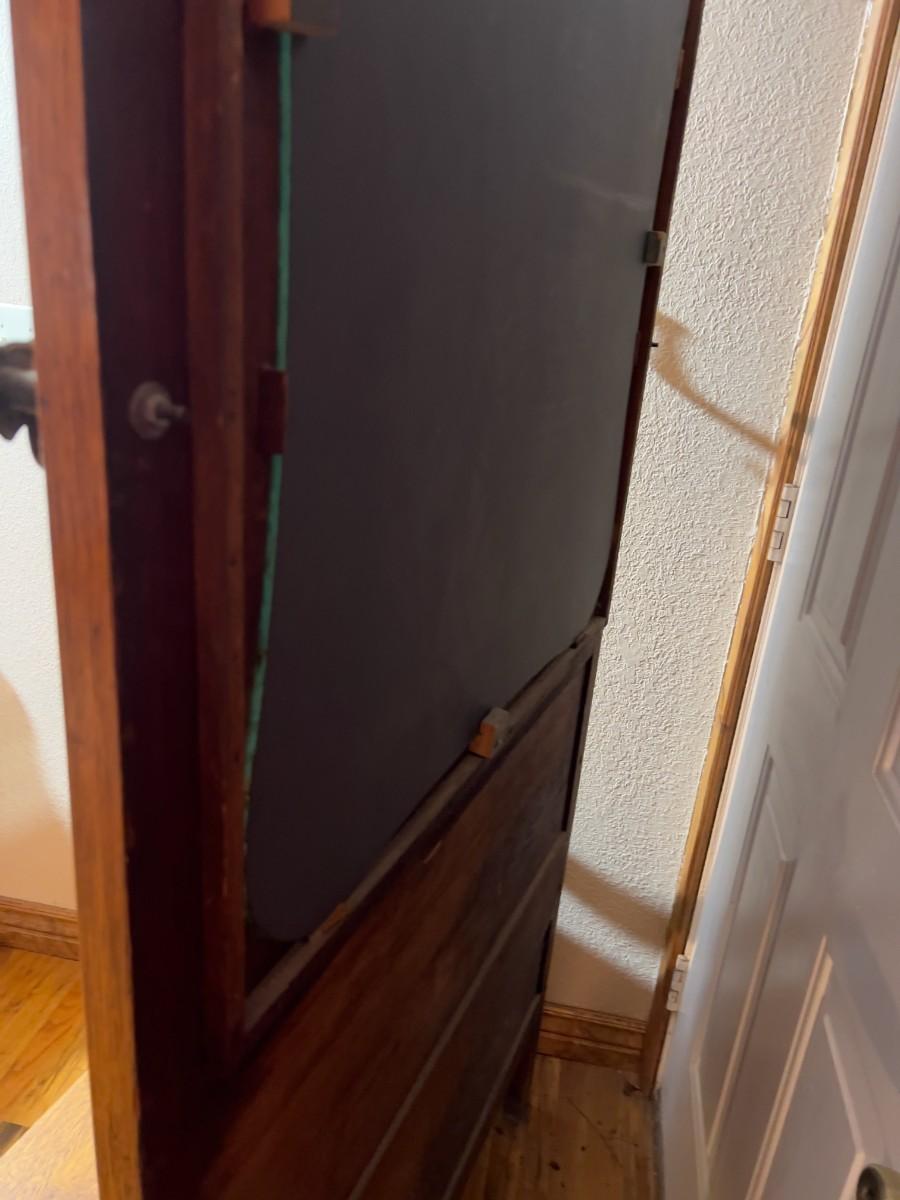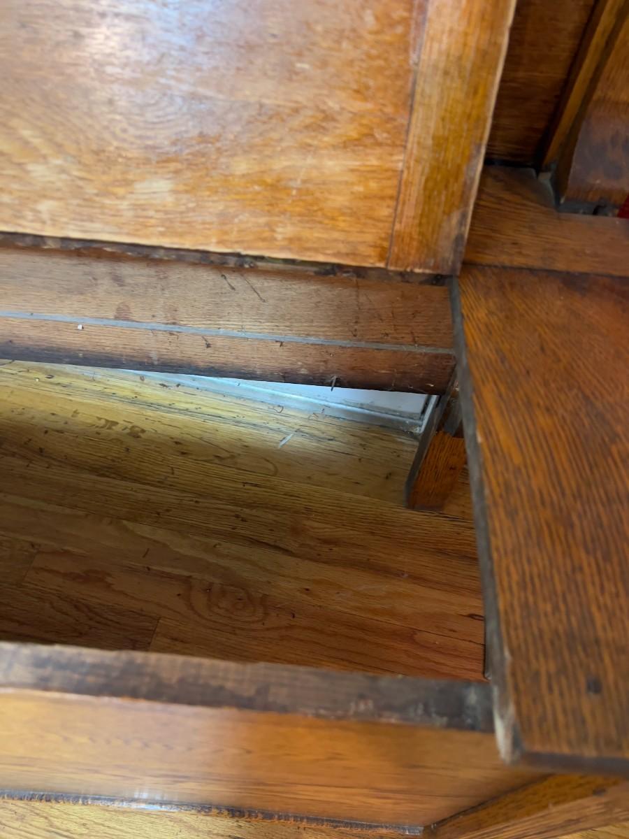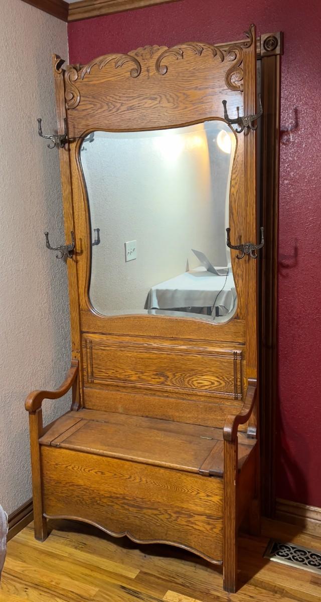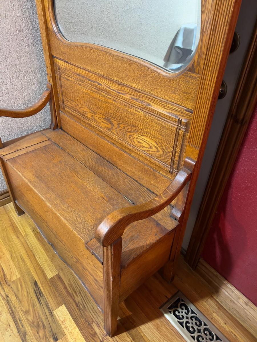 Circa 1890, refinished at some point in the last 40 years, no bottom in the bench box. 36x85" 16" deep on the bench