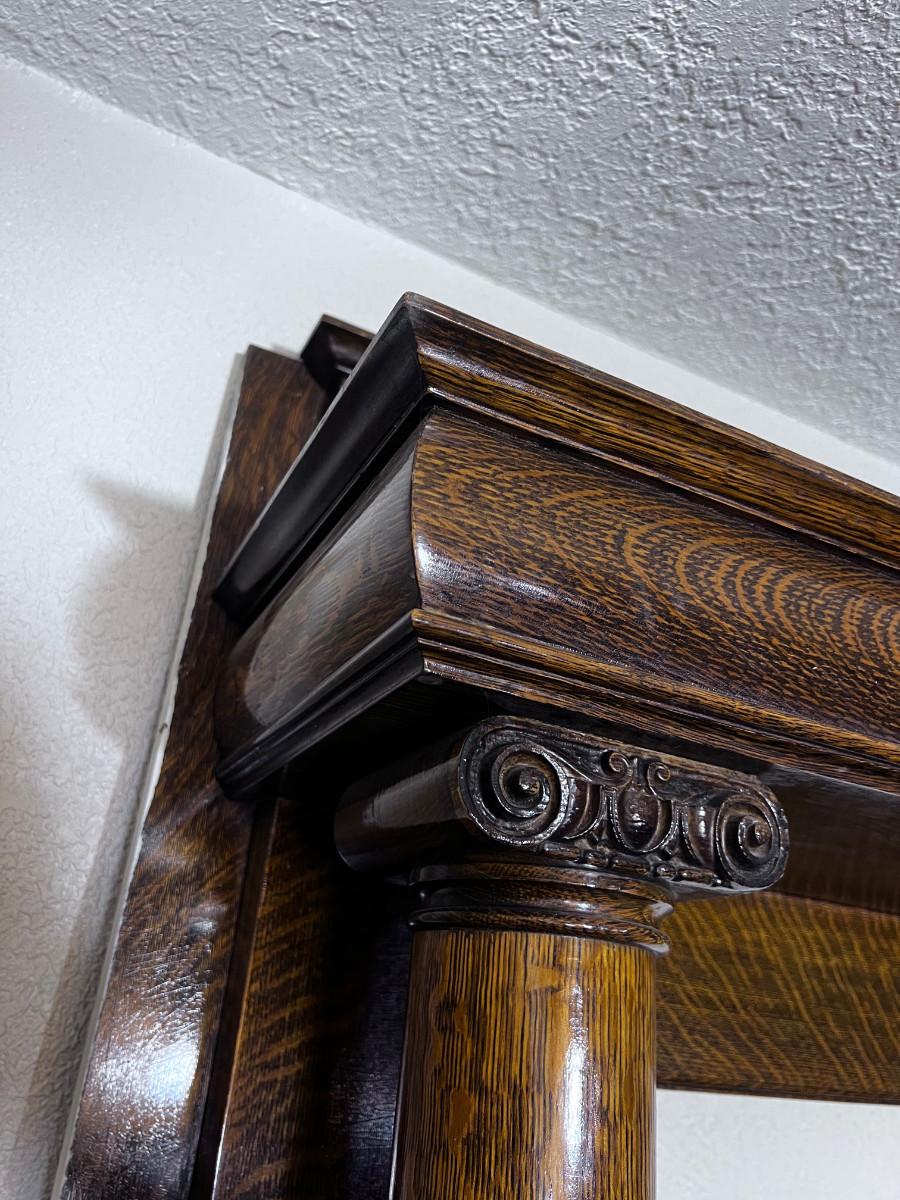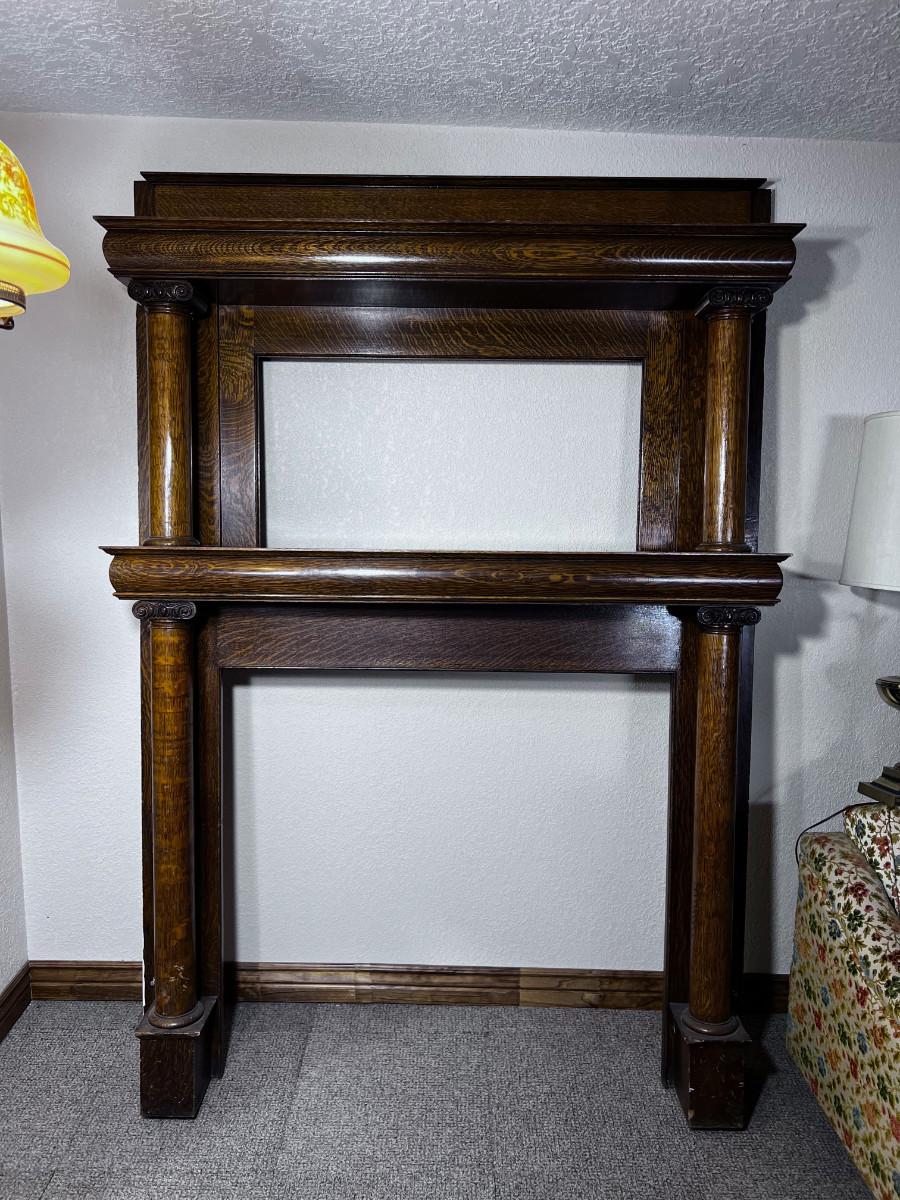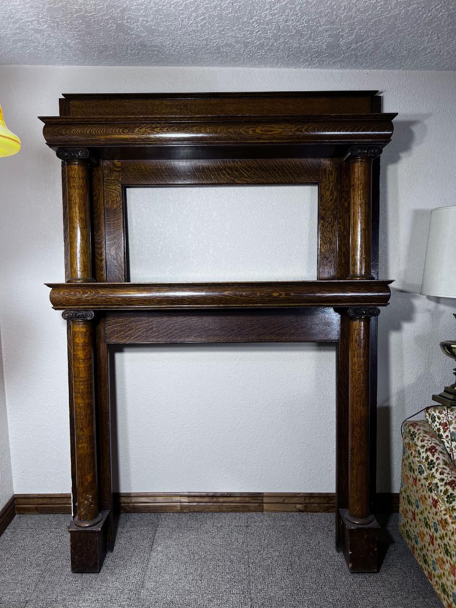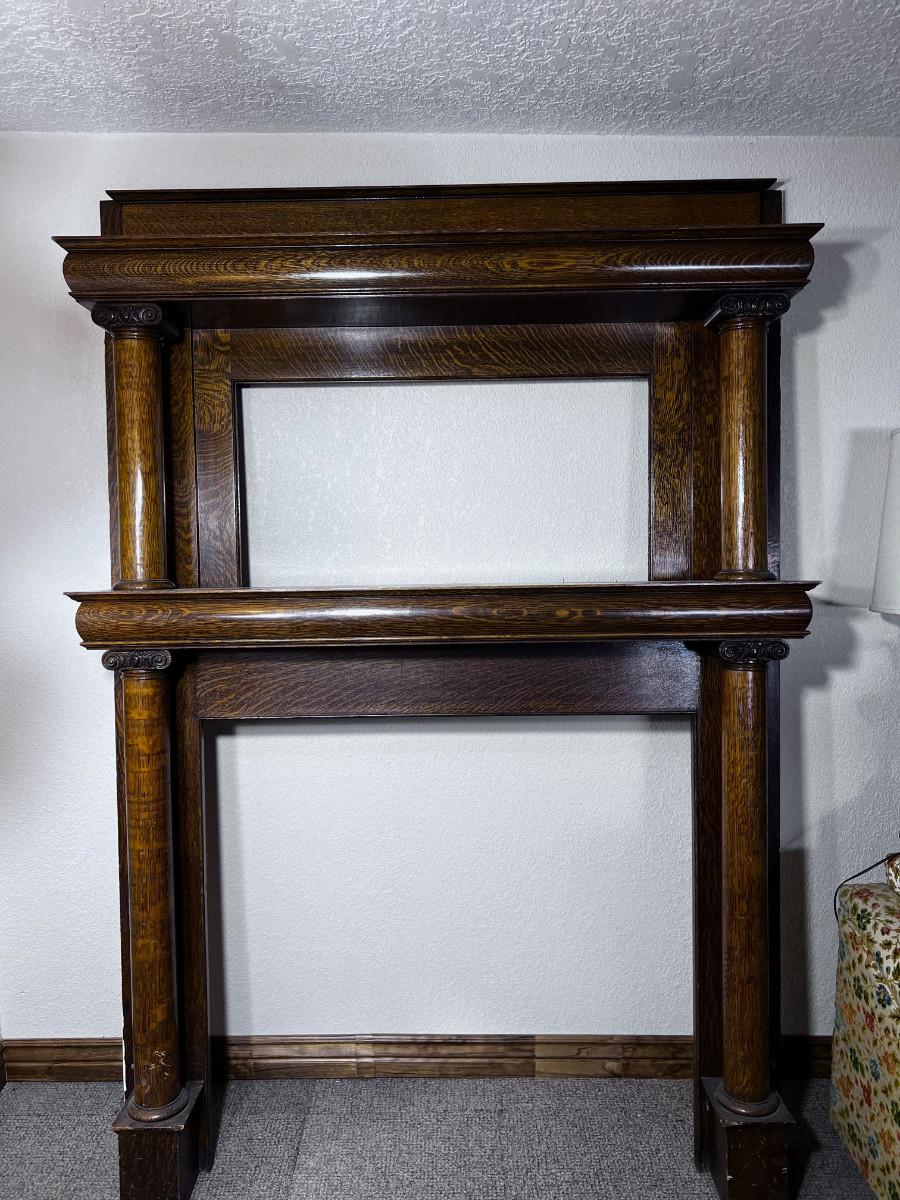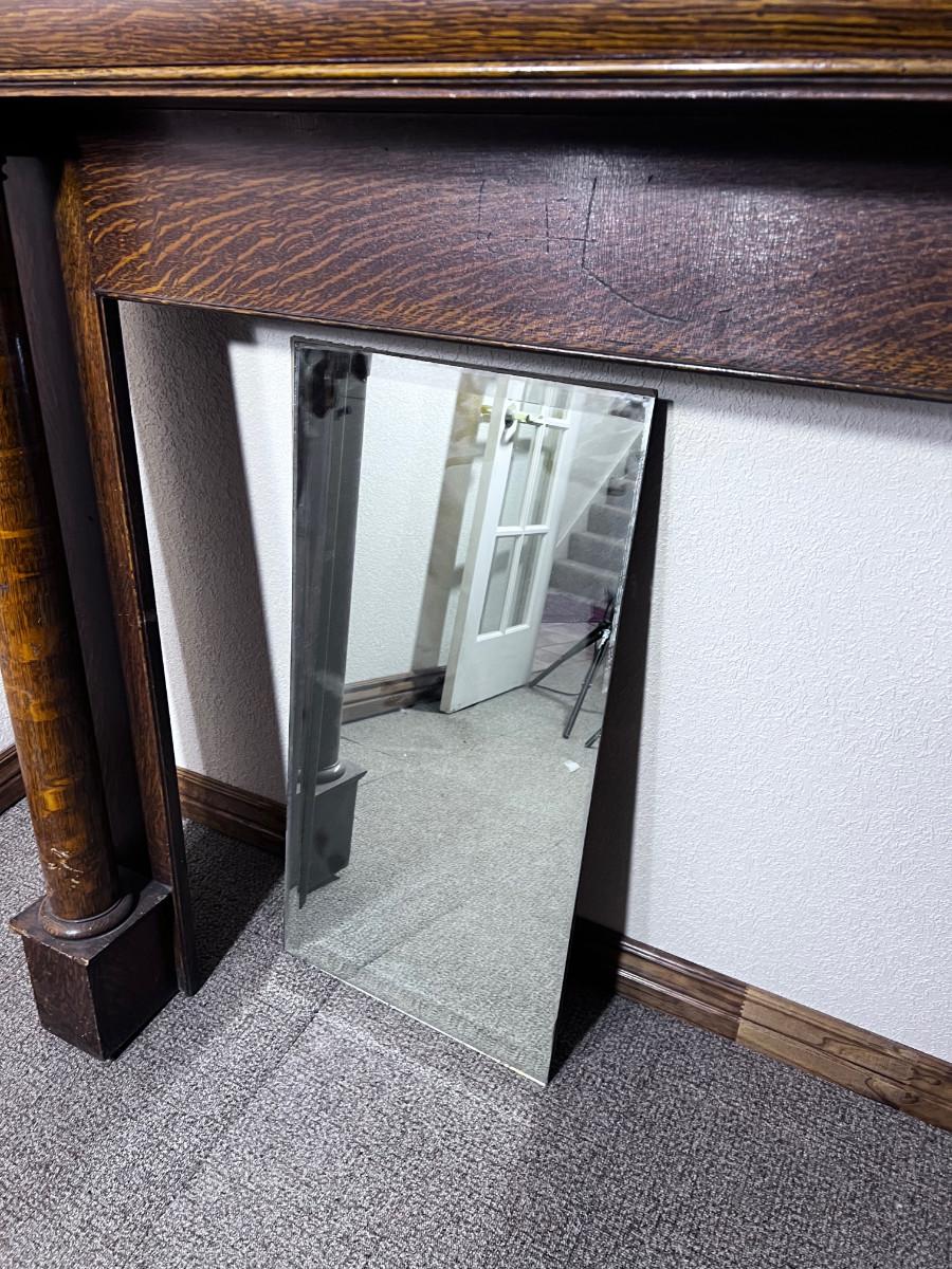 Great old mantle looks like original finish, Beveled mirror included.Please bring loading help. 58" wide, 83" tall, 51" to top of mantle piece.
