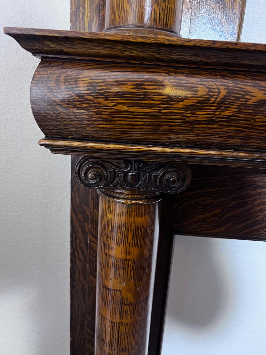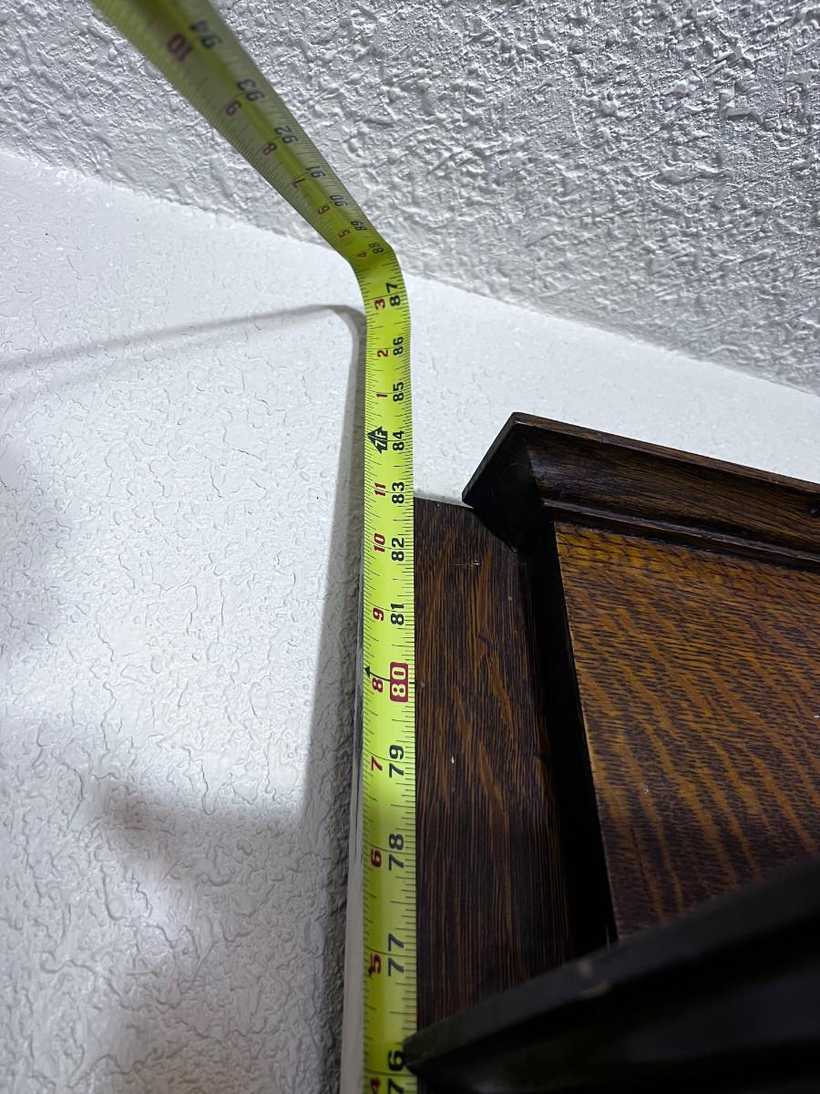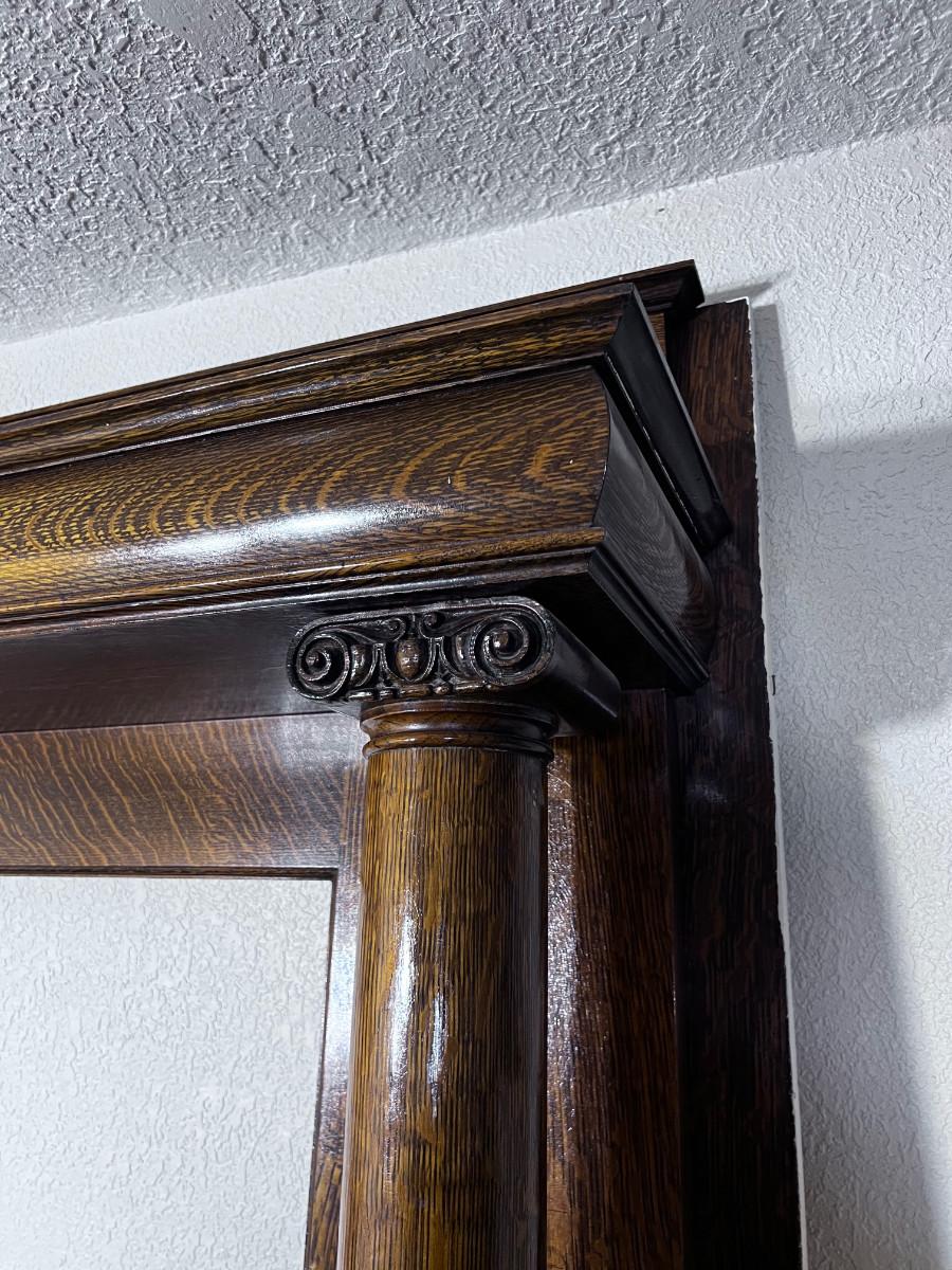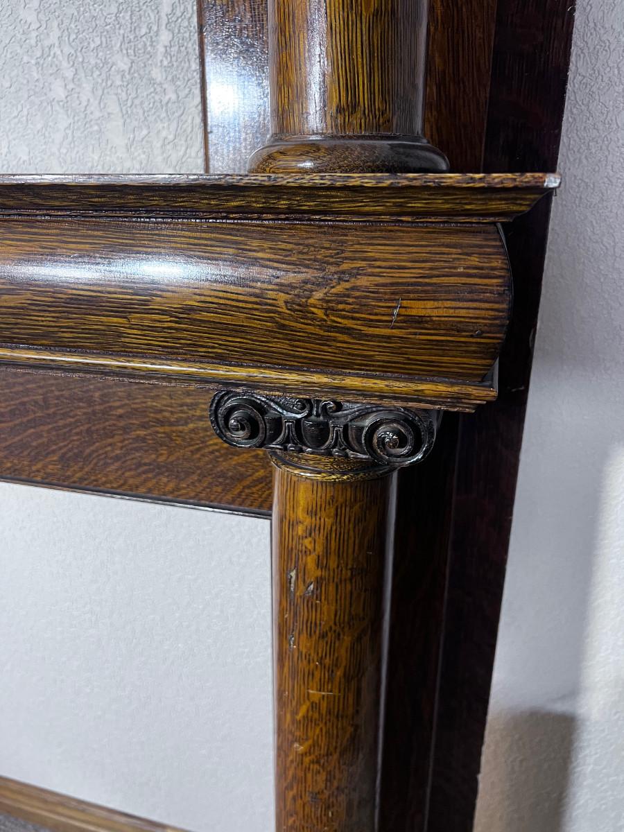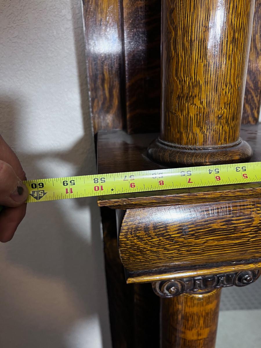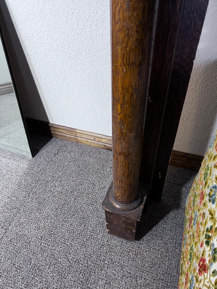 Great old mantle looks like original finish, Beveled mirror included.Please bring loading help. 58" wide, 83" tall, 51" to top of mantle piece.