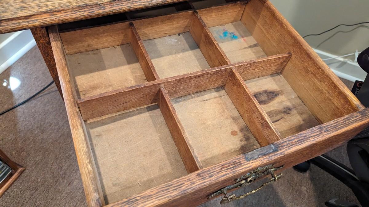 Top drawer has interesting sections built in to keep stuff organized!