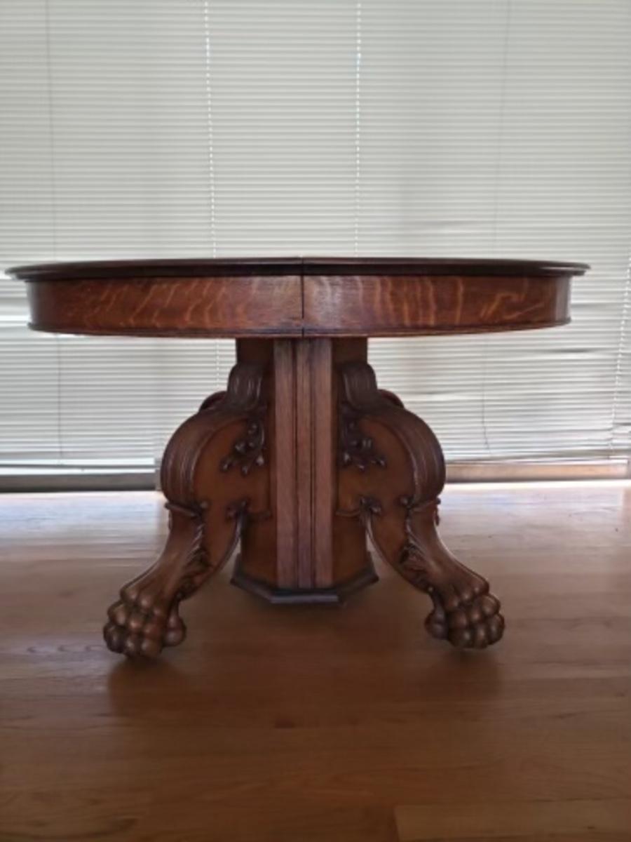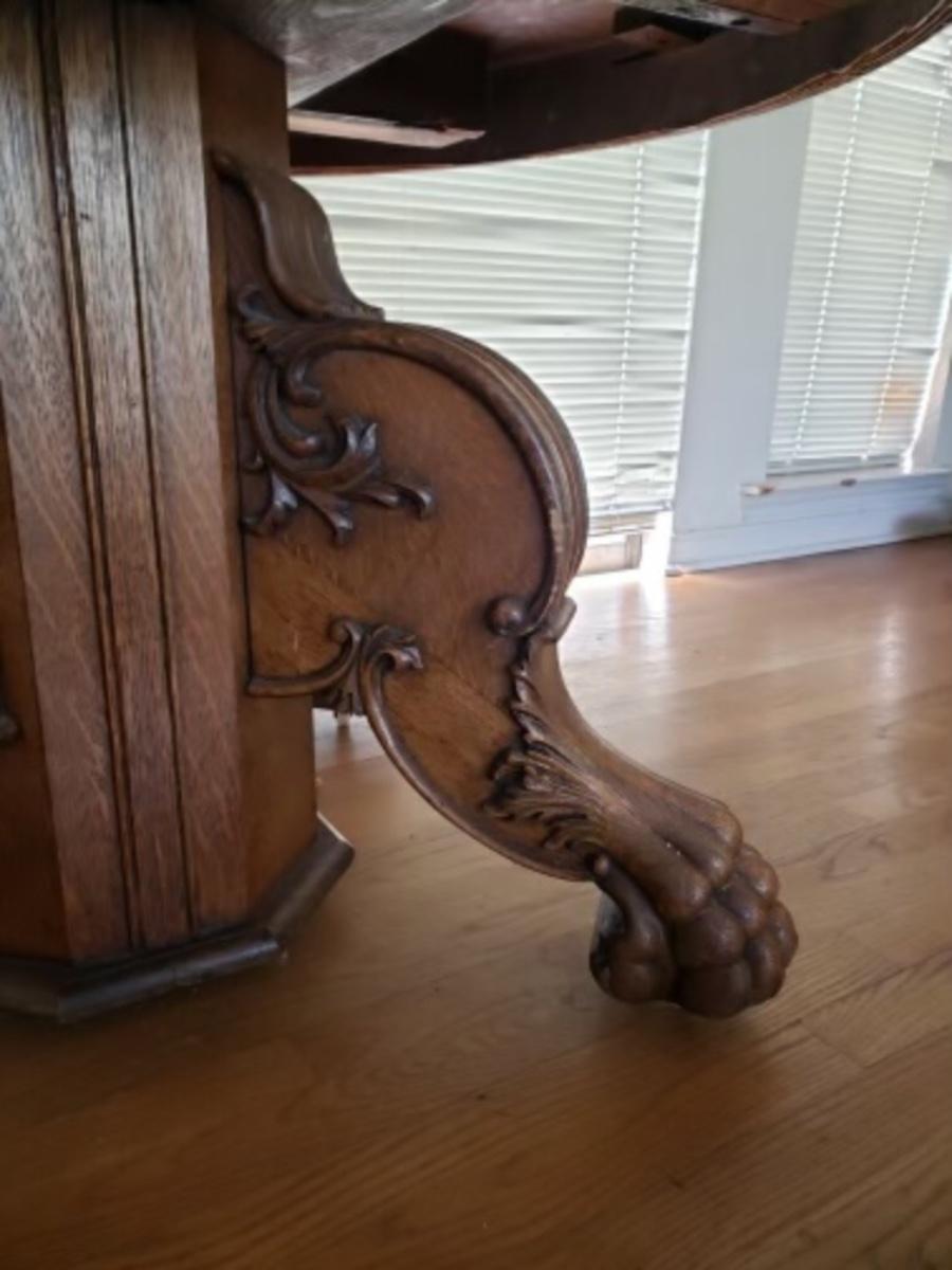 Antique oak pedestal dining table with large carved lion paw feet, 2 leaves
