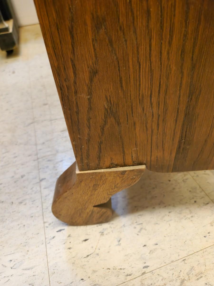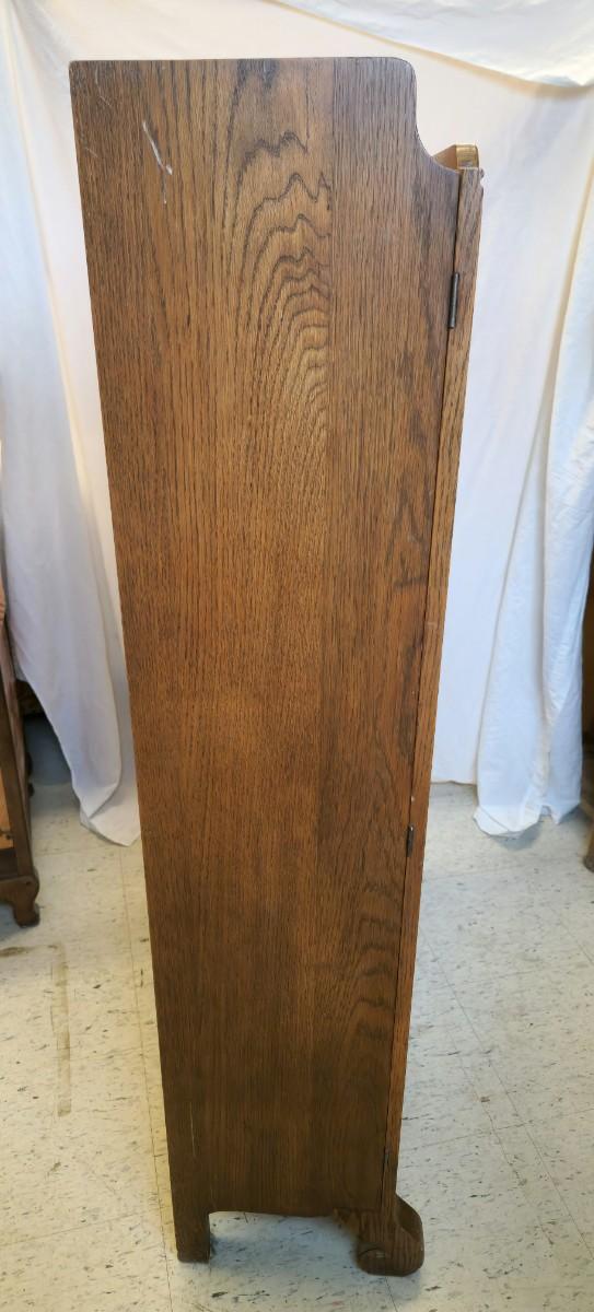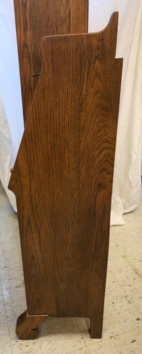 Please note the repair to the leg. This side by side has oak shelves in the curio side and the glass is original. The guts of the desk side have been removed.35"x14.5"x58" (curio) and 46.5" (desk)